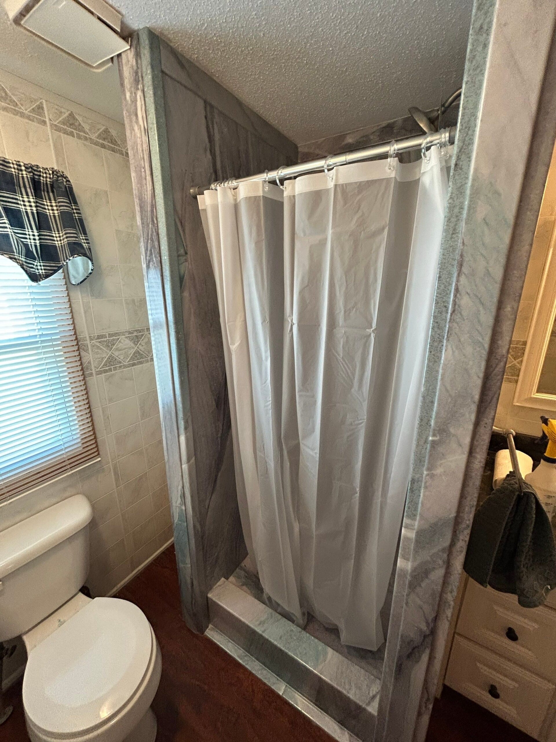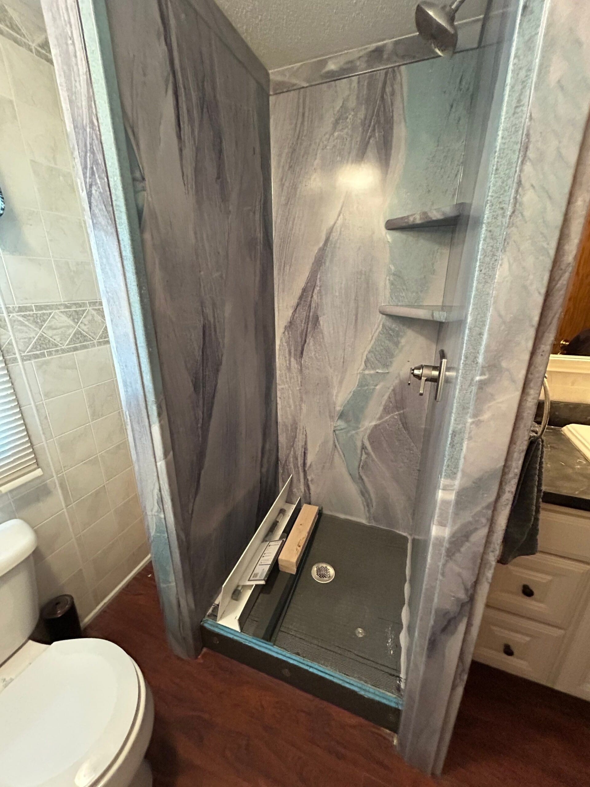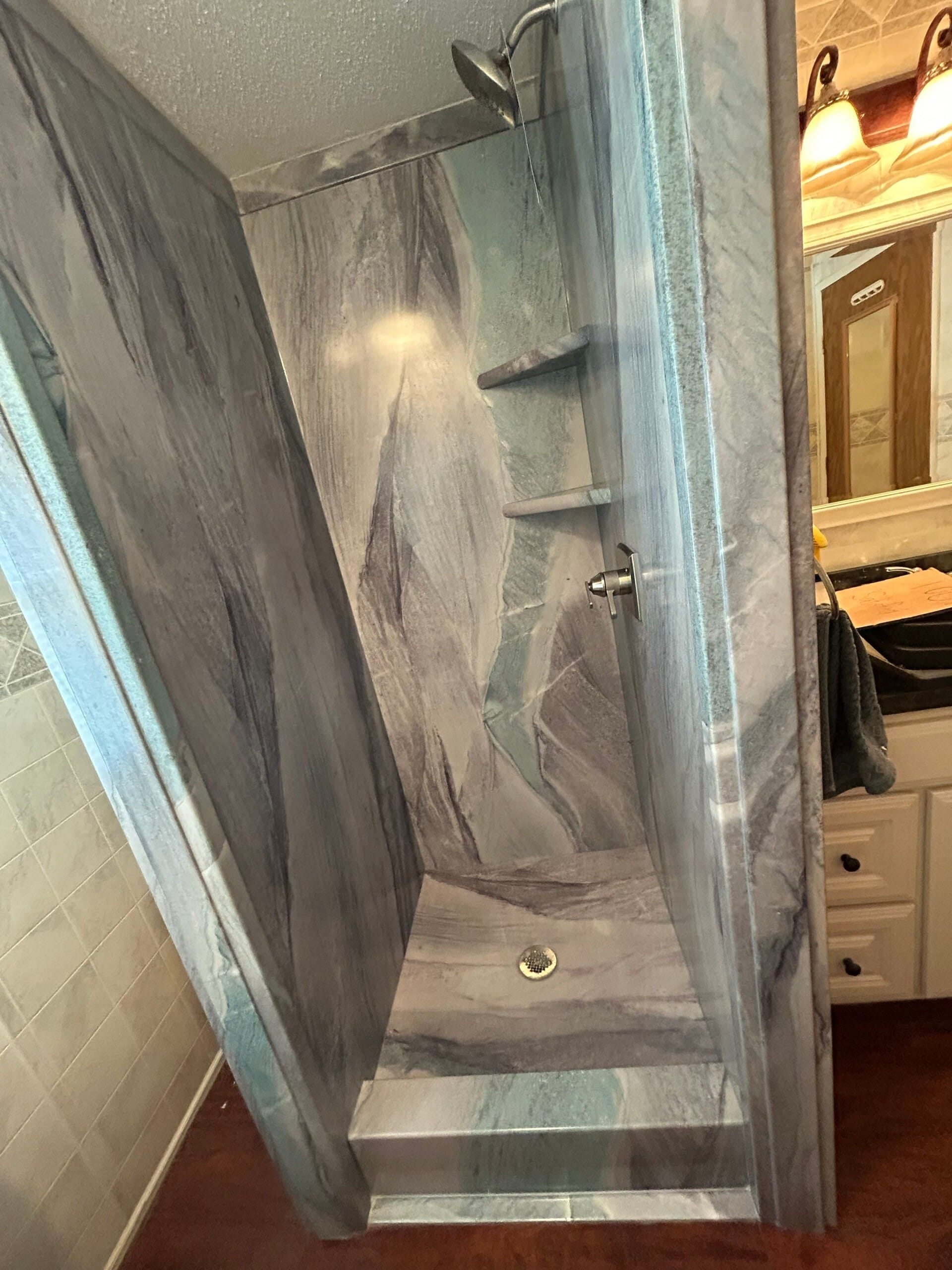 The final installation features a frameless open-entry layout with a low-threshold base and full-height wall panels finished in a multitone stone-look composite. The Smart Choice wall system includes smooth composite surfaces with dynamic gray veining in a matte finish. A brushed Delta rain showerhead was installed overhead, and a pair of integrated corner shelves provide functional storage. A liner and curtain were added to complete the open look and keep water contained.