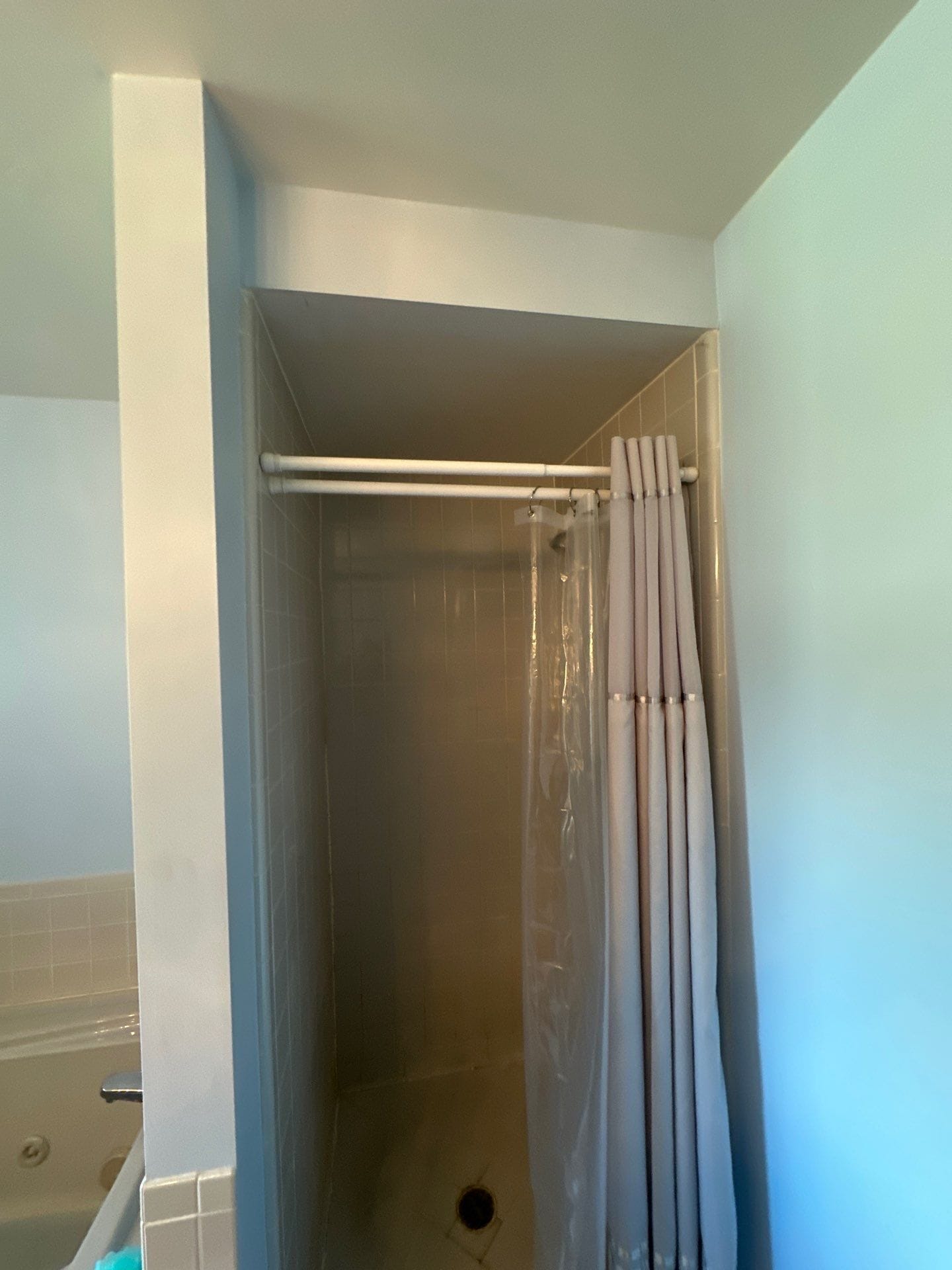 Installation was designed as a two-day process. Demolition exposed the studs and allowed for leak inspection and structural repairs prior to rebuild. The team installed cement-based fiberglass backer board, applied waterproof adhesives, and secured full-height wall panels that reached a nine-foot ceiling. A solid fold-down bench, custom-fitted recessed niche, and reinforced grab bars were positioned to support balance and ease of access. The original footprint remained enclosed, but the interior was expanded for greater depth and function.
