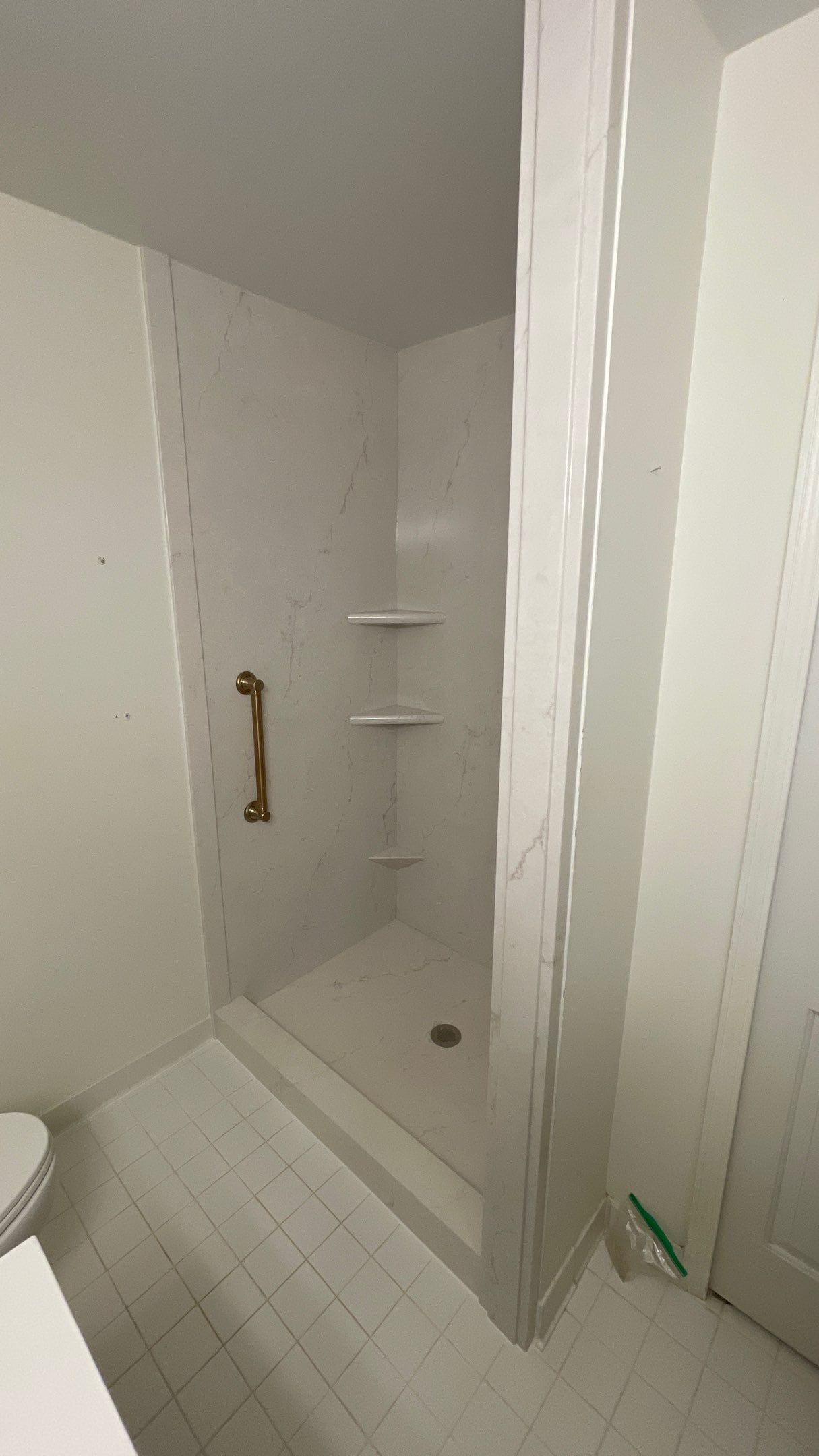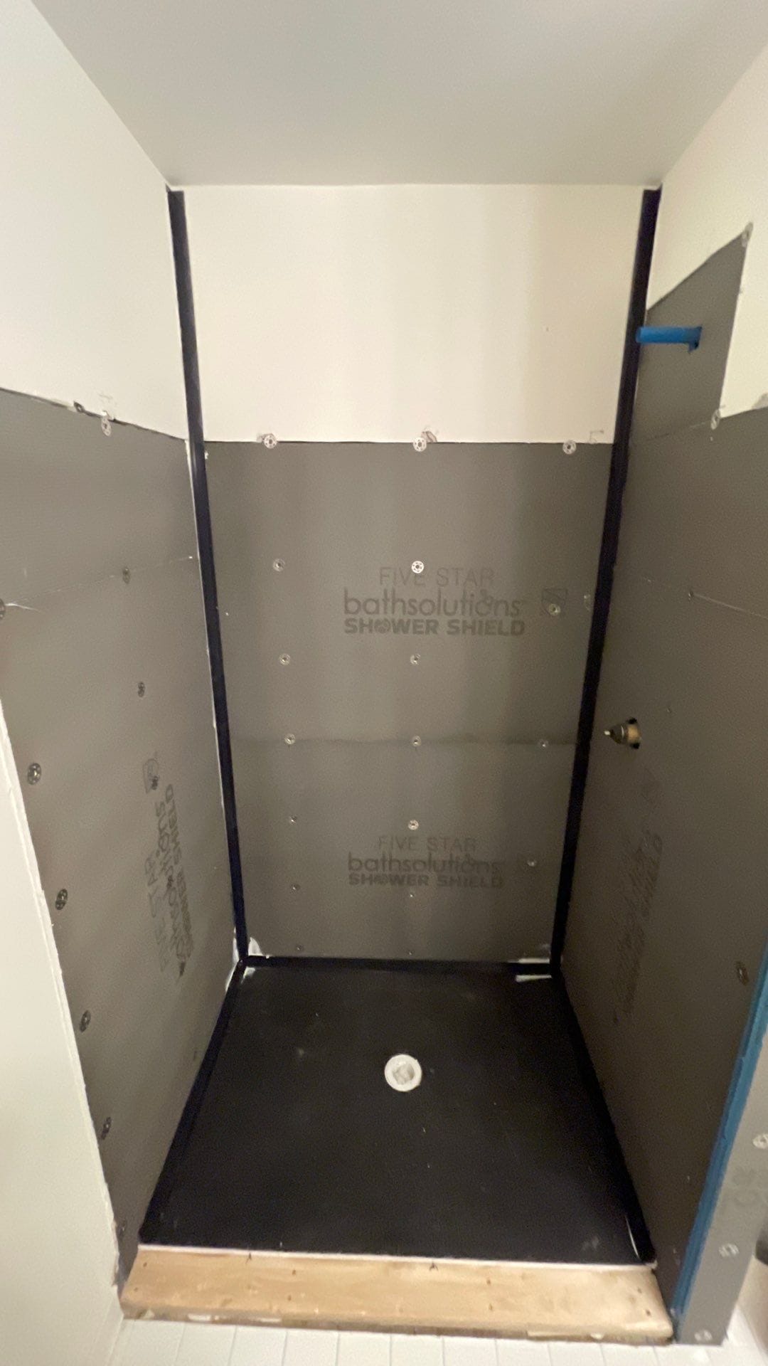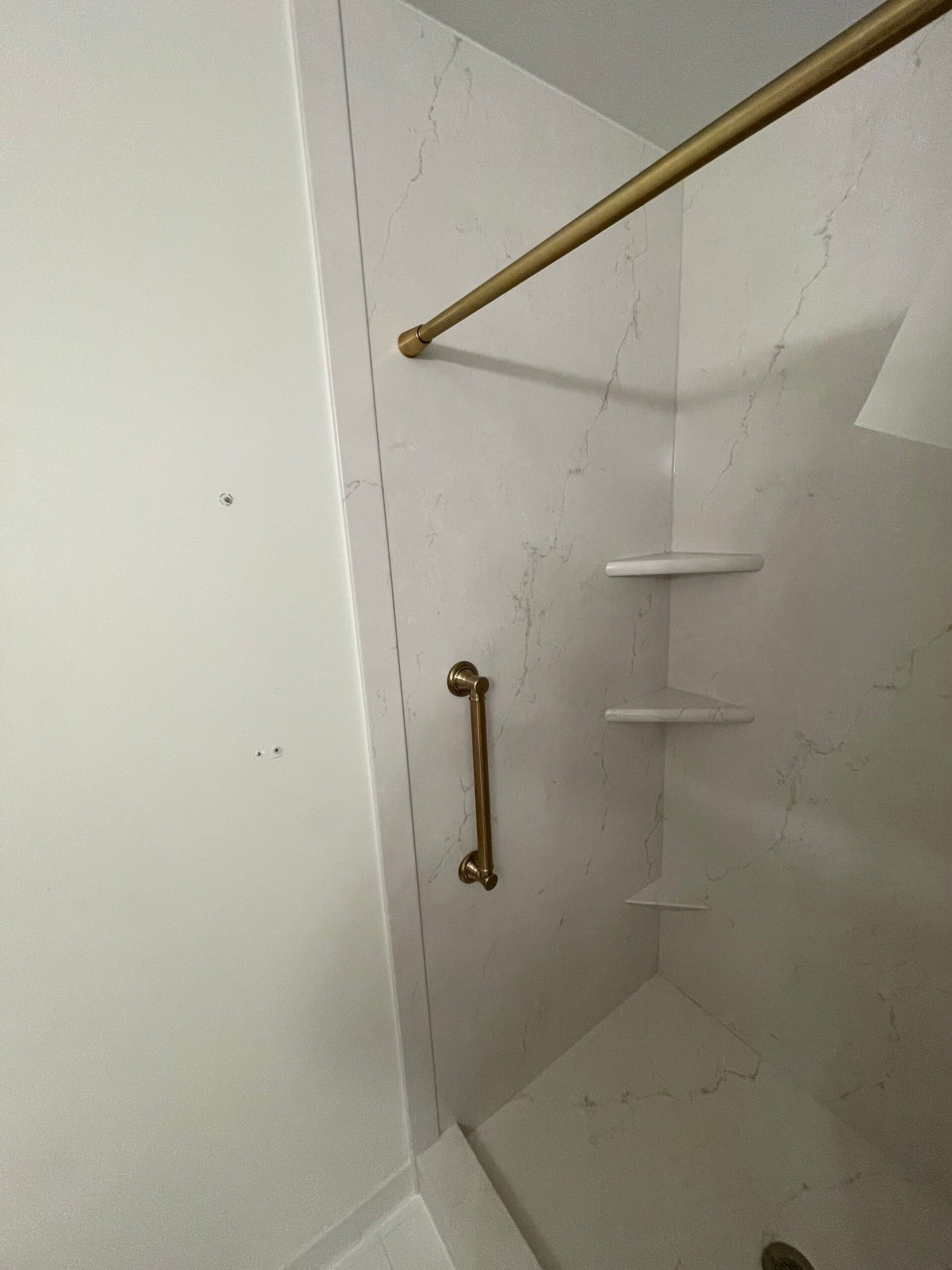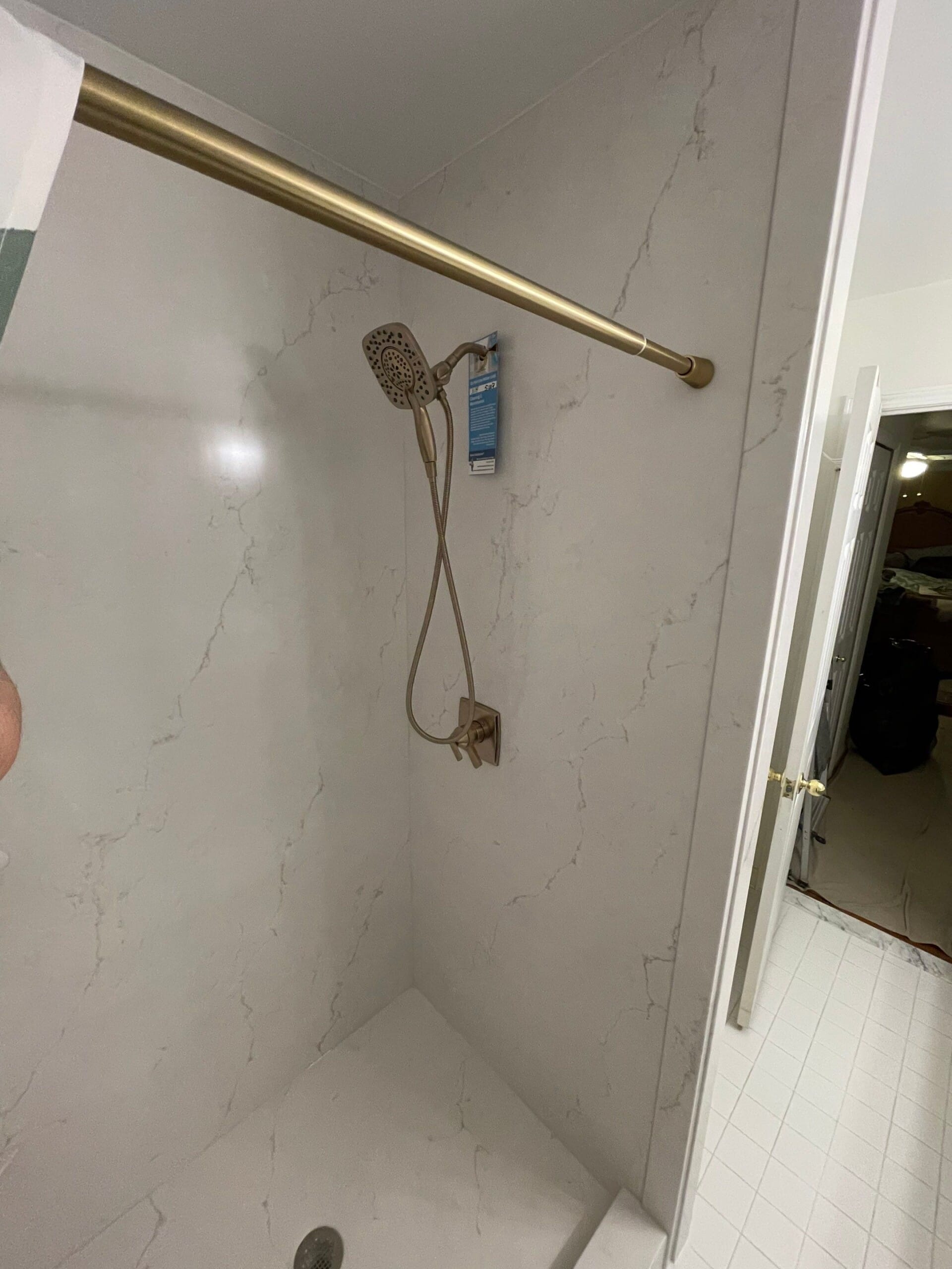 Installation involved full removal of the existing shower materials down to the subfloor, followed by inspection and preparation of the space. A new low-entry shower base replaced the previous high curb, significantly improving accessibility. Waterproof backer systems were installed prior to the wall panels, followed by fixture placement, shelving, and safety features. The process was completed within a two-day installation timeframe, with site protection measures and cleanup performed throughout the project.