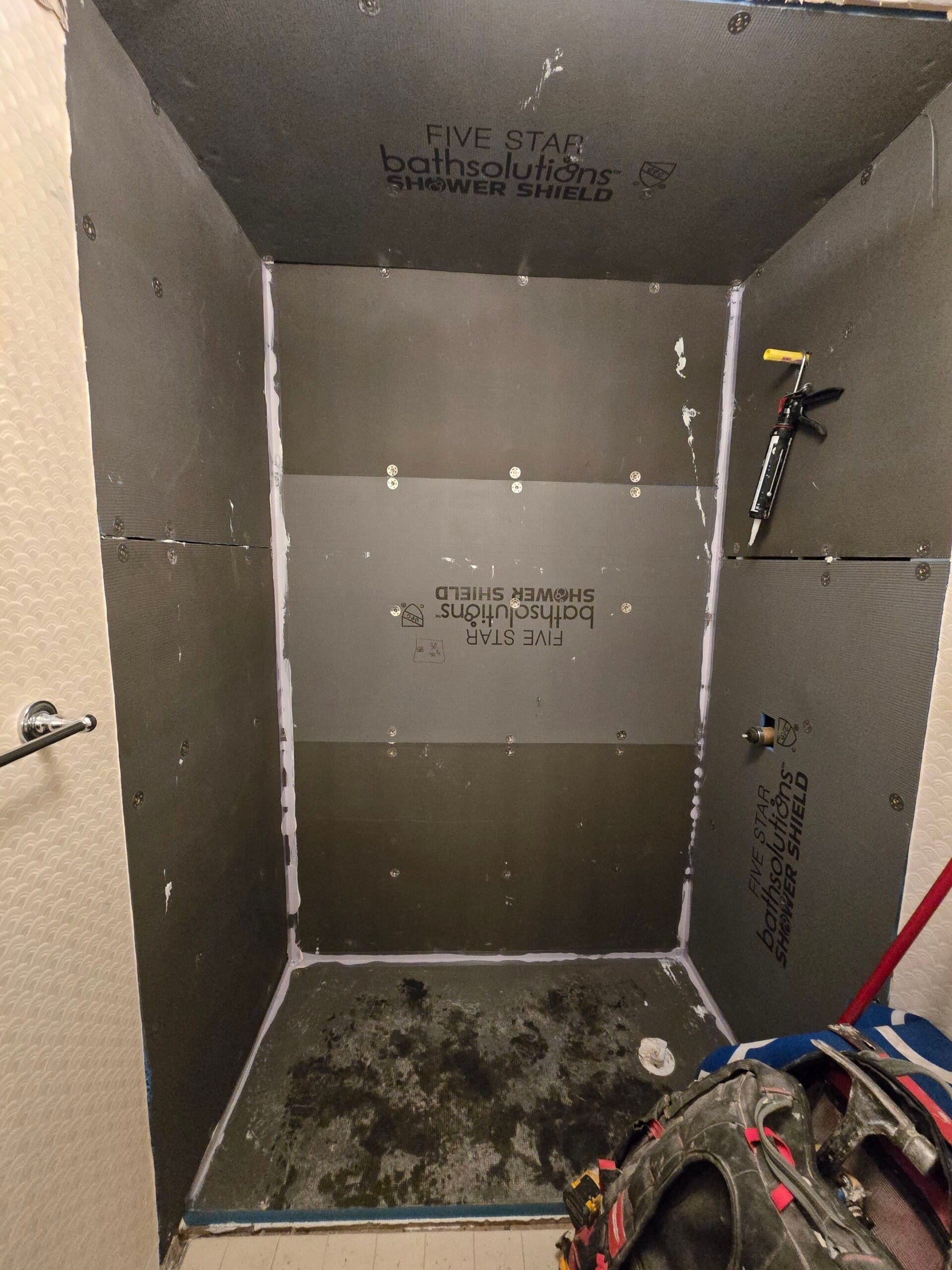 Installation involved removing the existing bathtub and walls down to the studs. The team installed a waterproof backer system followed by floor-to-ceiling composite panels, including a matching ceiling panel. The updated configuration includes a low-profile shower base, a sliding glass door with a modern track assembly, a recessed shelving niche, and a fold-down teak bench. Final touches included mounting a handheld shower system and secure grab bars.