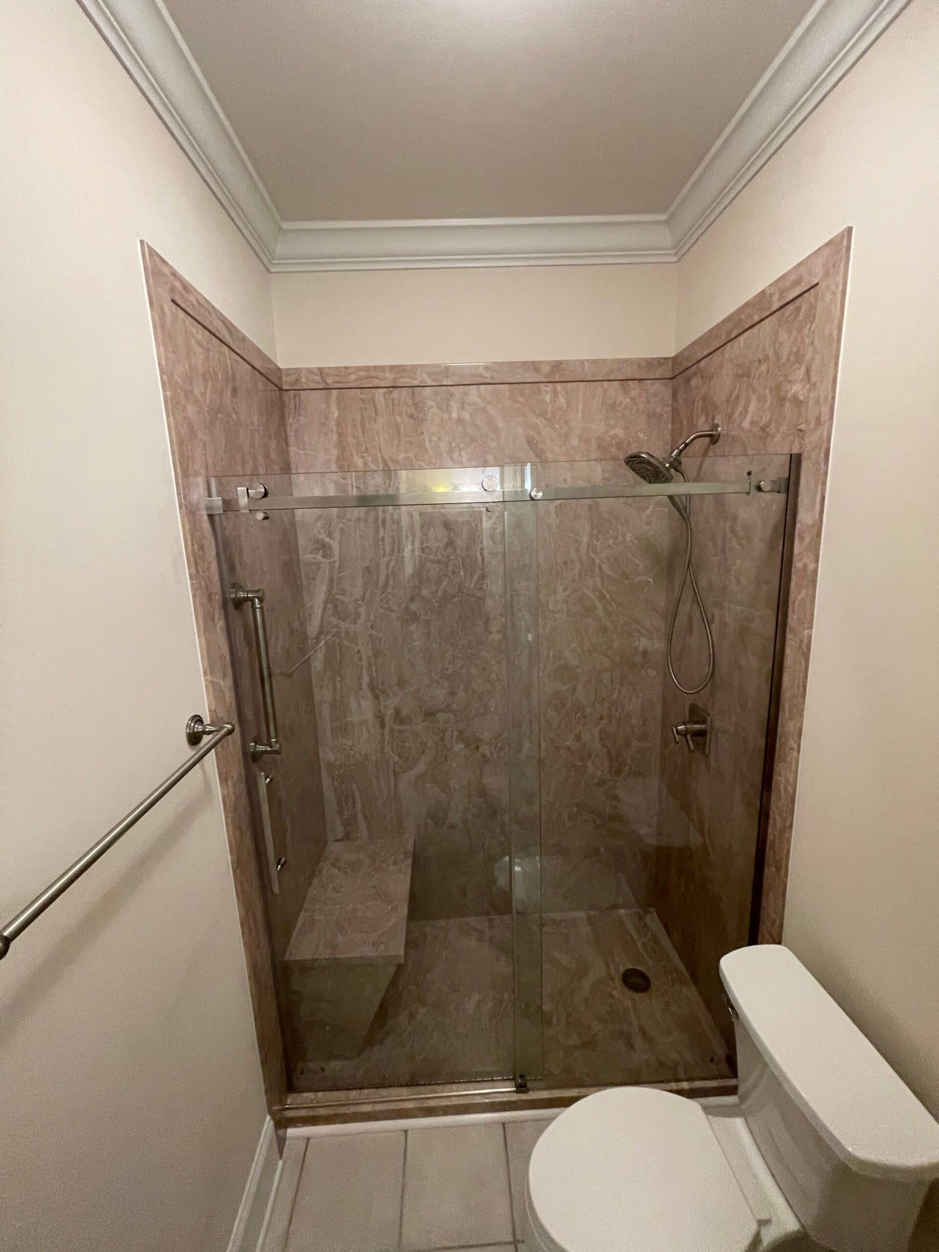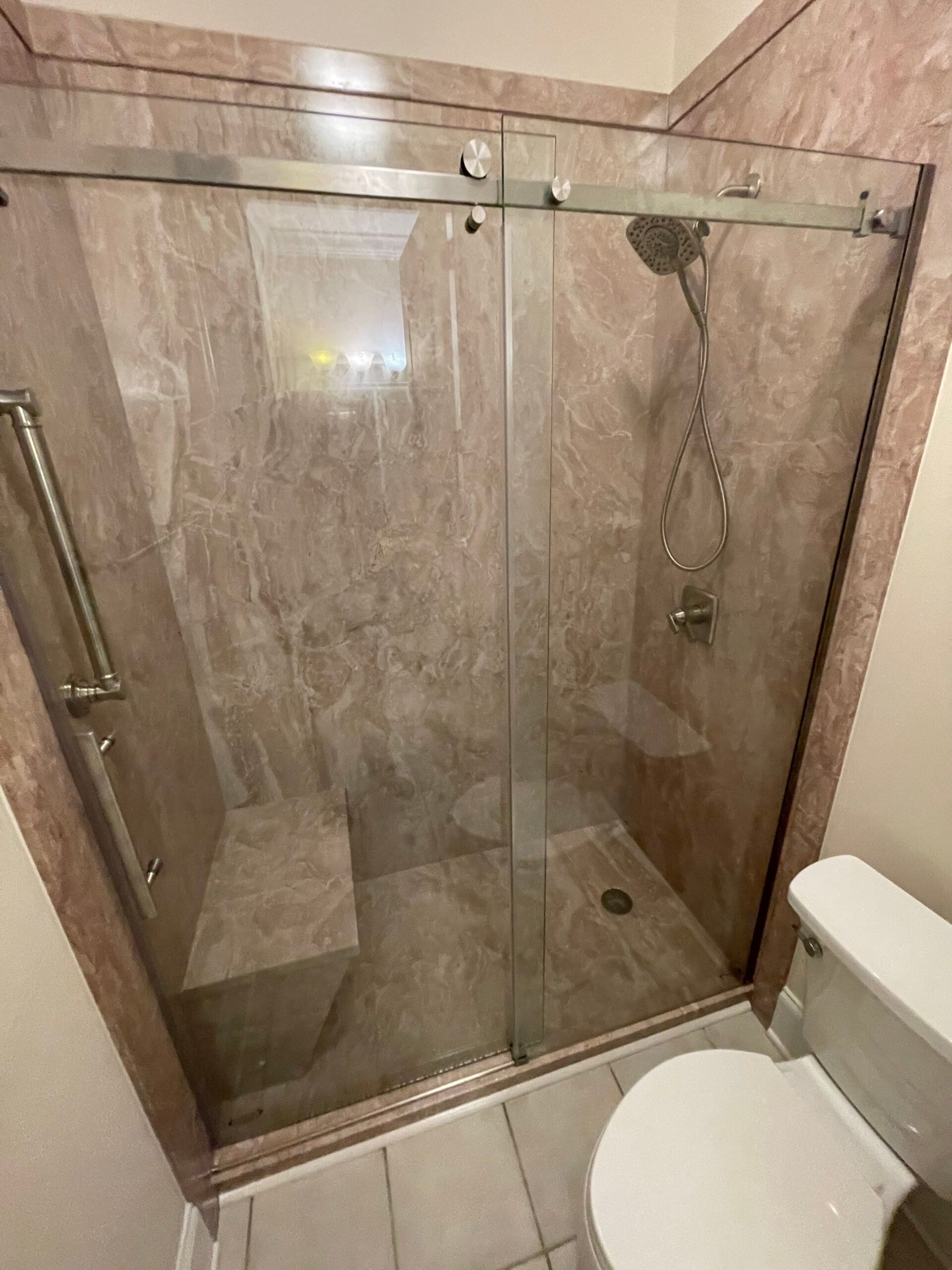 The Representative from Five Star Bath Solutions presented a grout-free composite wall system designed for durability, low maintenance, and long-term performance. The finished shower features large-format marble-pattern wall panels in a warm neutral tone, paired with a coordinated low-threshold shower base for safer entry. Brushed nickel fixtures were installed, including a handheld shower system, along with a sliding glass door enclosure that enhances accessibility while maintaining water containment. The company’s bathroom-specific expertise and structured approach reinforced confidence in delivering a safe and functional upgrade.
