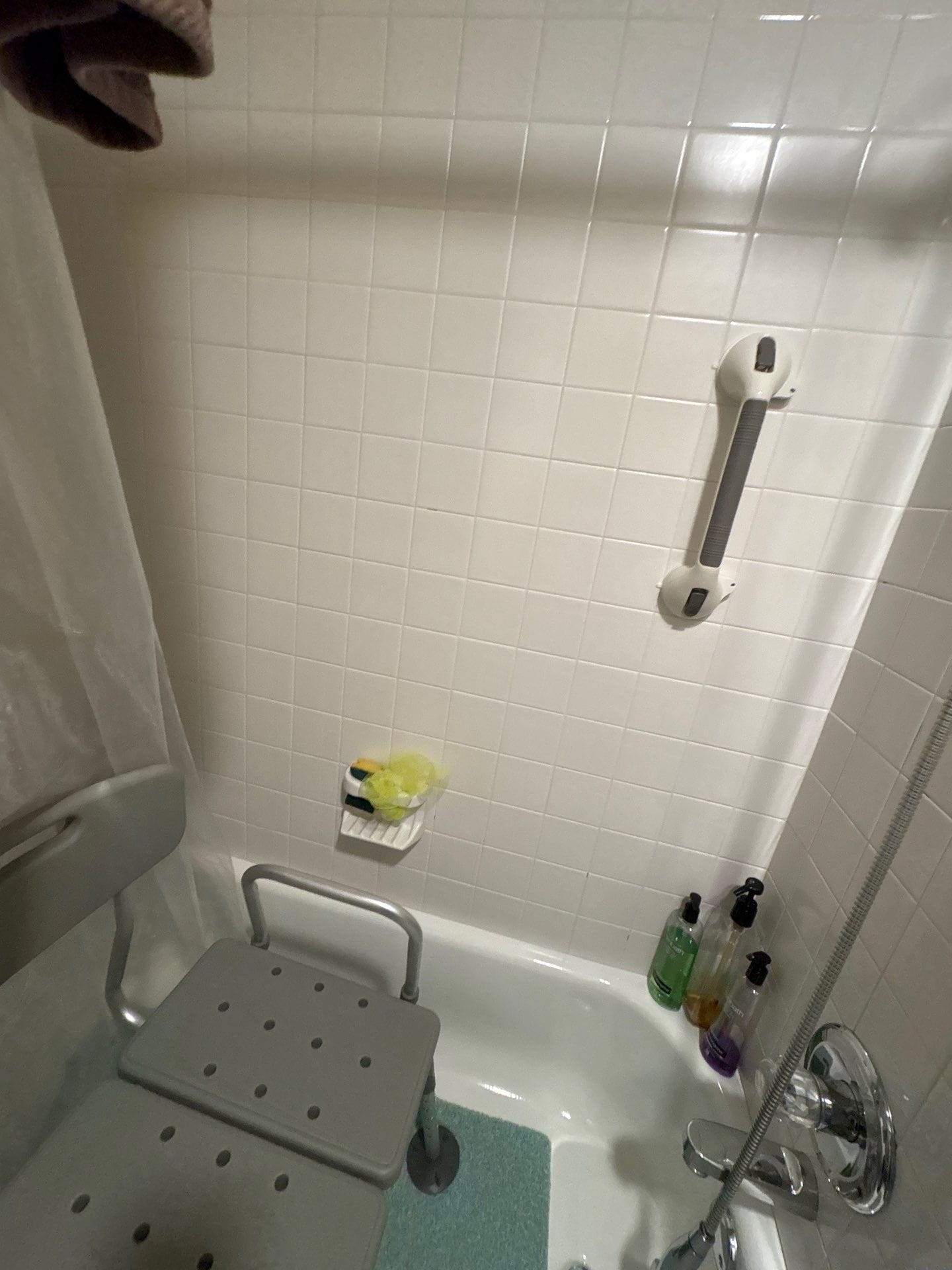* Three grab bars, four shelves, non-slip antimicrobial floor pan