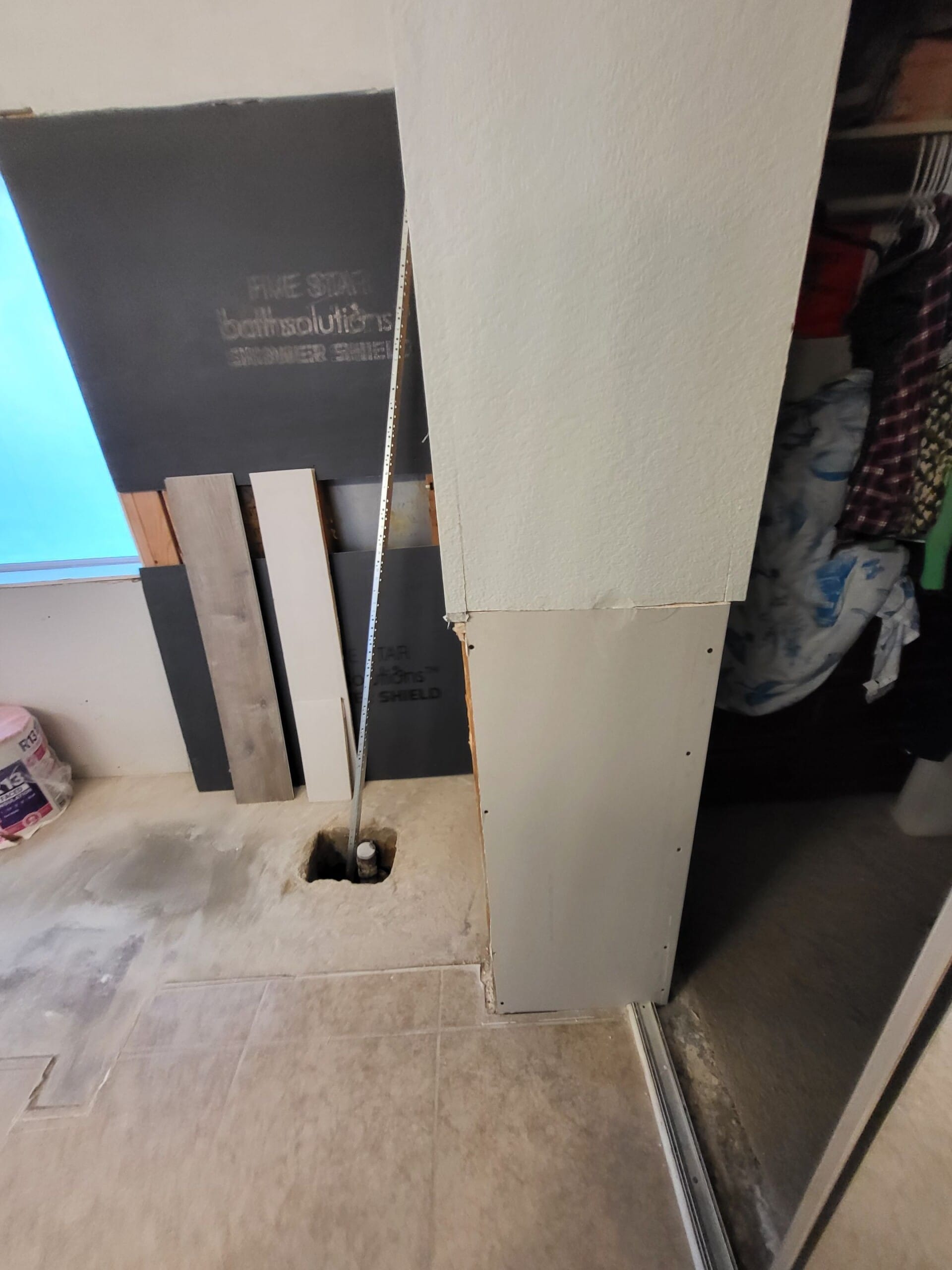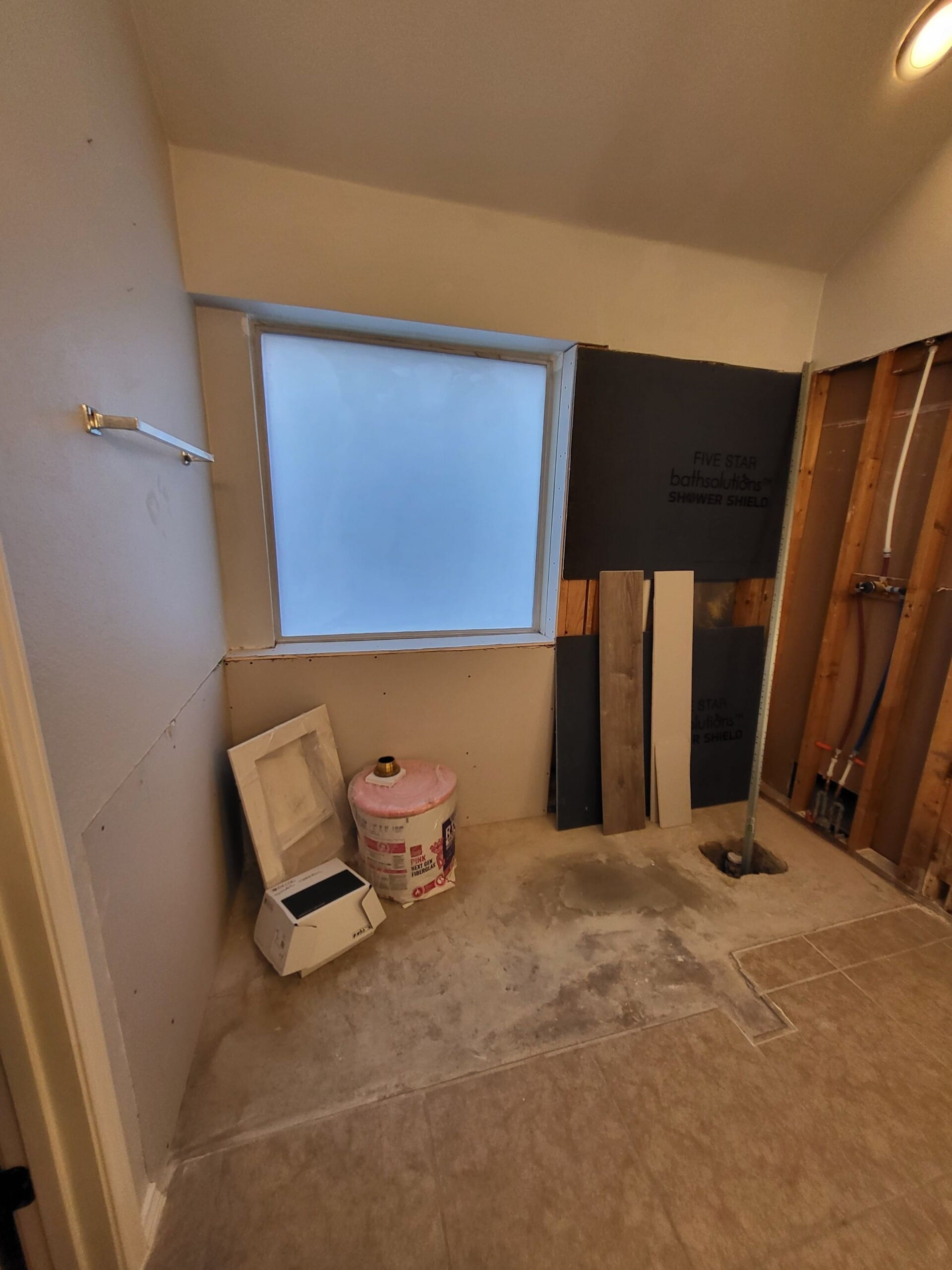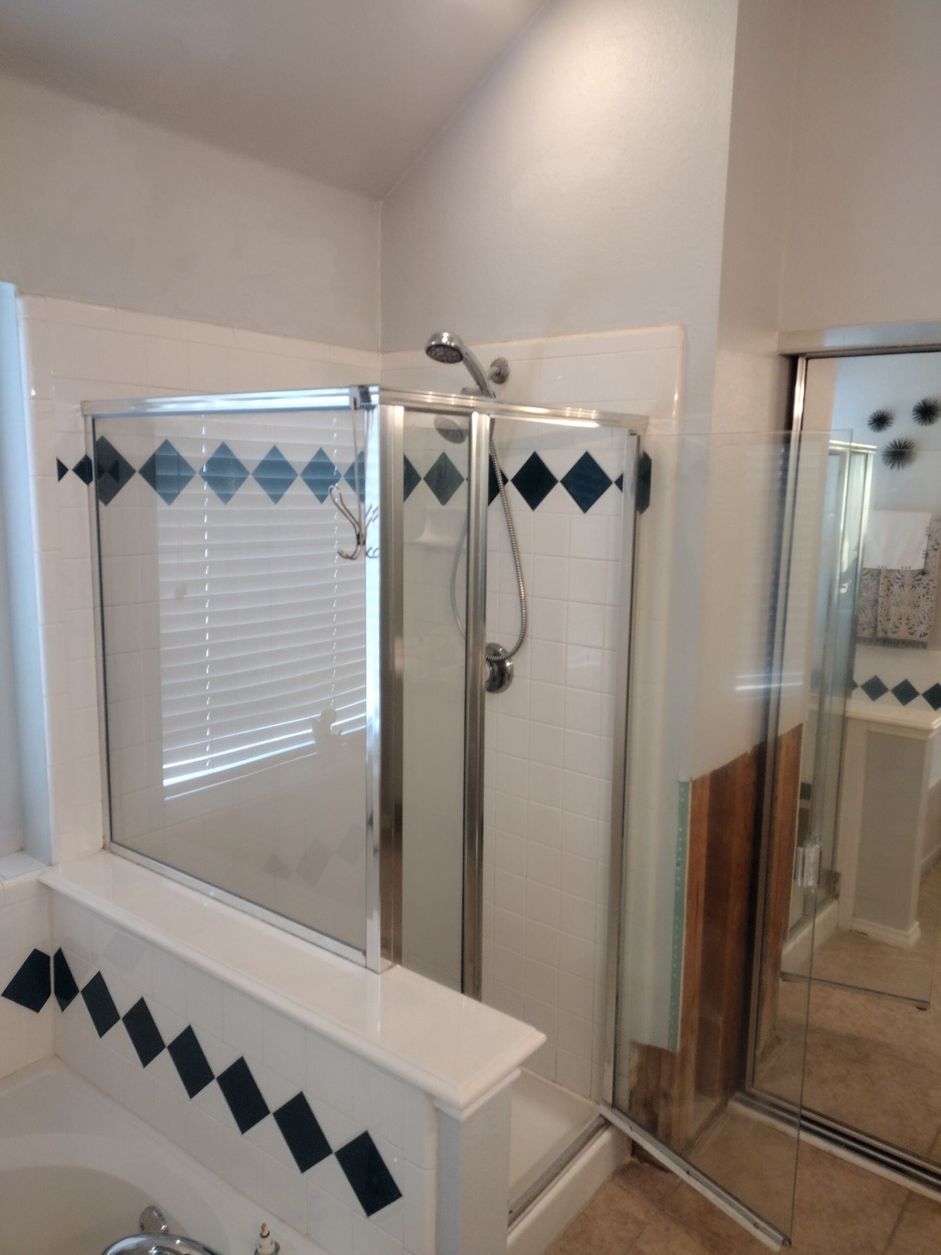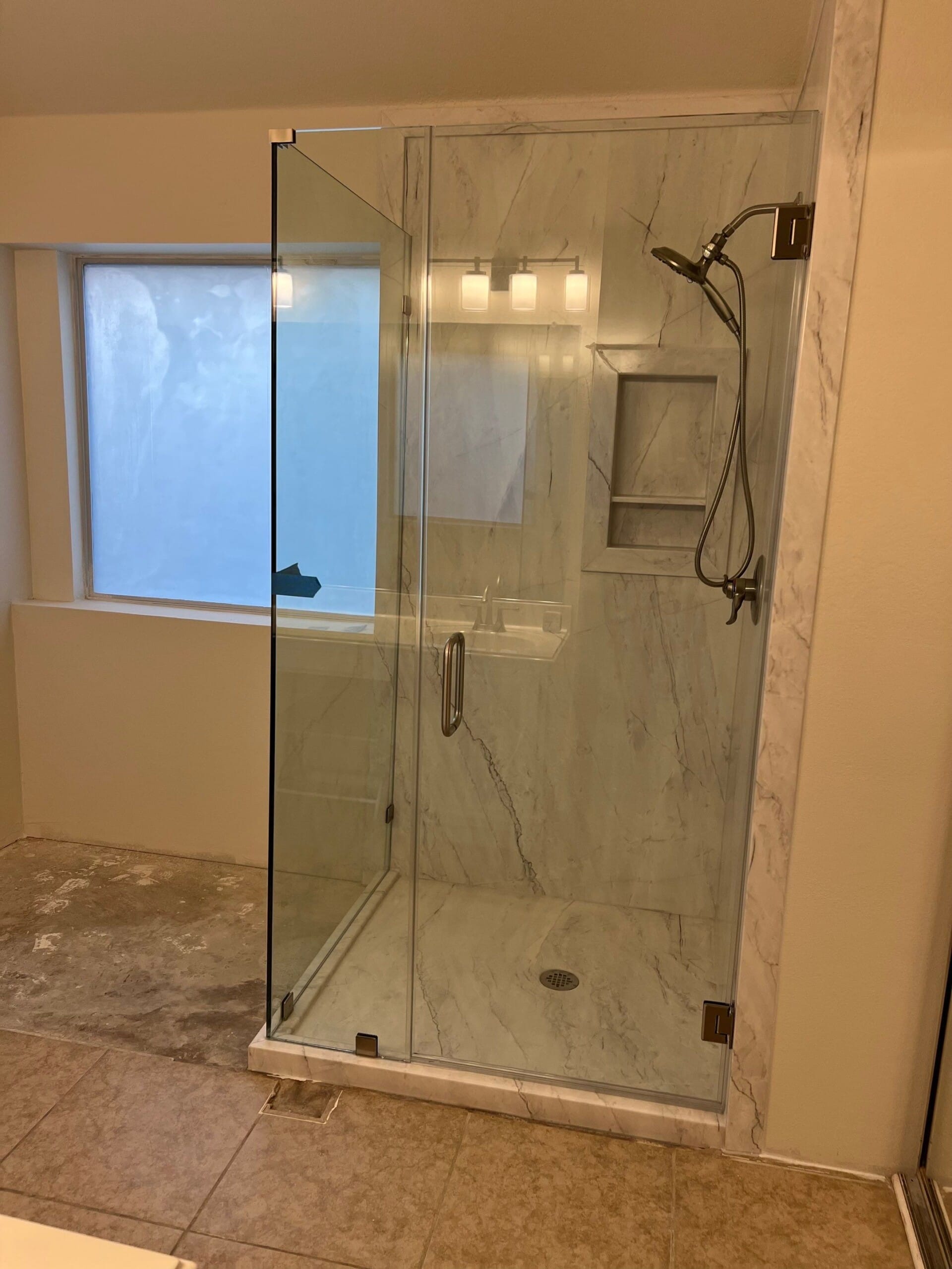 The original shower featured white square tiles with a diamond accent band and a framed glass door. The fiberglass base showed wear and the corner structure limited usable space. Photos confirm water damage near the floor and exposed framing at the time of removal. The upgraded layout replaced the tile system with full-height, marble-style composite panels and expanded the glass enclosure across two sides for better lighting and visual openness. Chrome Delta Ashlyn fixtures were installed along with a built-in niche, a bench, and grab bars for added comfort and function.