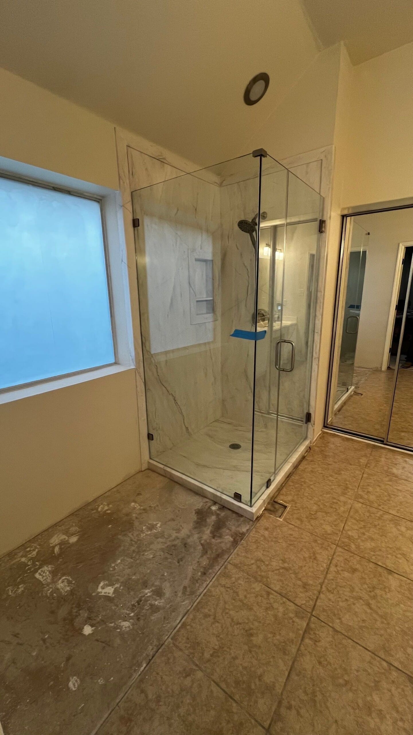 Installation was completed in two to three days, including full demolition of the original unit, wallboard inspection, and rebuilding with moisture-safe materials. Floor protection and dust containment were applied throughout. A final walkthrough was conducted by the senior installer to confirm all fixtures, trims, and panels were correctly sealed and finished. The frameless glass door and chrome handles aligned with the customer's request for a sleek, open look.