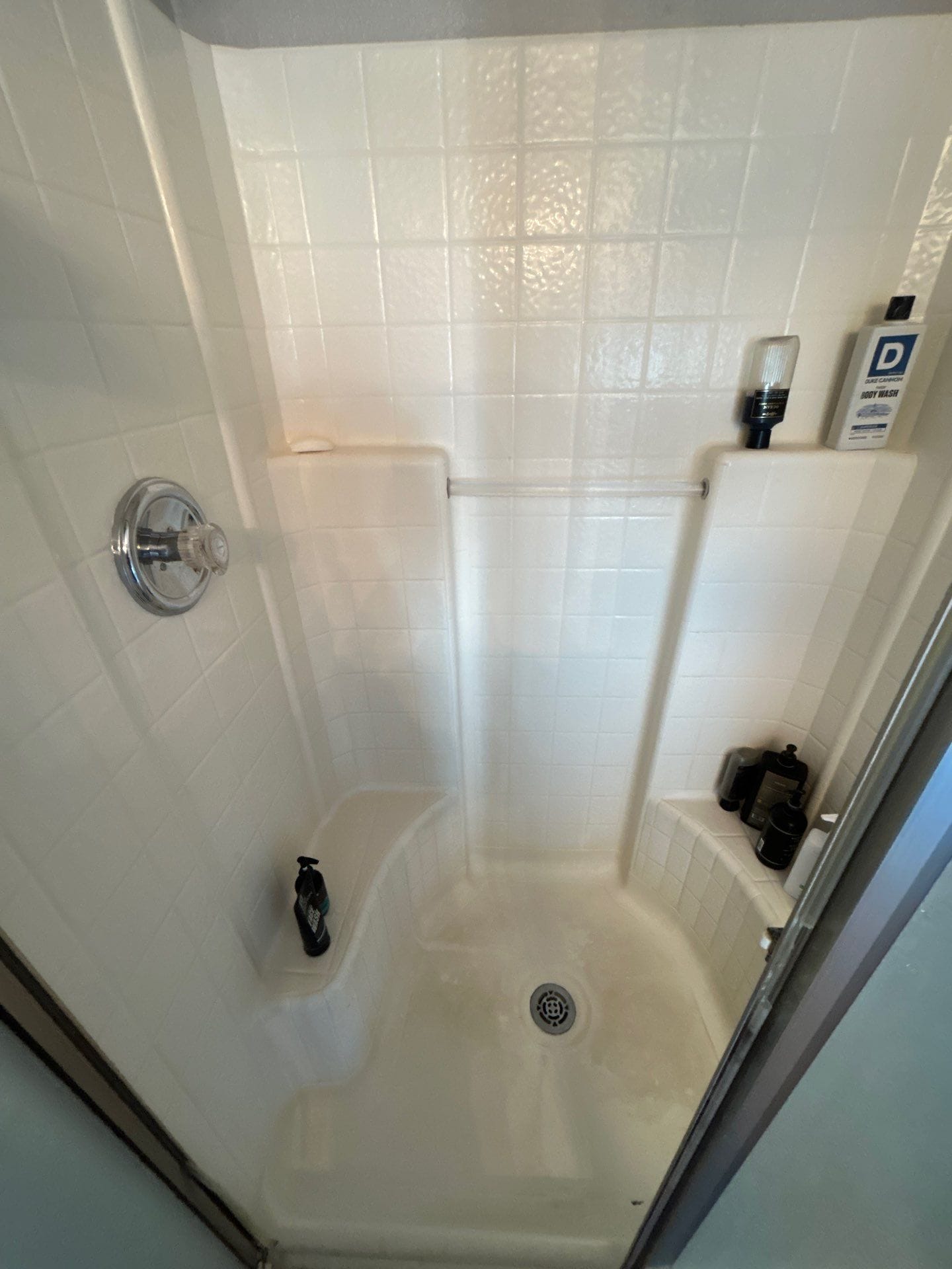 * Low-threshold white shower base with center drain