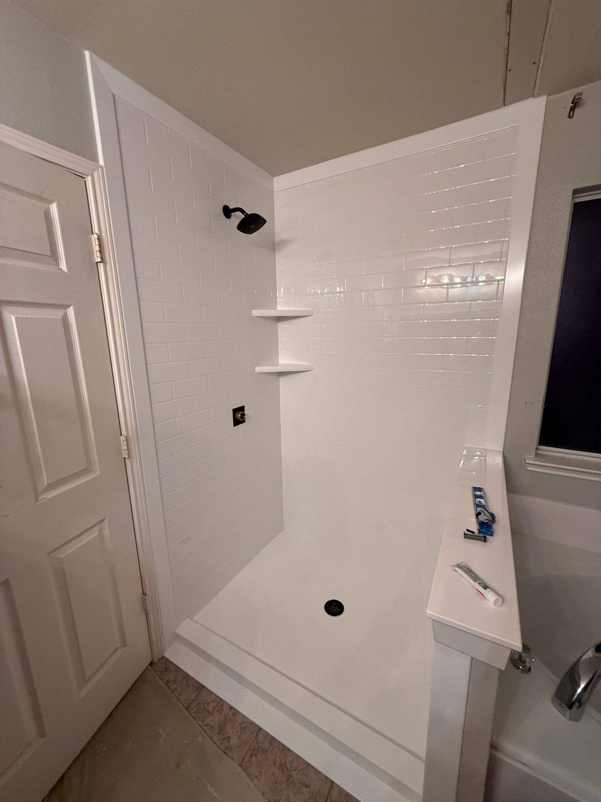 The installation process involved a complete tear-out of the existing shower down to the studs, followed by rebuilding the structure using waterproof backer materials and a newly constructed shower pan. The team protected surrounding areas, removed all damaged components, and ensured proper preparation before installing the new wall panels, fixtures, and base. After the main installation, the custom glass enclosure was measured and installed to fit the updated layout precisely. The process was completed efficiently over several days, resulting in a fully refreshed and functional shower space.