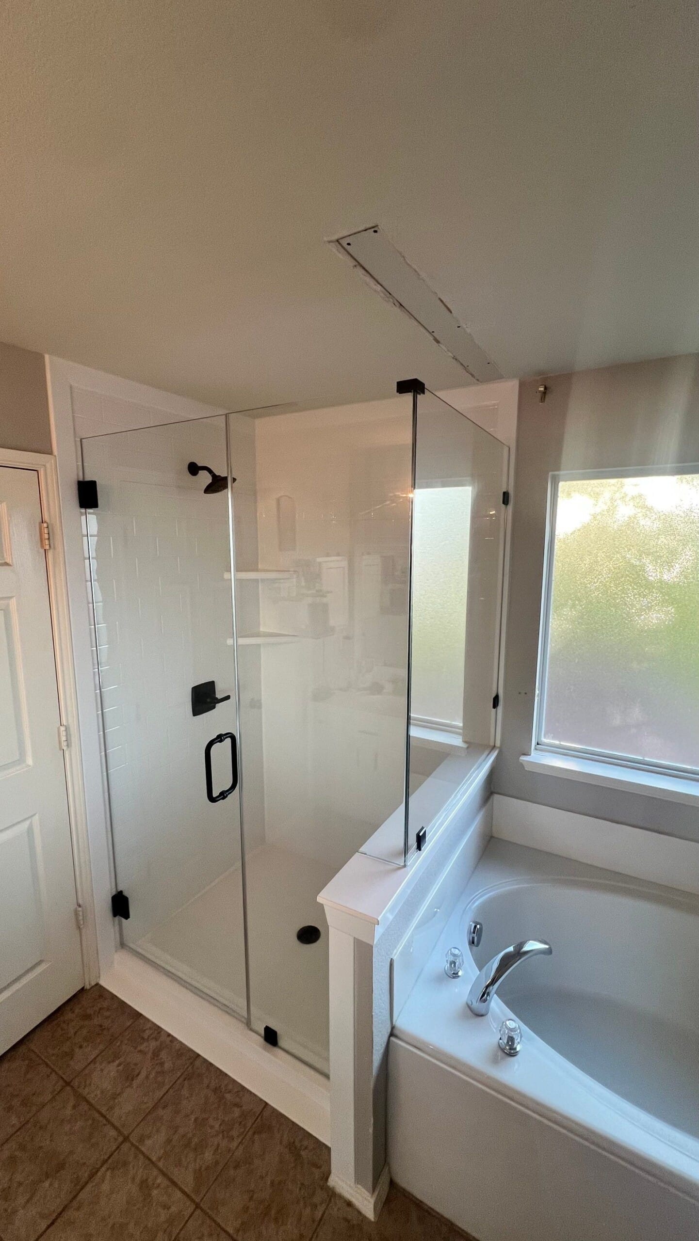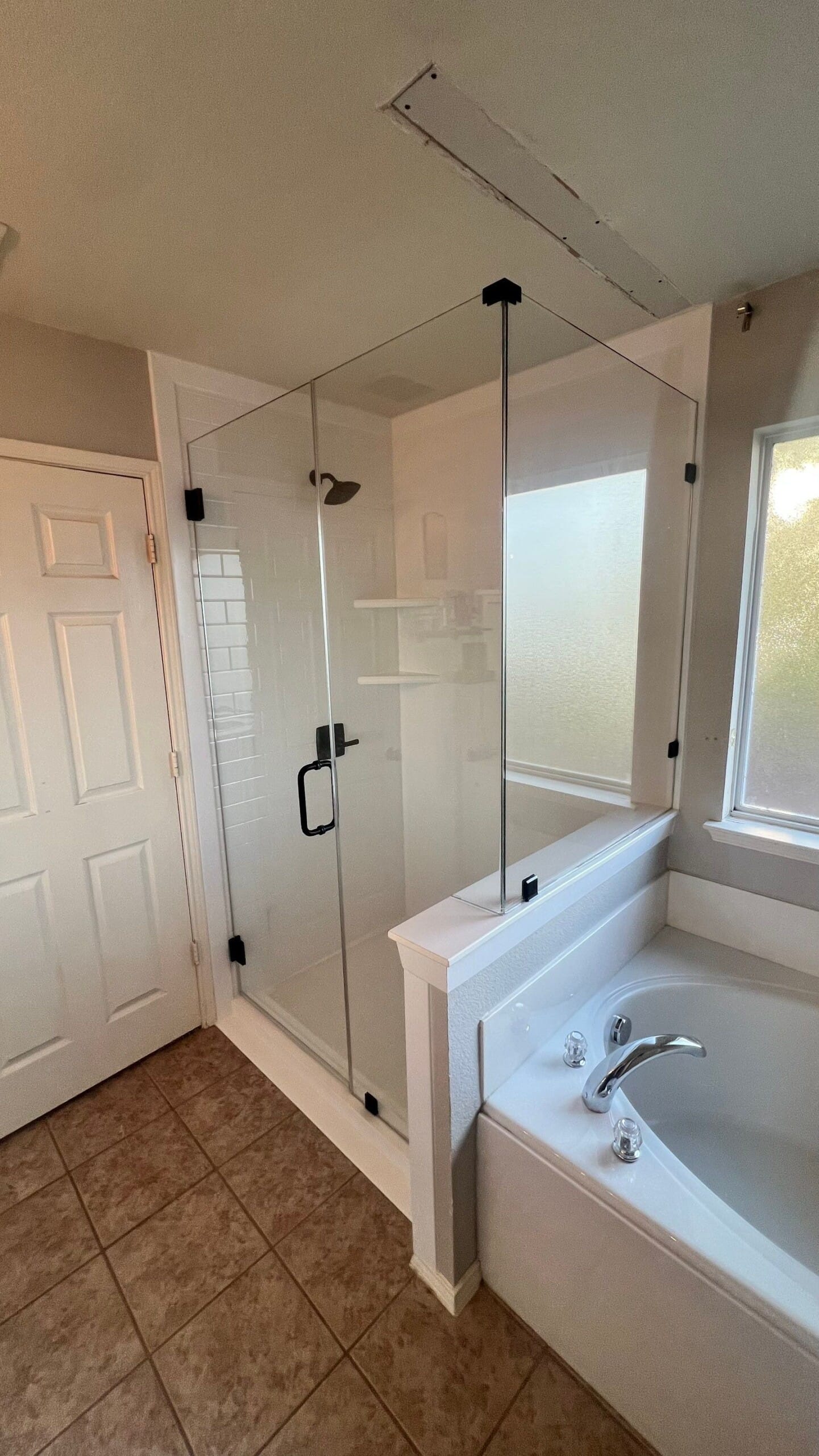* Frameless clear glass shower enclosure with matte black hardware