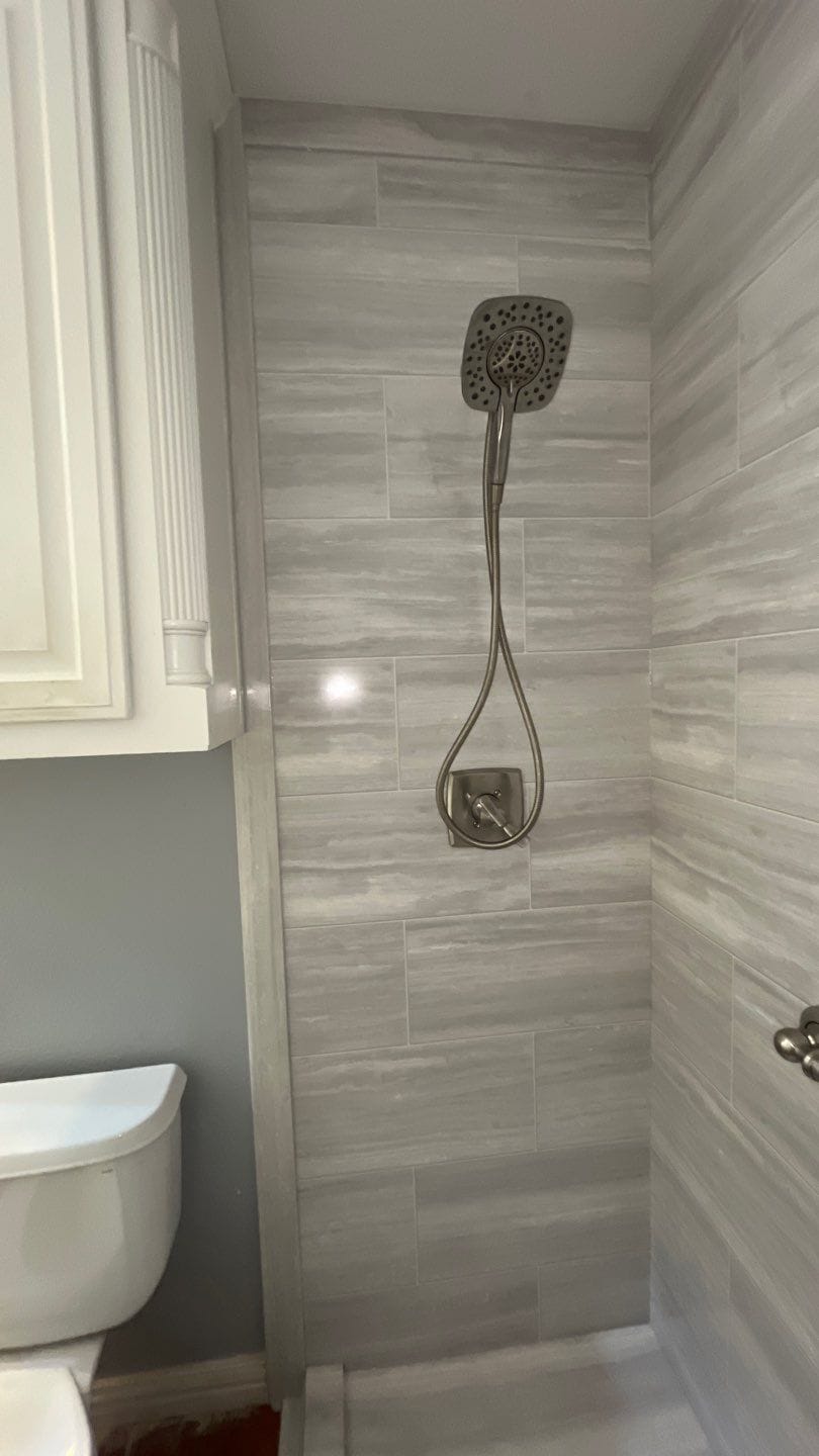 The Representative presented a modern walk-in shower solution using a grout-free composite wall system in a light gray stone pattern, selected for a clean and updated appearance. The new design incorporated matte black fixtures, including the shower system and trim, creating a strong contrast against the lighter wall panels. A clear glass sliding enclosure replaced the previous framed door, opening up the space visually while maintaining functionality. The upgraded system also included a handheld showerhead for flexibility, along with built-in corner shelving and a bench for improved usability and comfort.