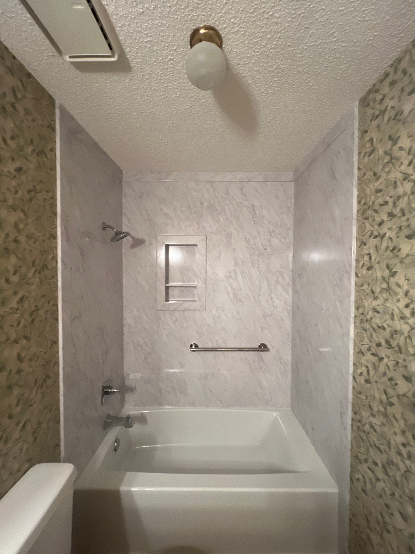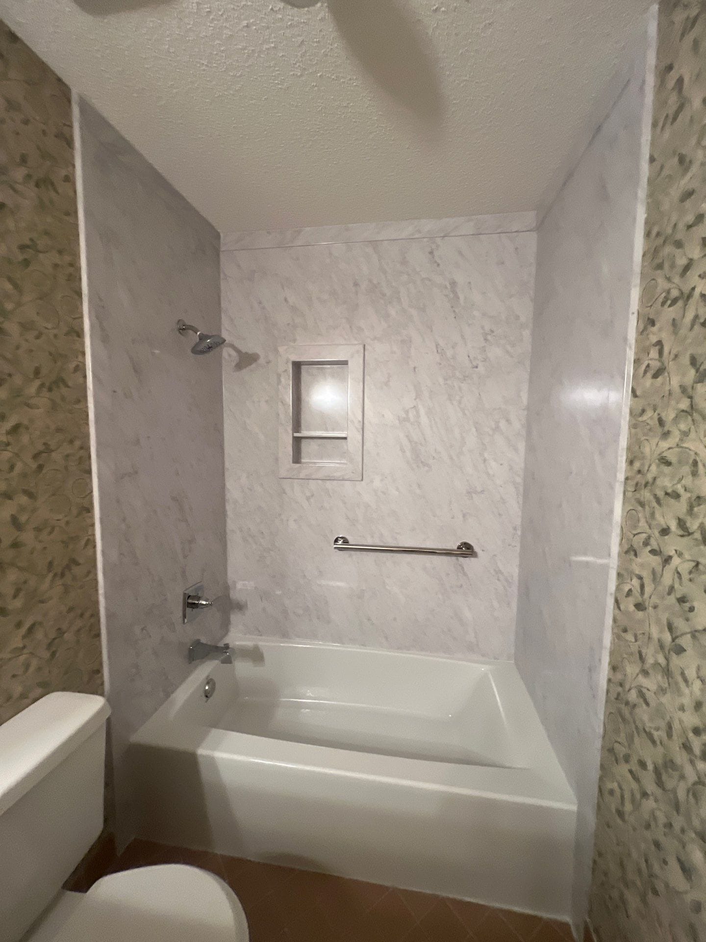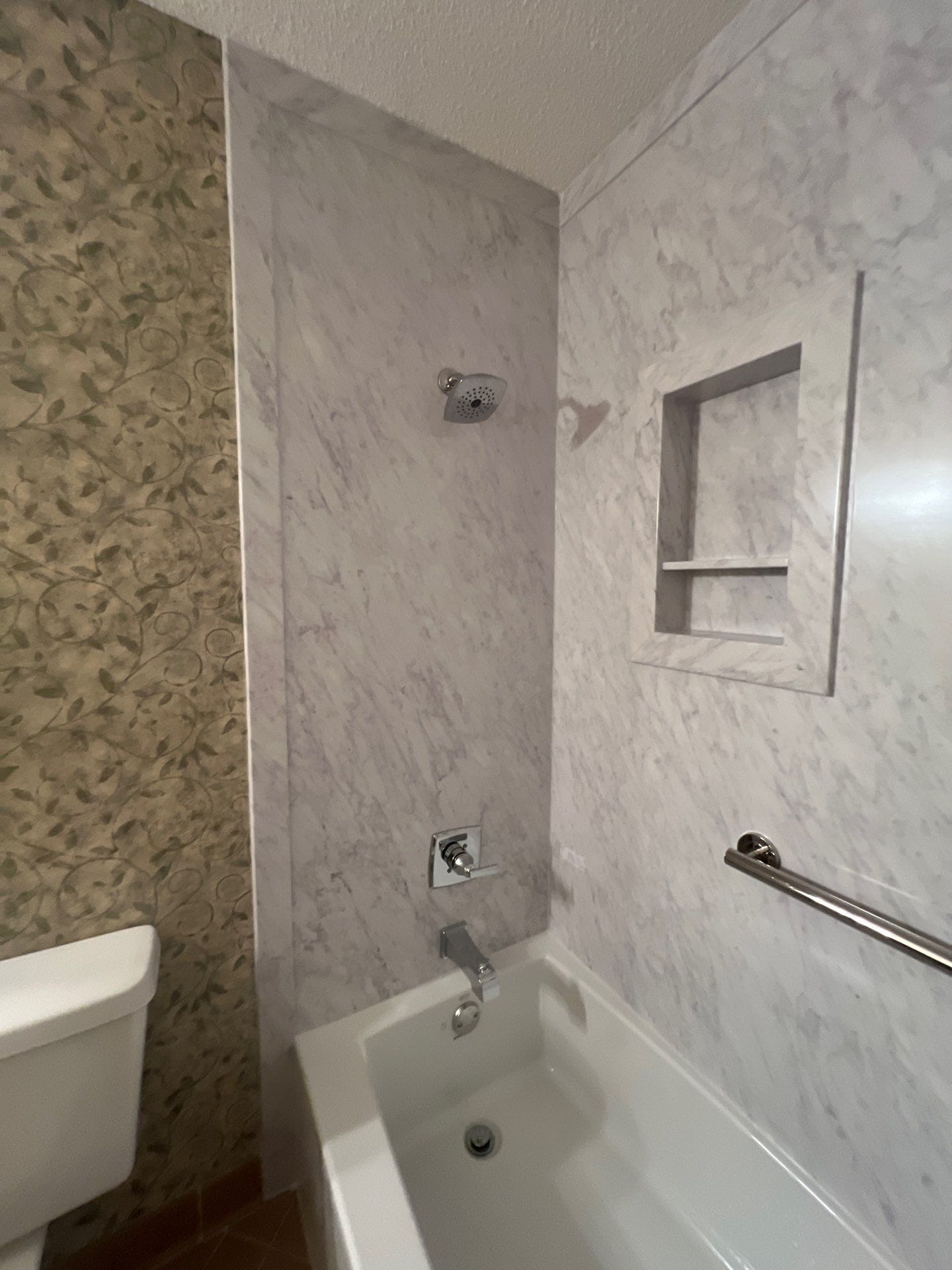 Installation was completed in one to two days by certified Five Star Bath Solutions employees. The team performed full demolition of the existing tub and tile, followed by framing inspection and plumbing upgrades. New Delta commercial-grade plumbing fixtures were installed along with the new acrylic tub and composite wall panels. The grab bar and recessed storage niche were positioned per customer preference. Marine-grade antimicrobial silicone was used at all seams, replacing standard caulk for better durability. A 3D rendering of the remodel had been shared with the customer in advance to finalize layout decisions.