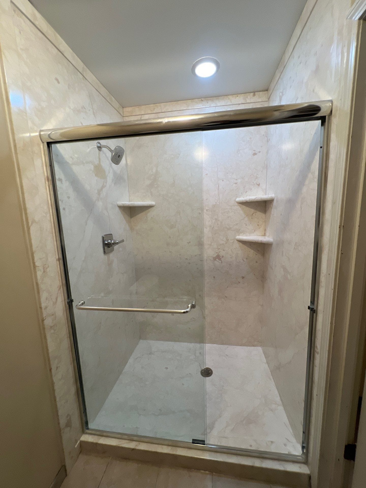 Installation included full demolition to the studs, replacement of damaged framing at no extra cost, and the use of waterproof DensShield backer, slip-resistant shower base, marine-grade sealant, and structural reinforcements behind wall panels to support accessories. The project manager returned post-consultation to remeasure and finalize selections before ordering. The job was scheduled within a four-to-six week window and completed in two days. All work areas were protected with runners and the team managed demolition cleanup and plumbing updates.