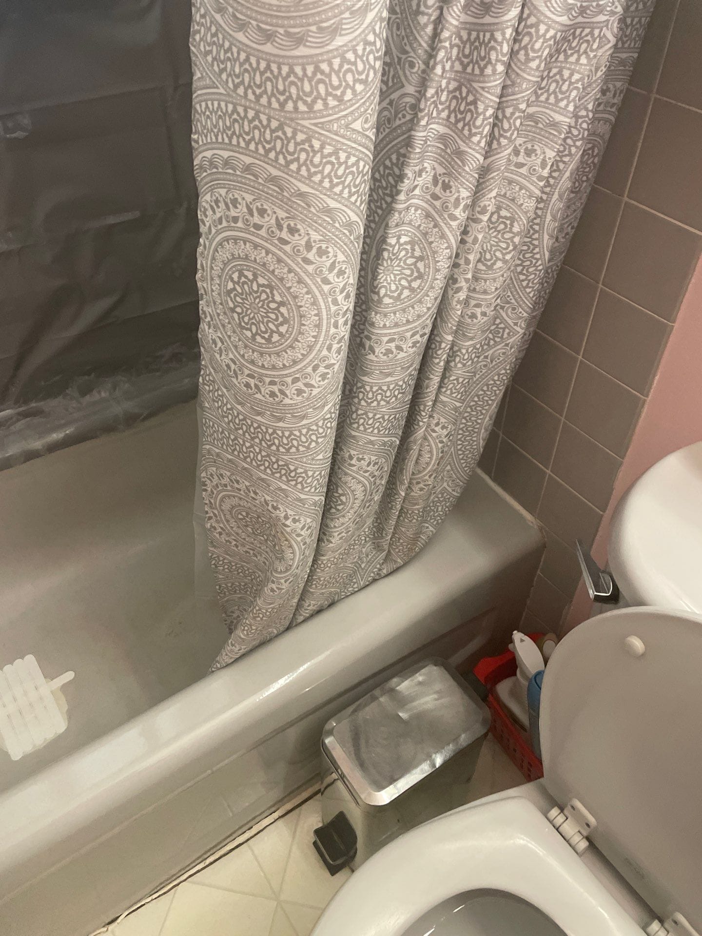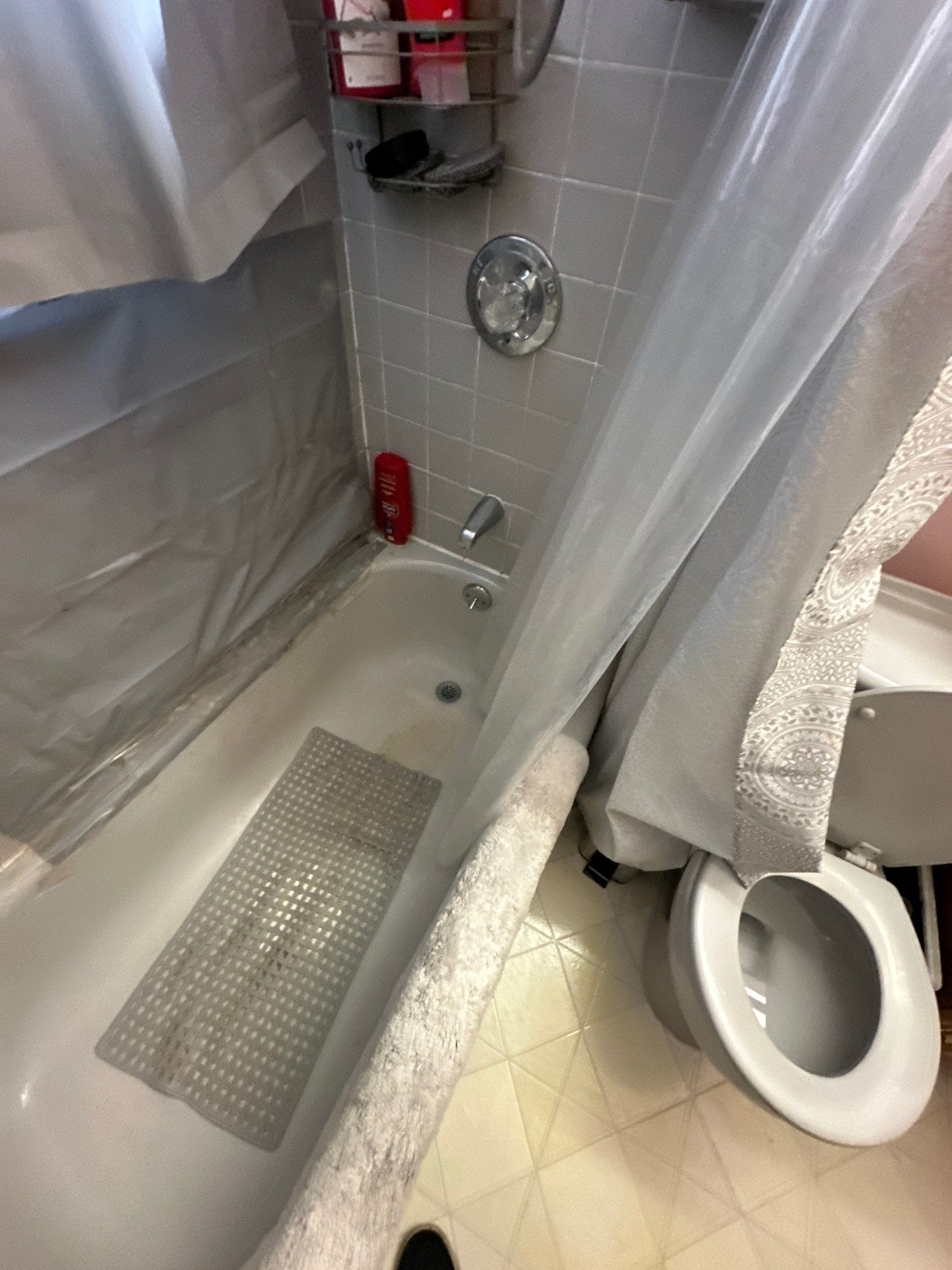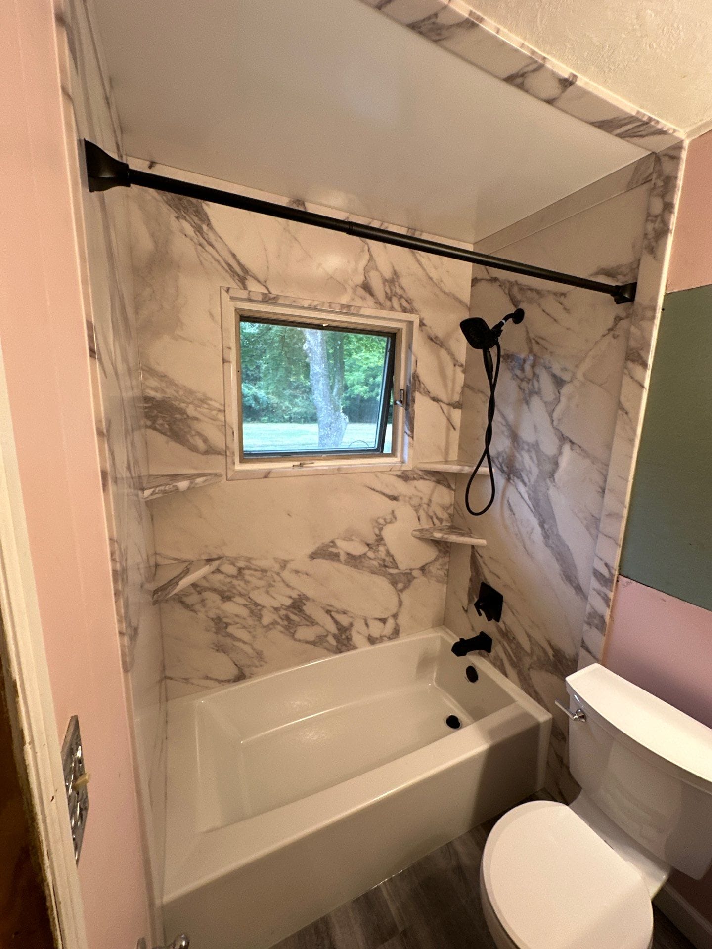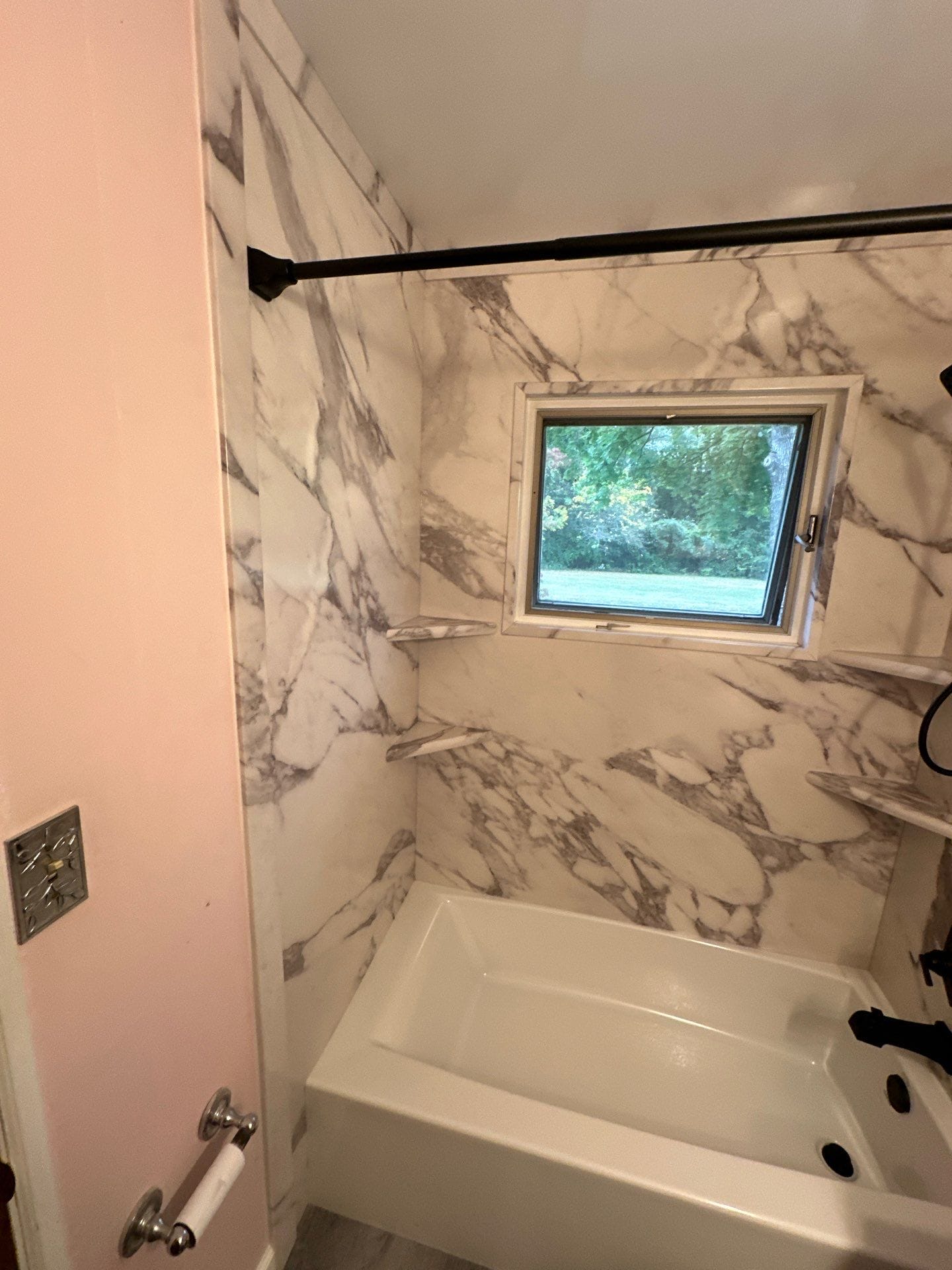 Installation began with full demolition of the existing wall tile and fiberglass unit. The new tub system featured a deeper soaking basin surrounded by white-veined marble composite panels that were custom-fit and sealed. A black wand showerhead system was installed, along with new plumbing, a pressure-balanced valve, and a flat curtain rod to complement the modern design. Two matching corner shelves were added for product storage, and the window was neatly framed into the wall surround. The remodel was completed in two days, with all debris removed and no subcontractors involved in the process.