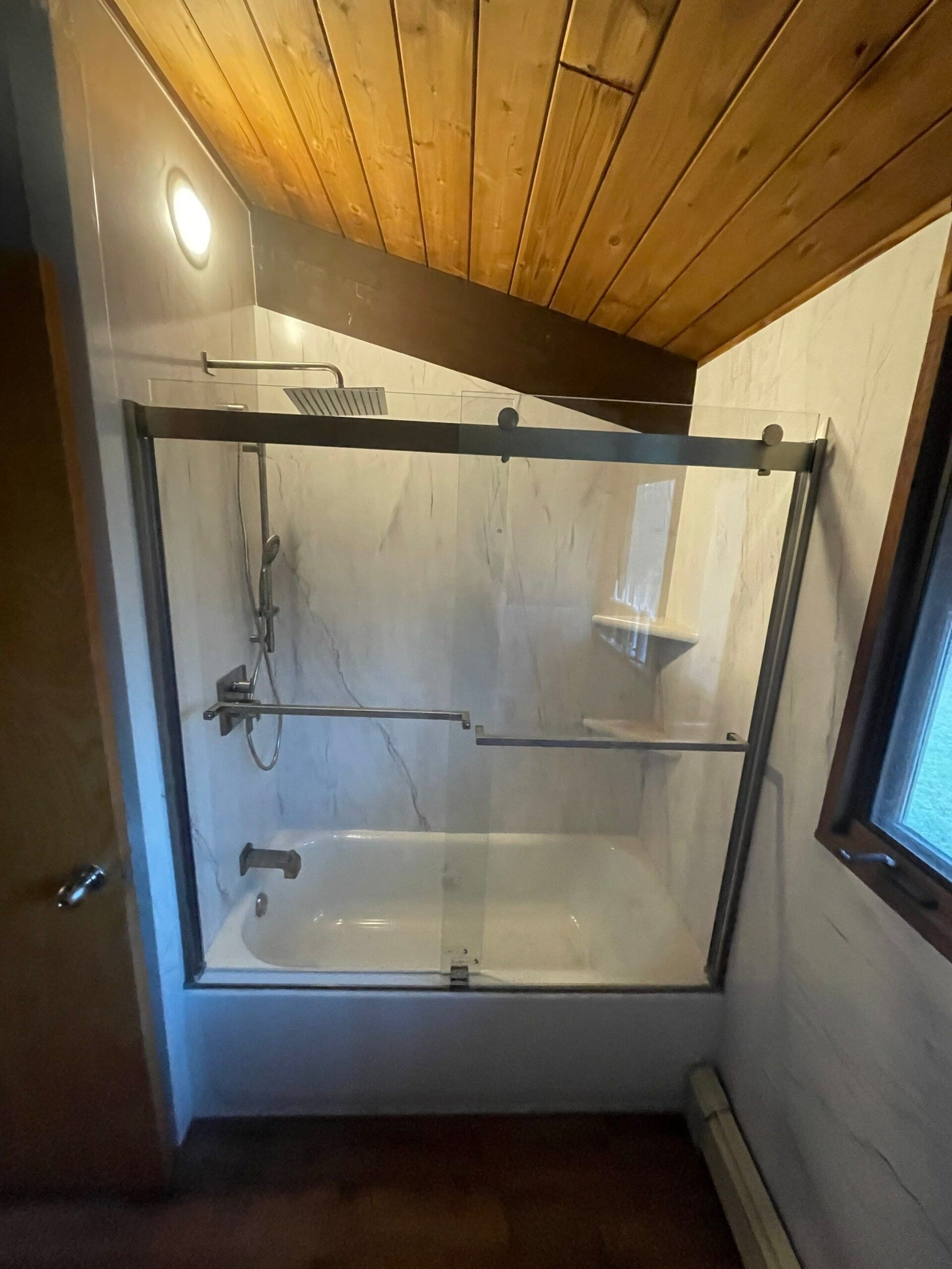 Installation included full removal of the existing tub and tile surround, followed by the fitting of custom composite panels in a white marble finish with light gray veining, consistent with the customer’s updated preference. A custom-built, non-slip composite shower pan was installed, along with upgraded plumbing, new diverter, and a 5/16-inch thick frameless sliding glass door system. Dual stainless steel grab bars were integrated for safety, and corner shelving was added for convenience. The job was completed in under three days, with debris hauled off-site and the area cleaned before handoff.