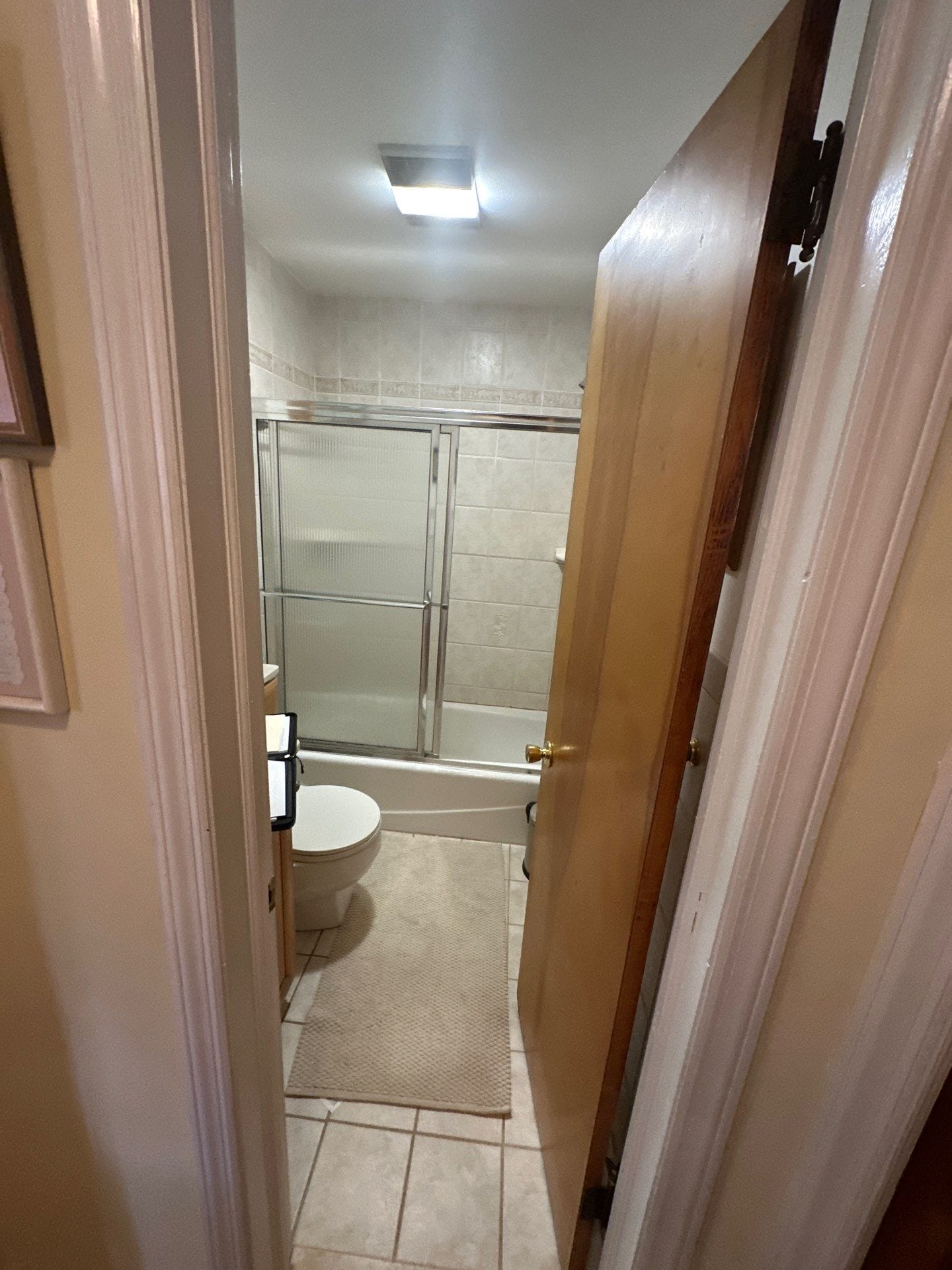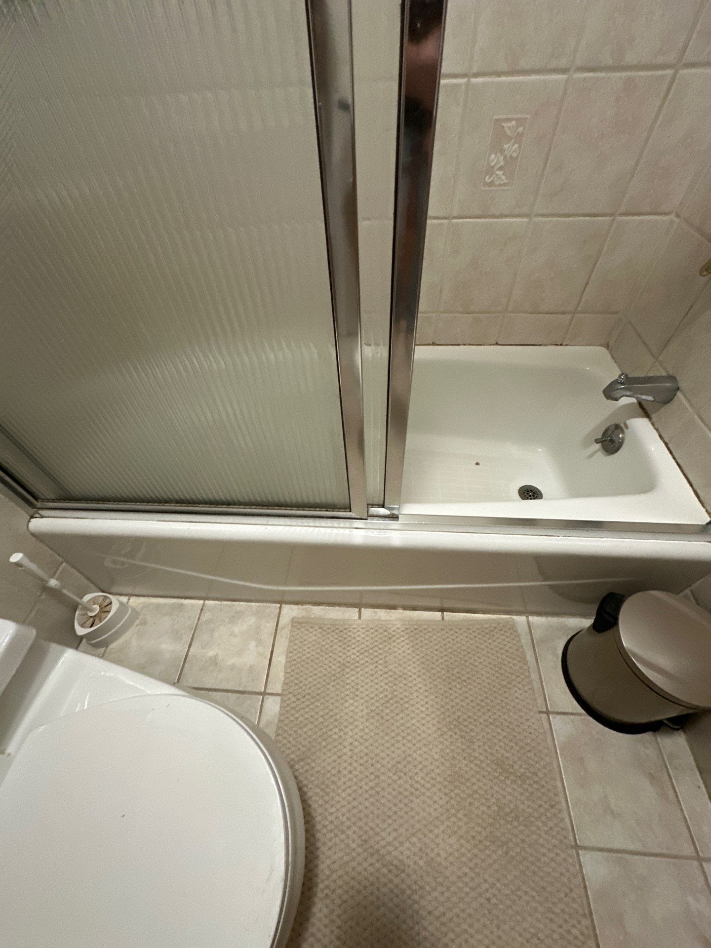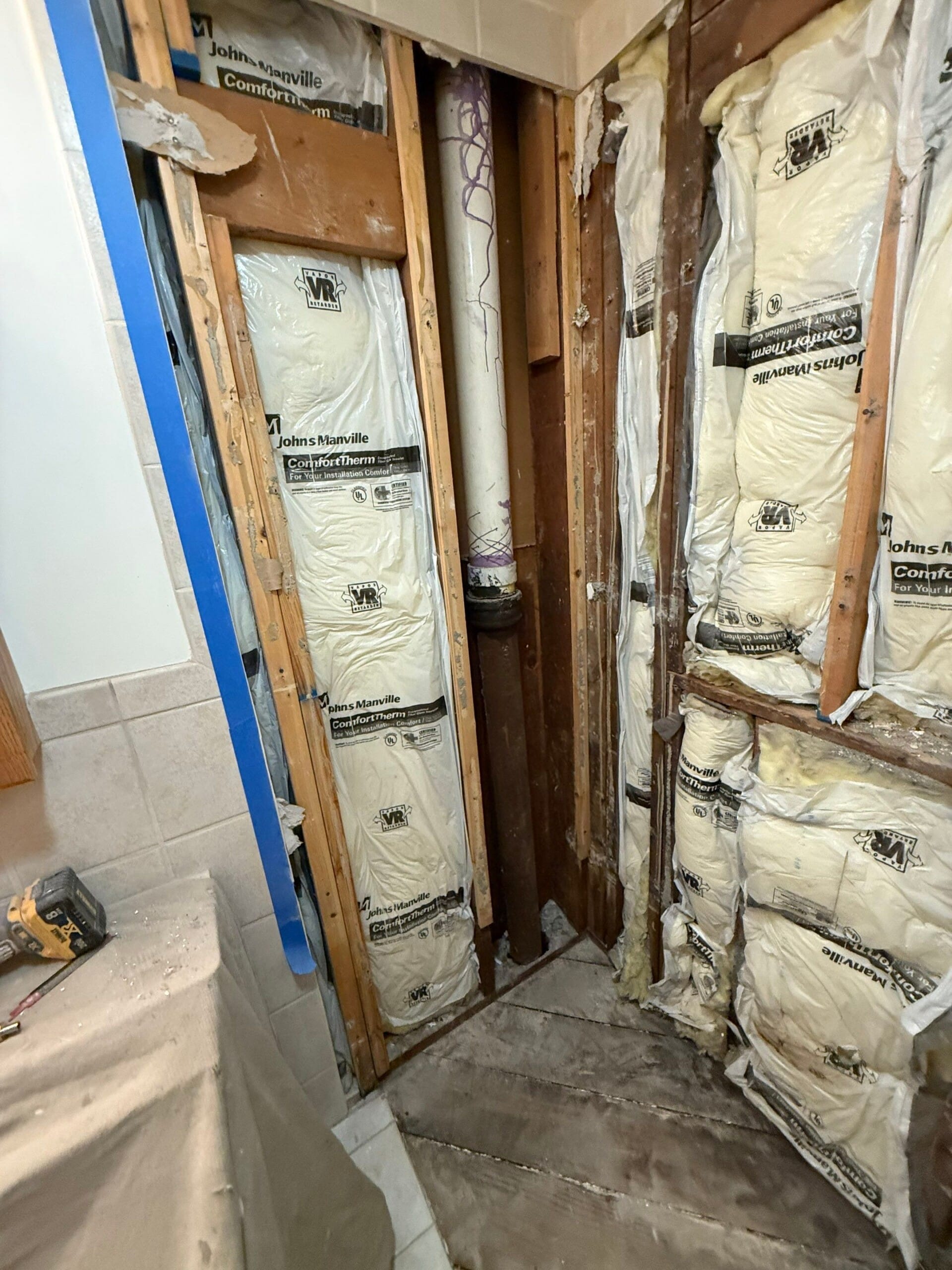 Installation was completed by in-house employees and included full demolition to the studs, replacement of all existing pipes with new PEX lines, and installation of upgraded pressure valves and drainage. The remodel was completed within the company’s typical one to two-day timeframe, with no subcontractors involved. Customer-provided vanity and toilet remained in place, and no window trim or double glass door was visible in the final build.