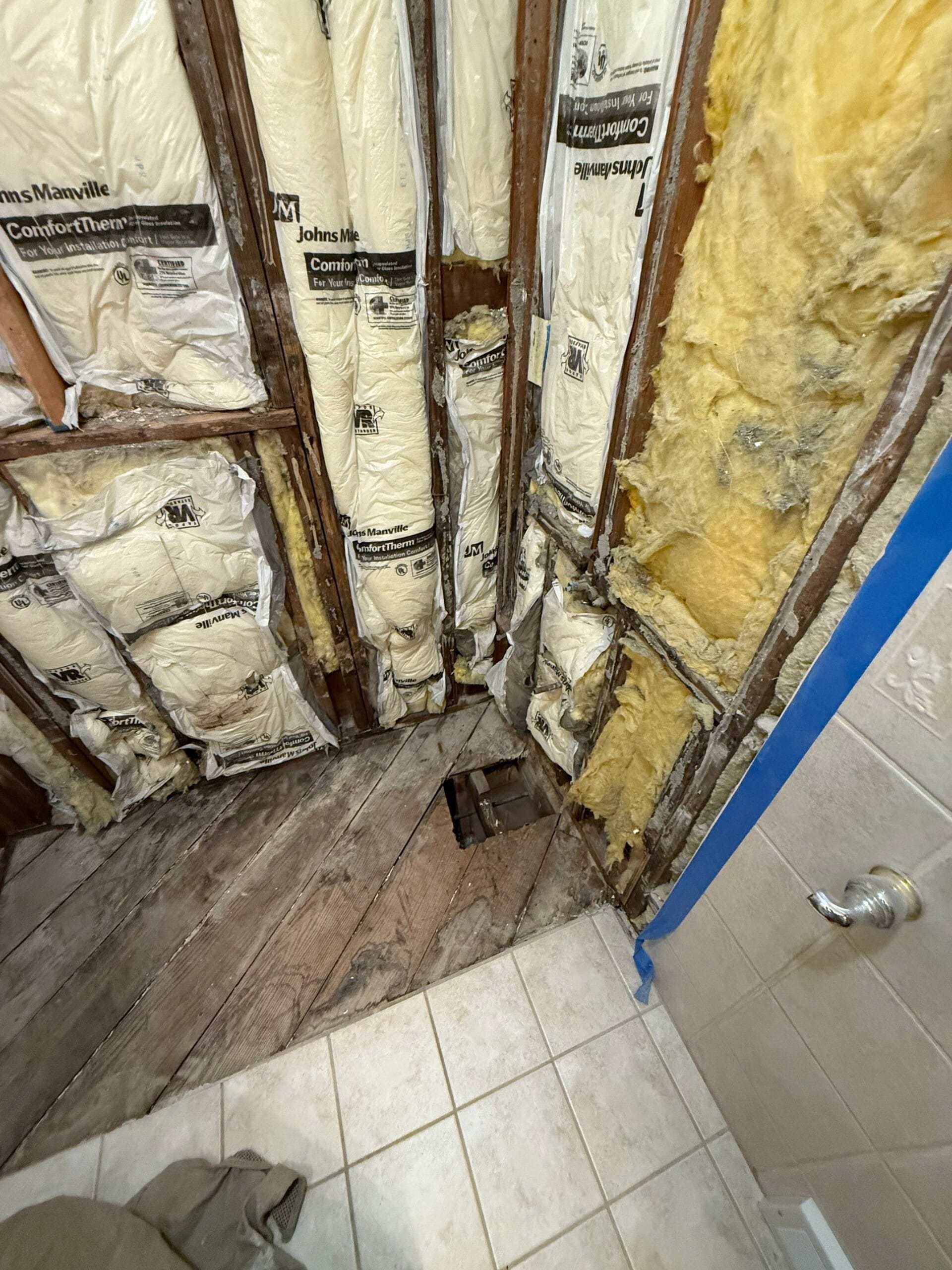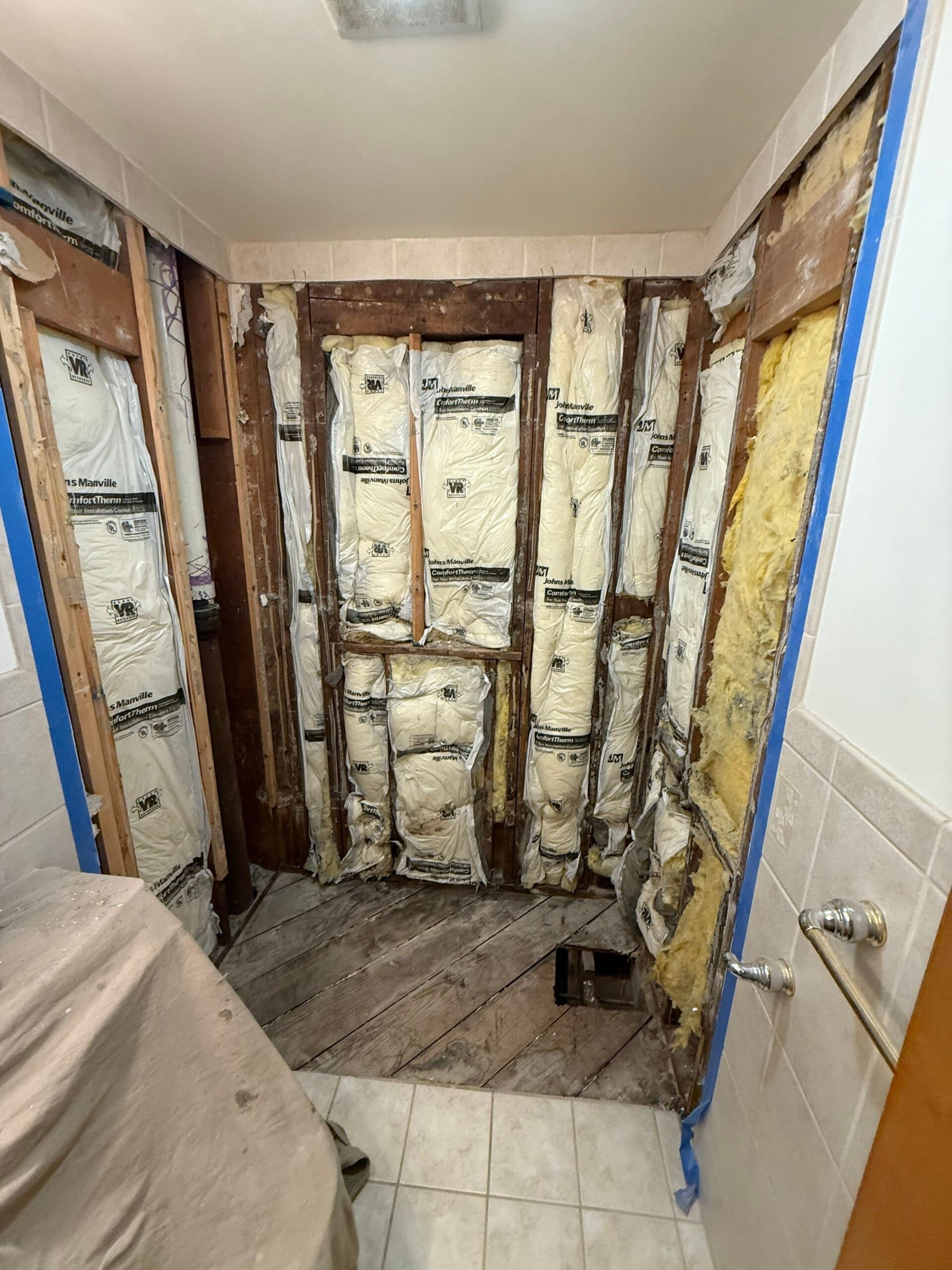 Ehsan, the Five Star Bath Solutions representative, recommended their antimicrobial, scratch-resistant composite panel system, which is built from waterproof PVC-based material. The walls feature a six-layer structure with a protective coating designed to eliminate mold risks. All wall panels reach to the ceiling for full enclosure. He explained how the shower base is made from closed-cell foam for strength and includes a textured surface for slip resistance. The company’s HydroBlock backer board system, constructed from inorganic foam, was installed behind the walls to further ensure long-term water protection.