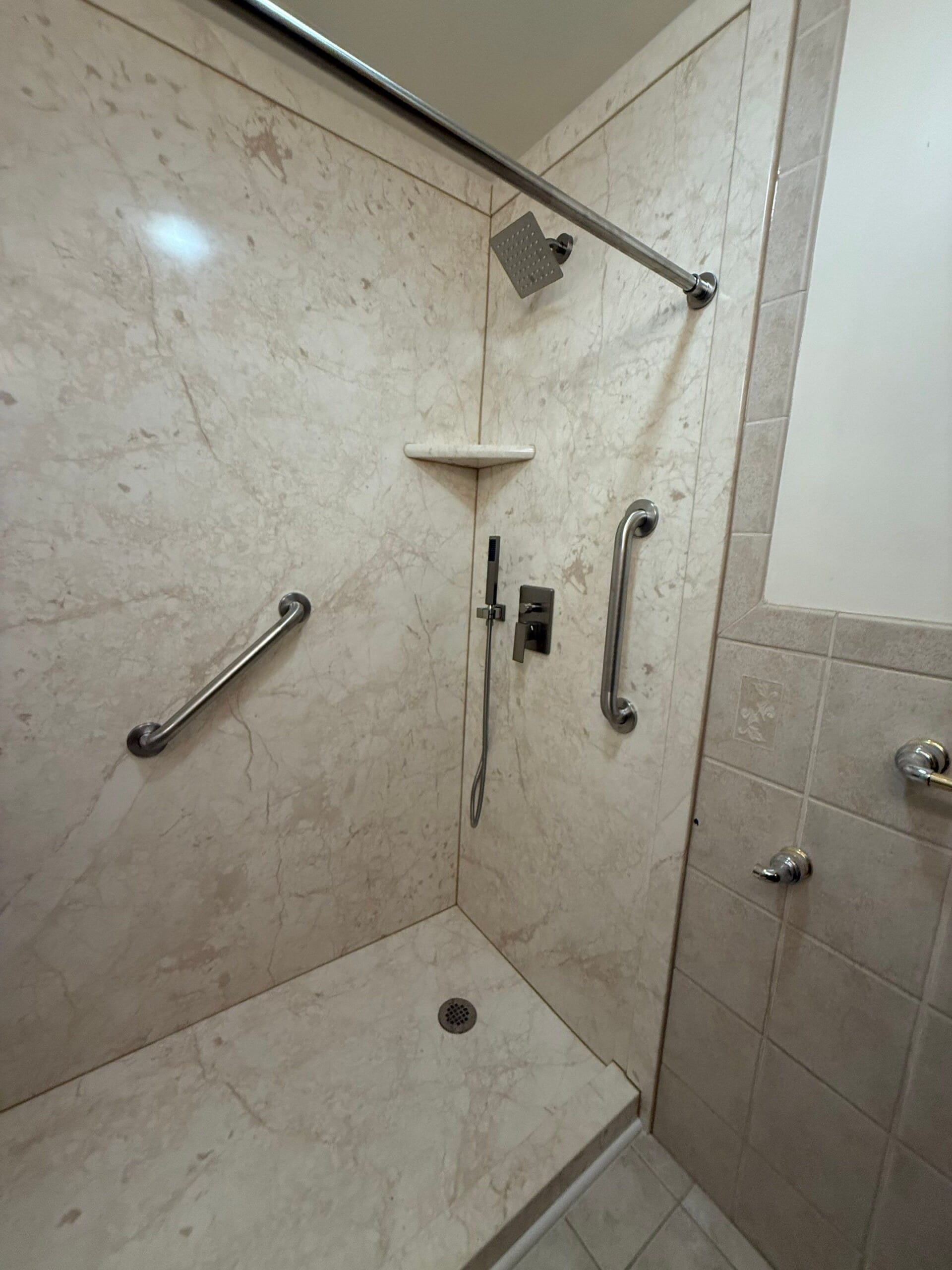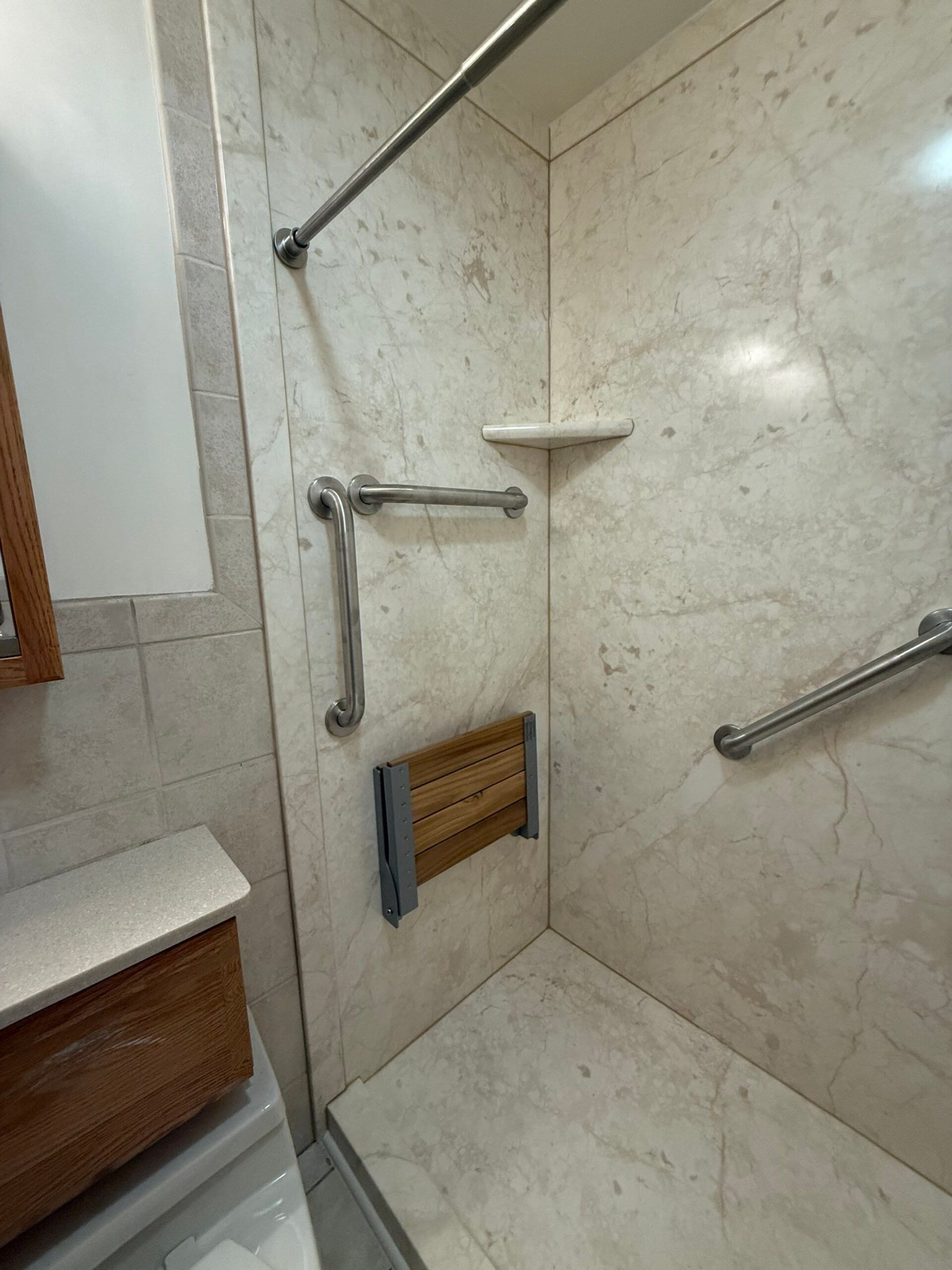 The remodel introduced a low-threshold walk-in shower base and full-height wall panels with a marbled composite finish. Integrated corner shelves were installed on both sides, along with a fold-down teak bench for added comfort. The fixture system includes a square-profile rain shower head and a separate handheld wand in a chrome finish. Three ADA-compliant grab bars were installed—one vertical at the entrance, one horizontal on the control wall, and one angled across the back wall. A curtain rod was used in place of the requested double glass doors, which were not included in the completed design.