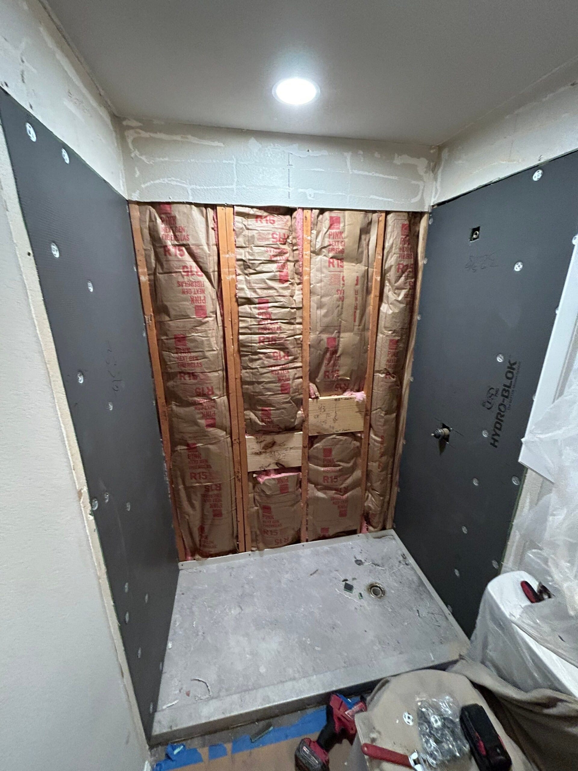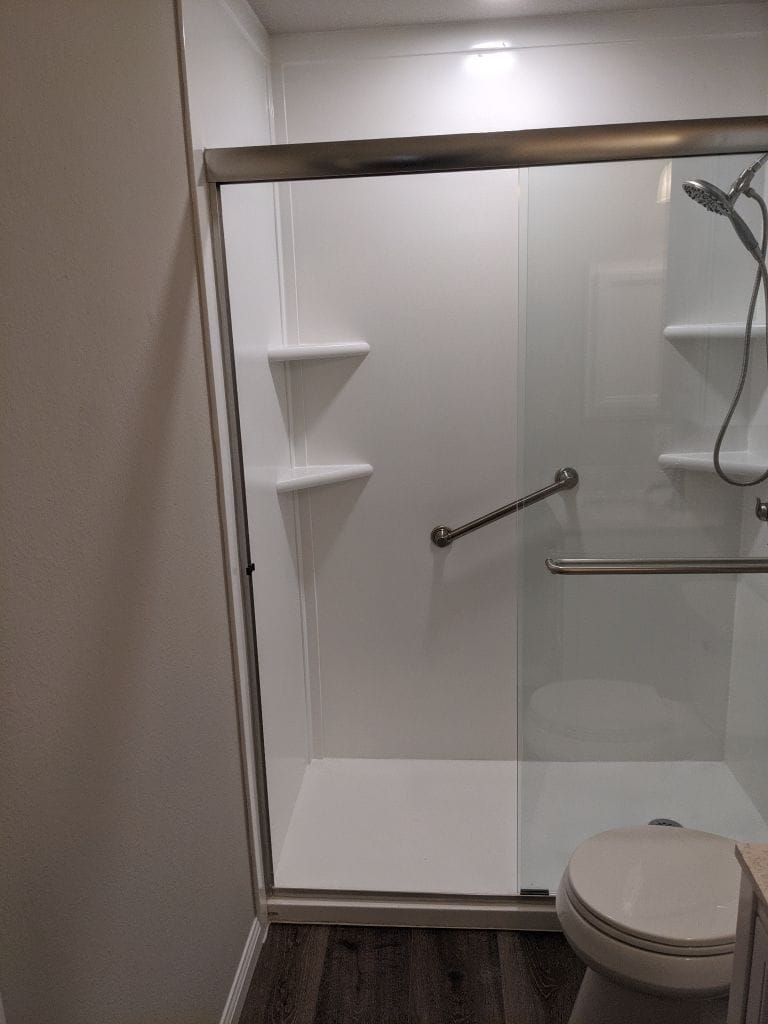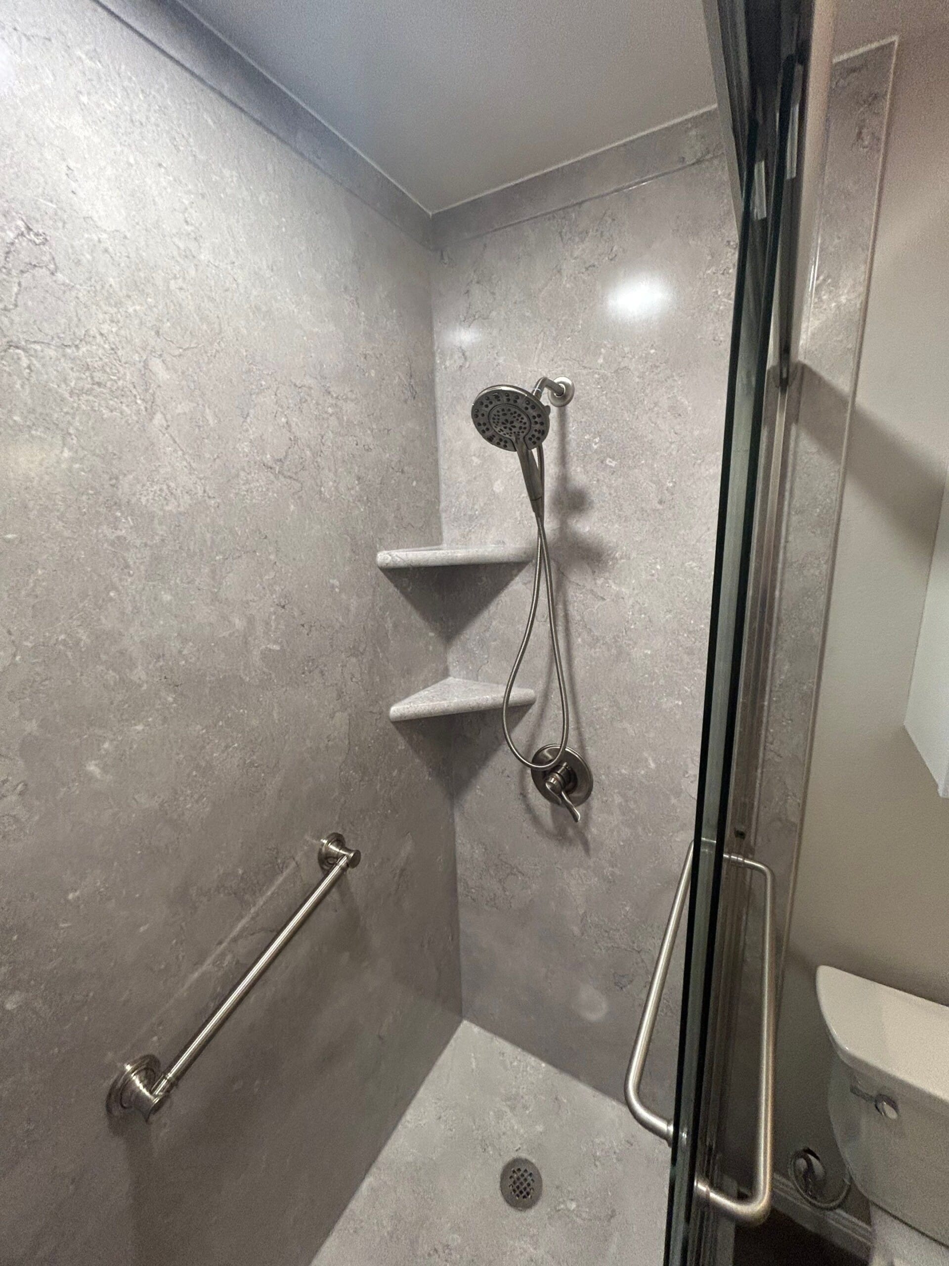 Installation began with full removal of the old bathtub unit and inspection of the surrounding structure. New Hydro Blok waterproof panels were installed behind the walls, followed by precision mounting of the composite wall panels in a light gray stone finish. The new base included a low entry threshold for safer access, and multiple grab bars were installed at strategic positions. Frameless sliding glass doors replaced the former panel to open up the space visually. Two built-in corner shelves were added, maintaining a clutter-free layout. The remodel was completed over a two-day timeline with no subcontractors involved, as all work was done by Five Star certified installers.