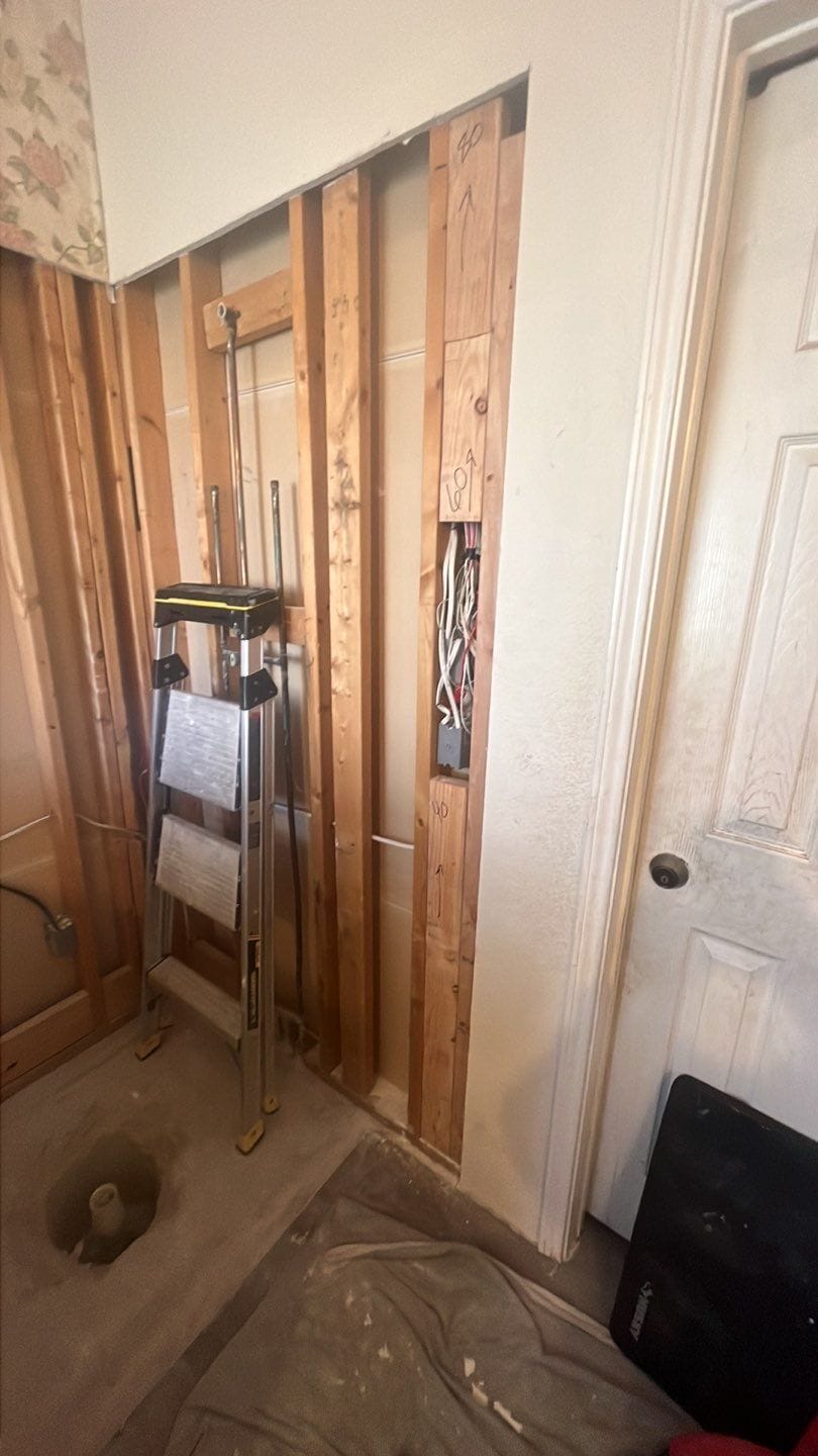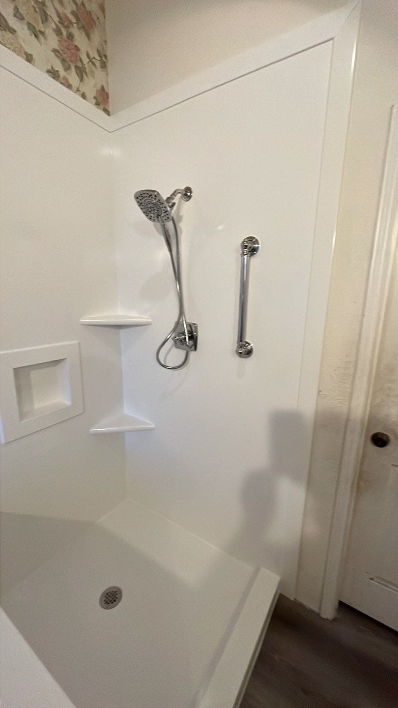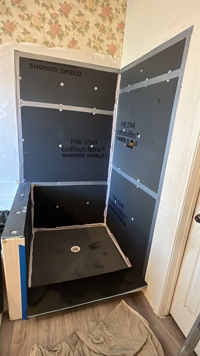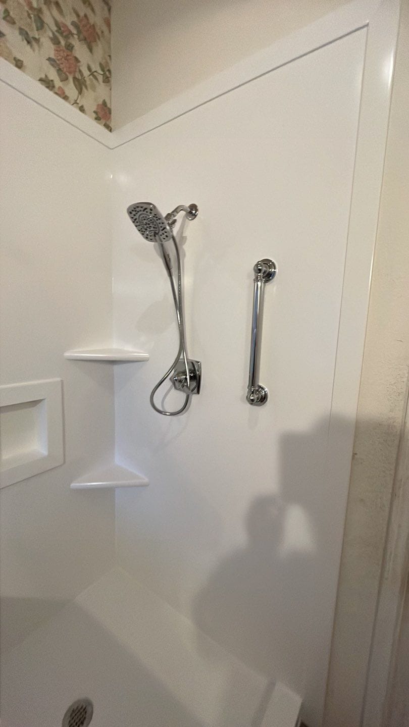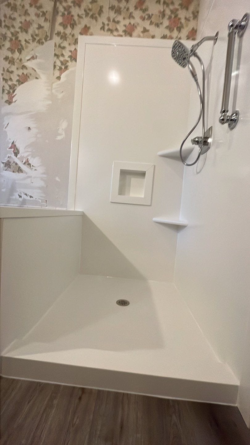 Installation began with full demolition of the existing fiberglass pan, tile, and doors, taken down to the studs. Walls were prepped with waterproof composite backer board, followed by on-site assembly of the new low-threshold shower base and smooth White Slate panels. Features included a recessed niche, two corner shelves, a brushed nickel handheld showerhead, and a vertical grab bar securely fastened into reinforced wall blocking. No bench was installed in this build, correcting the original text. The team maintained dust control throughout, and a senior technician conducted a final quality check to ensure all specifications were met.