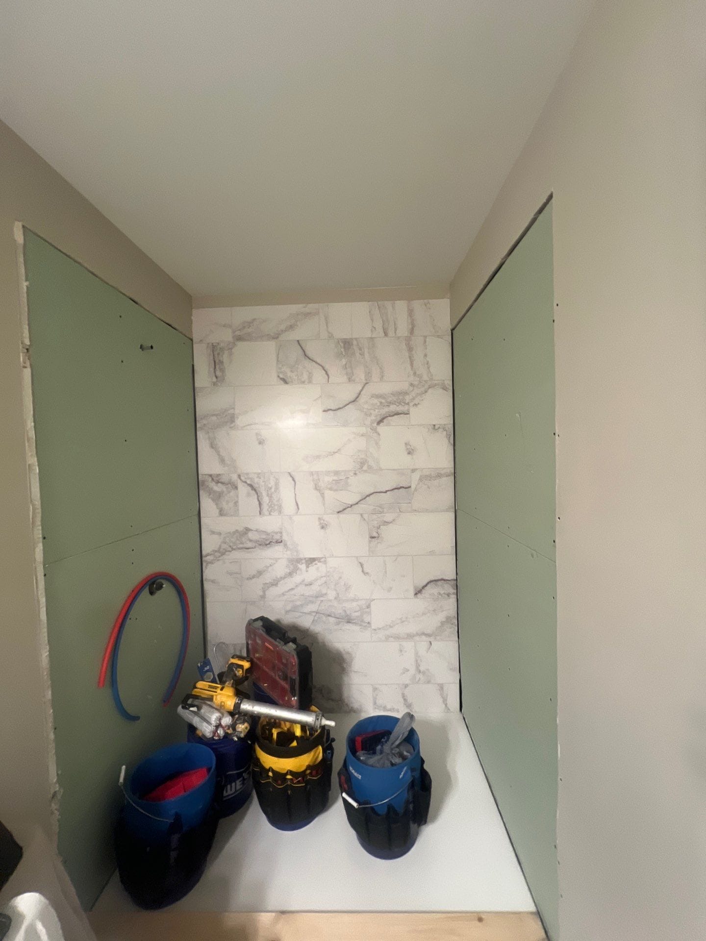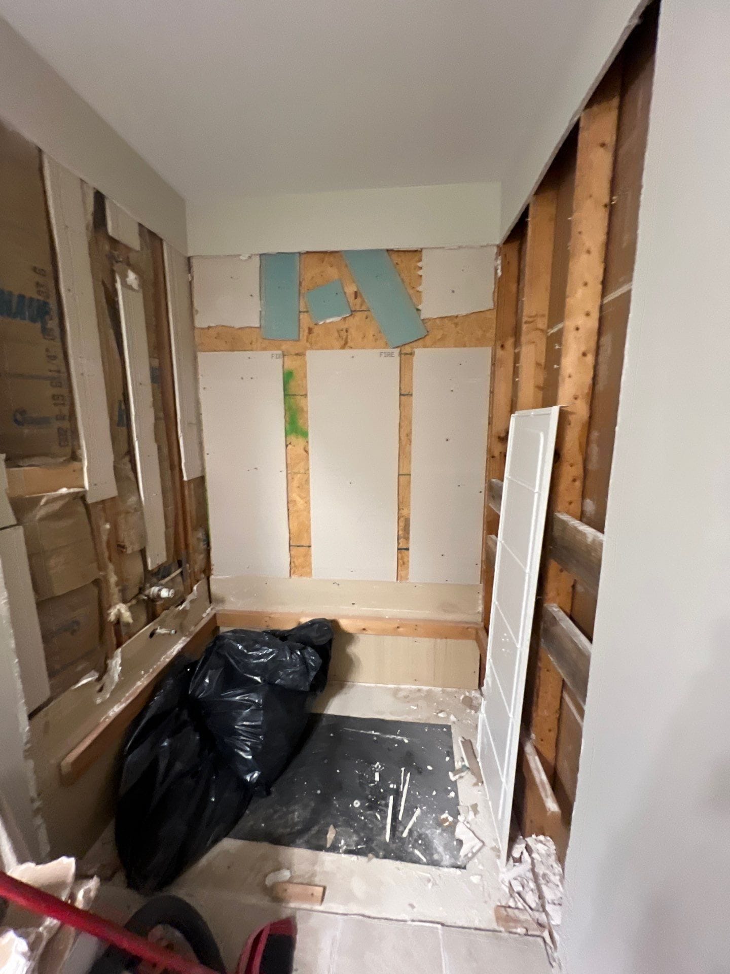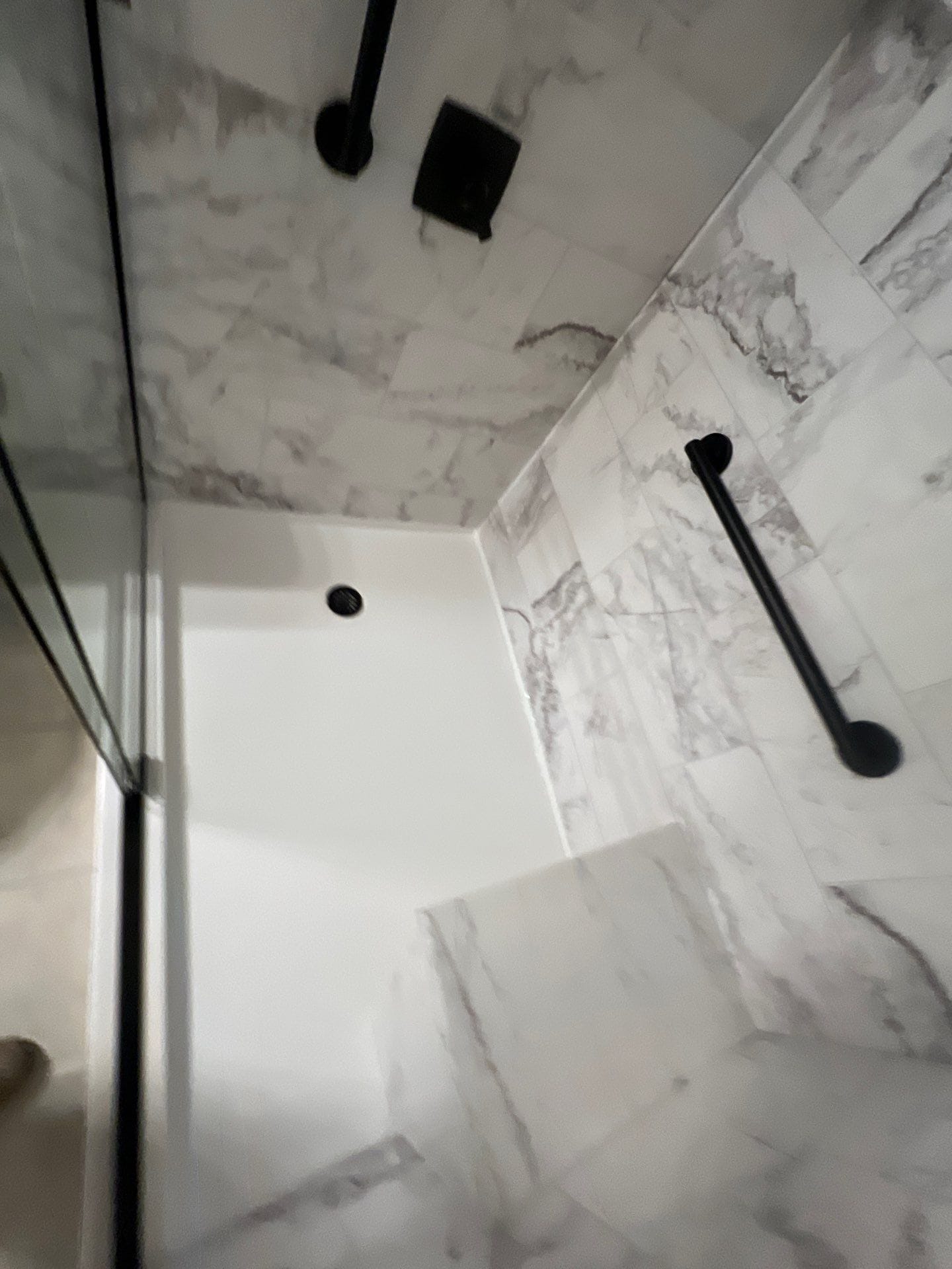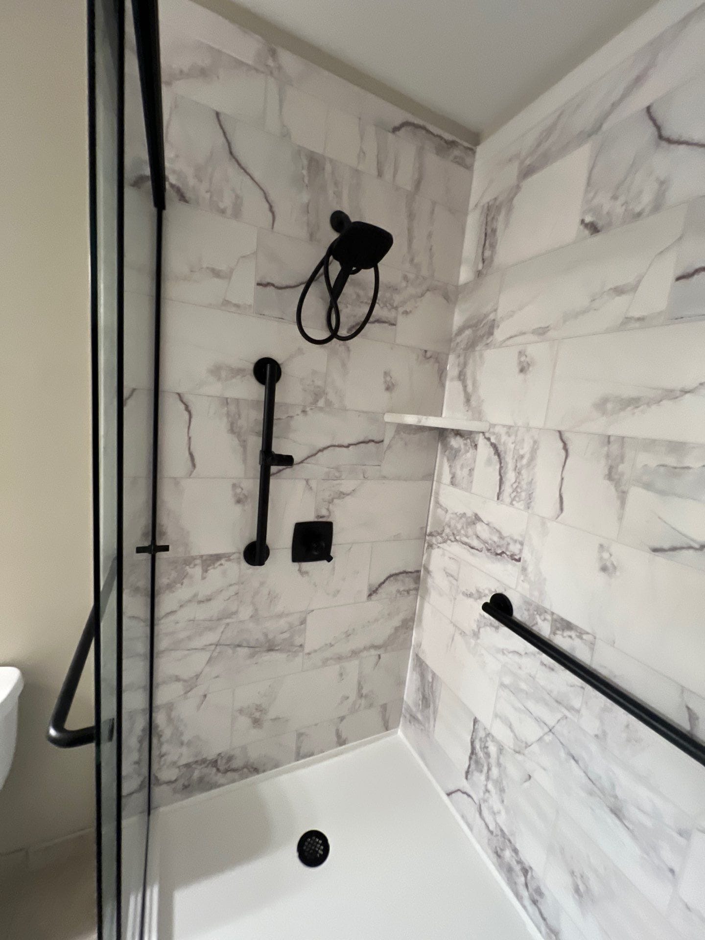 Installation began with full demolition to the studs, including removal of existing tile and tub. The certified in-house crew managed all mechanical updates, including plumbing reroute and precise placement of grab bars. Unlike the initial plan for a curtain rod, a black-framed sliding glass door was installed to enhance water containment and visual appeal. A custom corner bench and shelving were also incorporated into the final layout. The job was completed over two days, with all surfaces cleaned and inspected prior to handoff. Remaining cosmetic touch-ups outside the wet area were delegated to the customer.