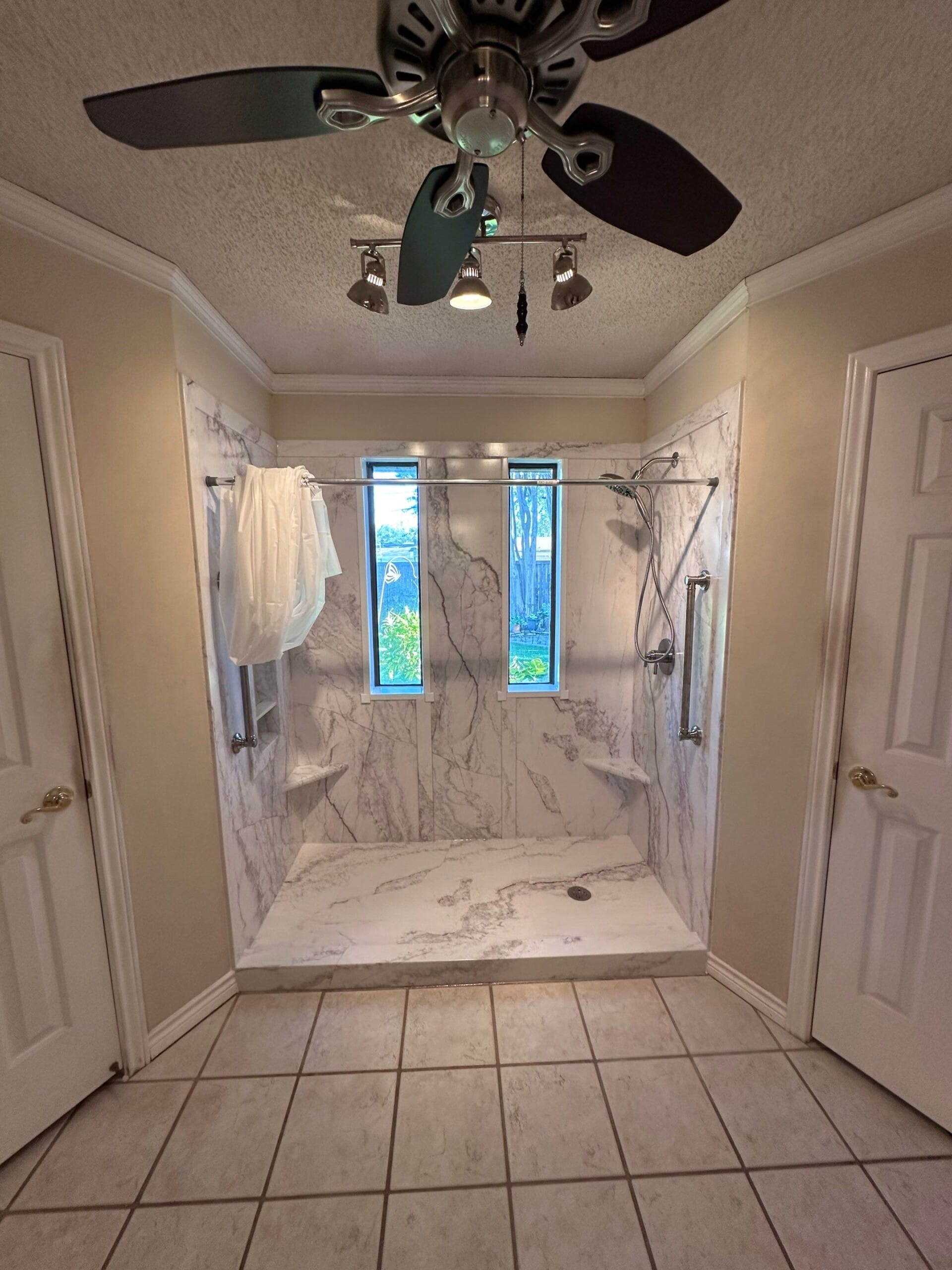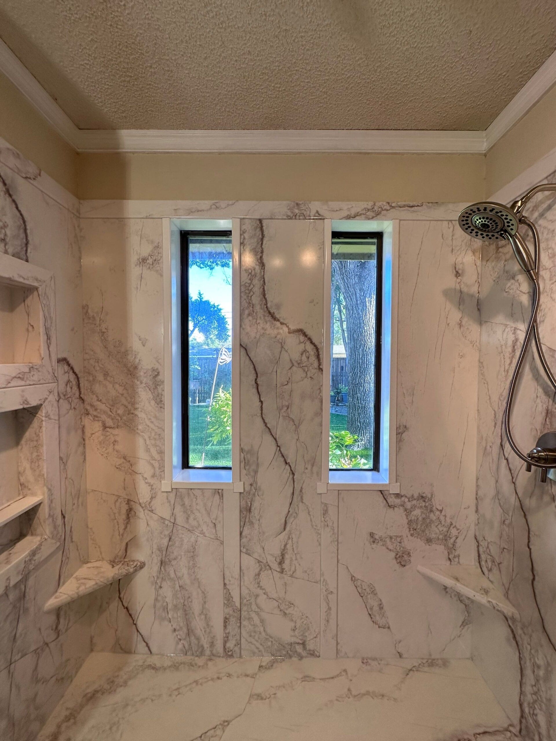 Installation included full demolition of the old bathtub and surround down to the studs, allowing inspection for hidden moisture or structural issues. Any repairs discovered during this phase would be covered as part of the No Surprise Guarantee. The new walk-in shower was outfitted with full-height marble-pattern composite wall panels, a low threshold base, integrated corner seating, and safety grab bars. Installation was managed by the in-house team, with all waste removal and cleanup completed by the end of the project. From demolition to final polish, the job was completed within a two- to three-day window following material delivery.