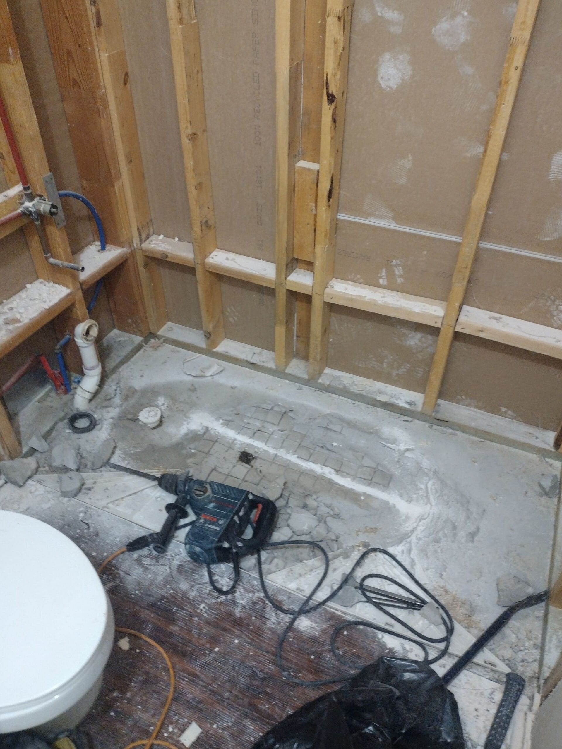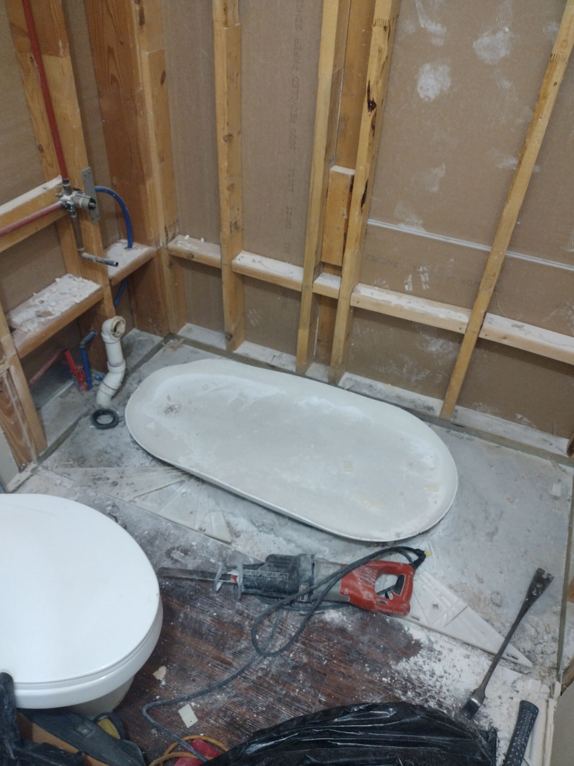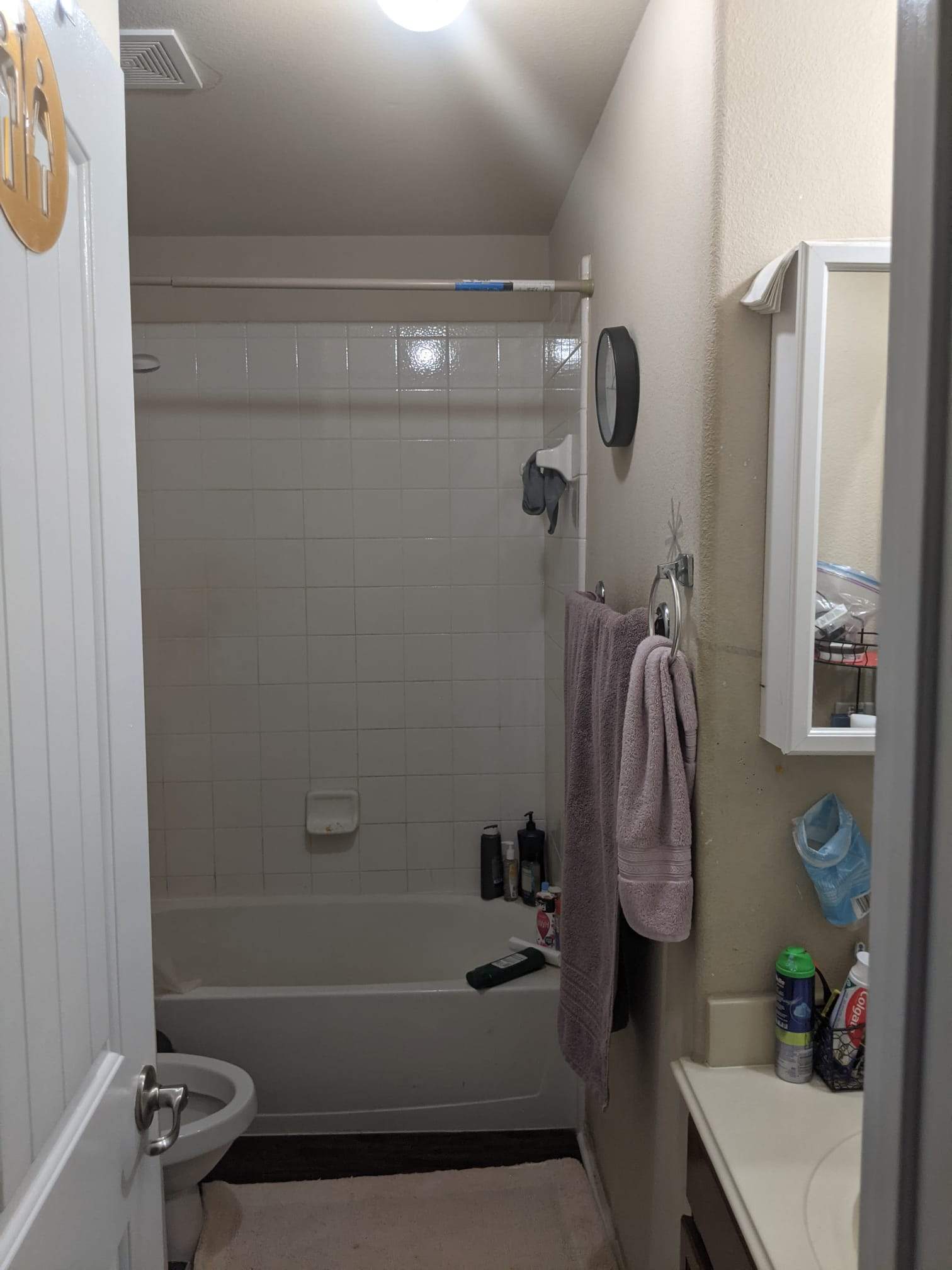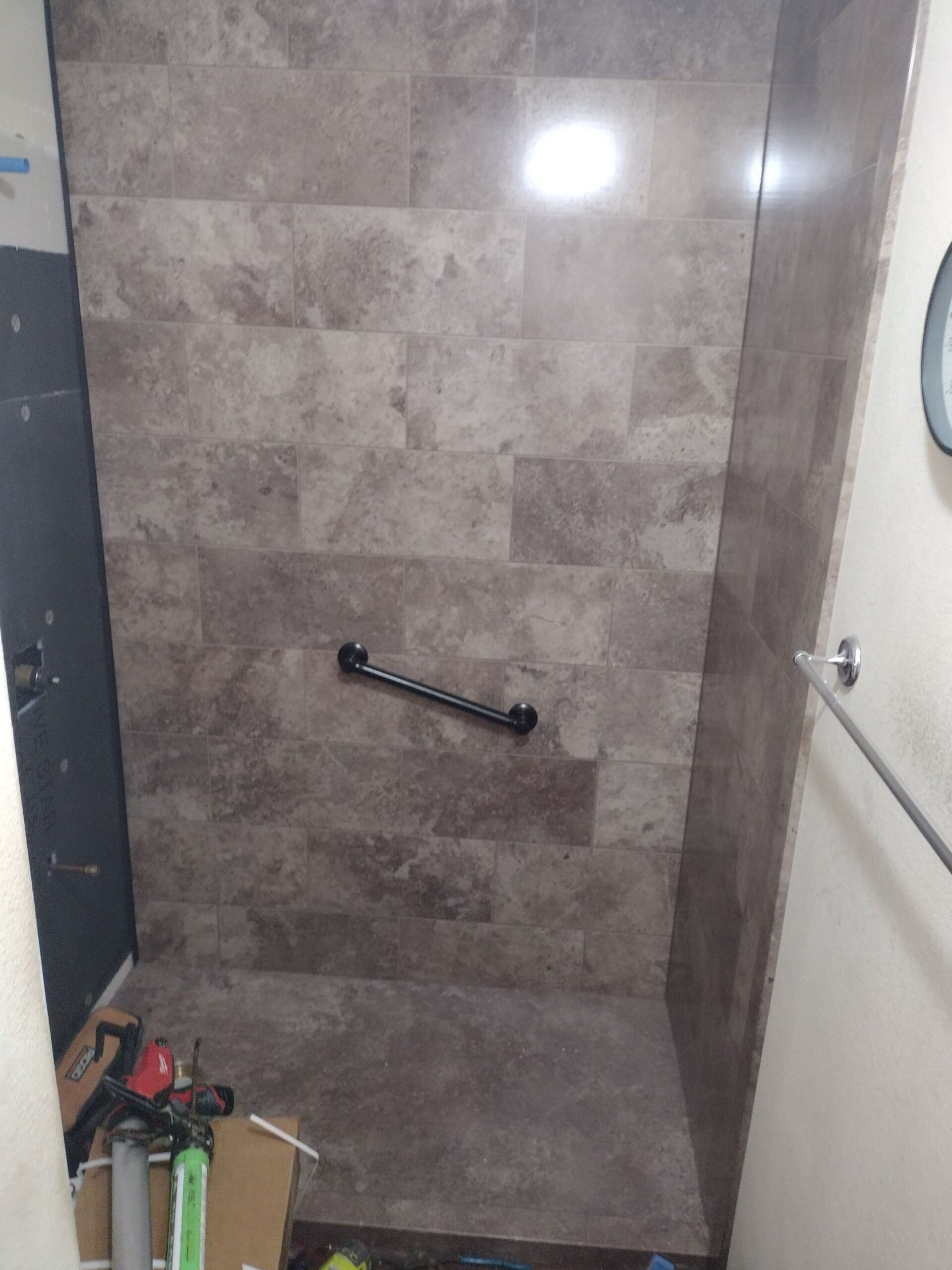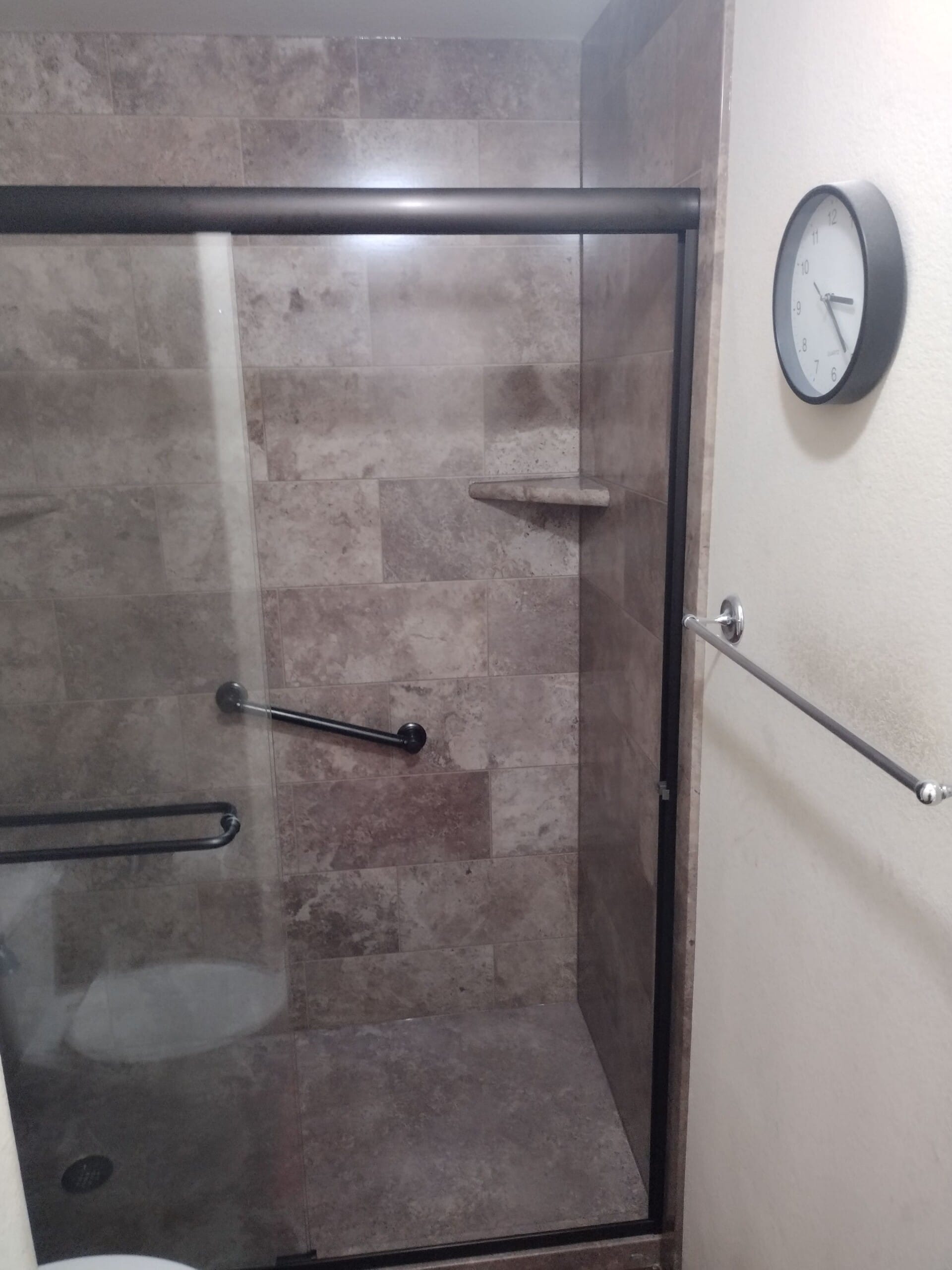 The installation included a complete demolition down to the studs with mold remediation if needed at no additional charge. A waterproof backer board was installed, followed by a custom non-slip composite shower pan and wall panels in a brown marbled finish. Two grab bars were added to enhance safety, and a corner shelf was installed for product storage. A dark-framed sliding glass enclosure was templated post-install and custom-fitted to the space. The plumbing was updated with matte black fixtures, including a handheld showerhead. The installation process was completed within the standard two to three-day timeline, with floor protection and dust containment in place, concluding with a final walkthrough by a senior technician.