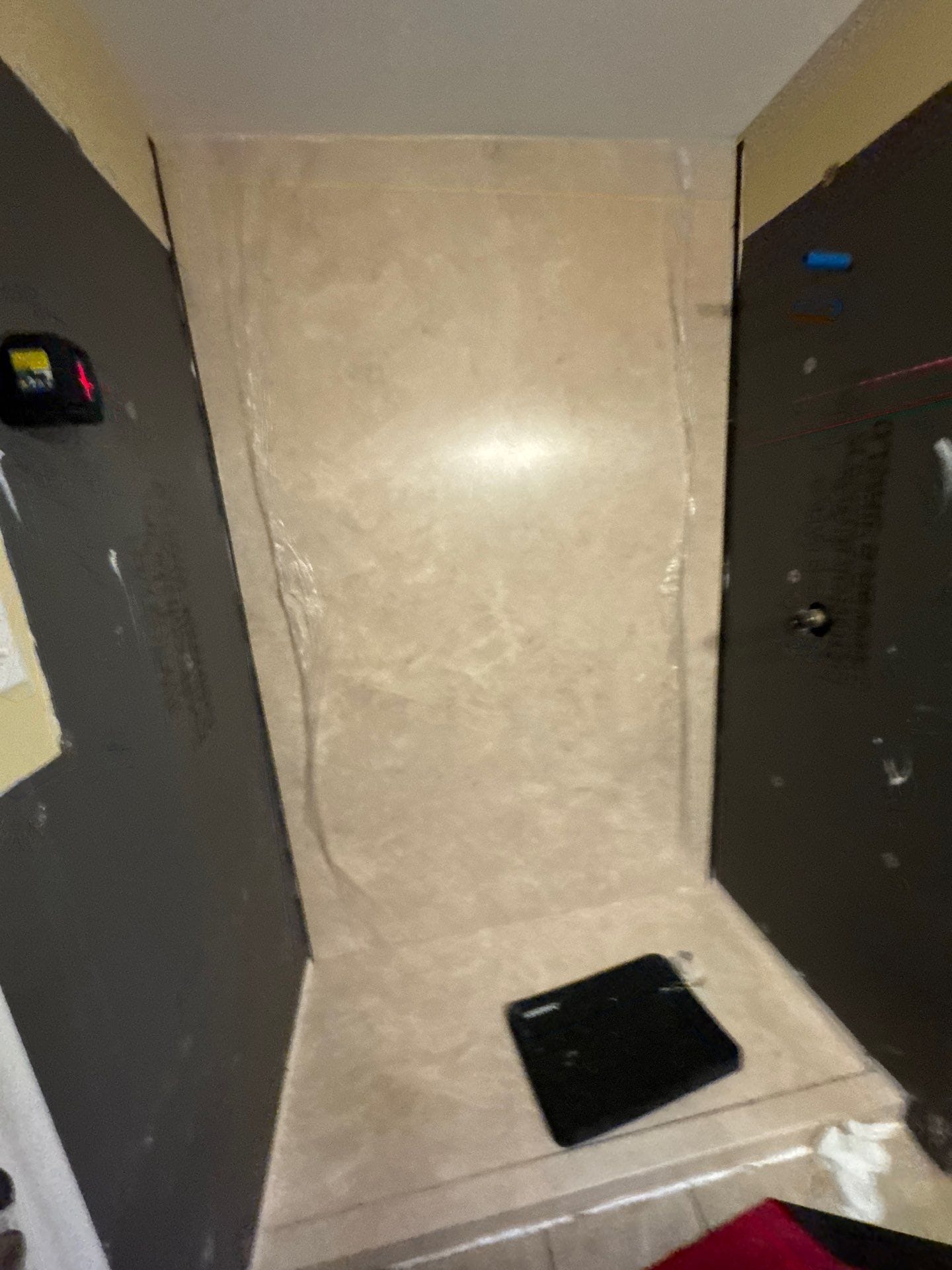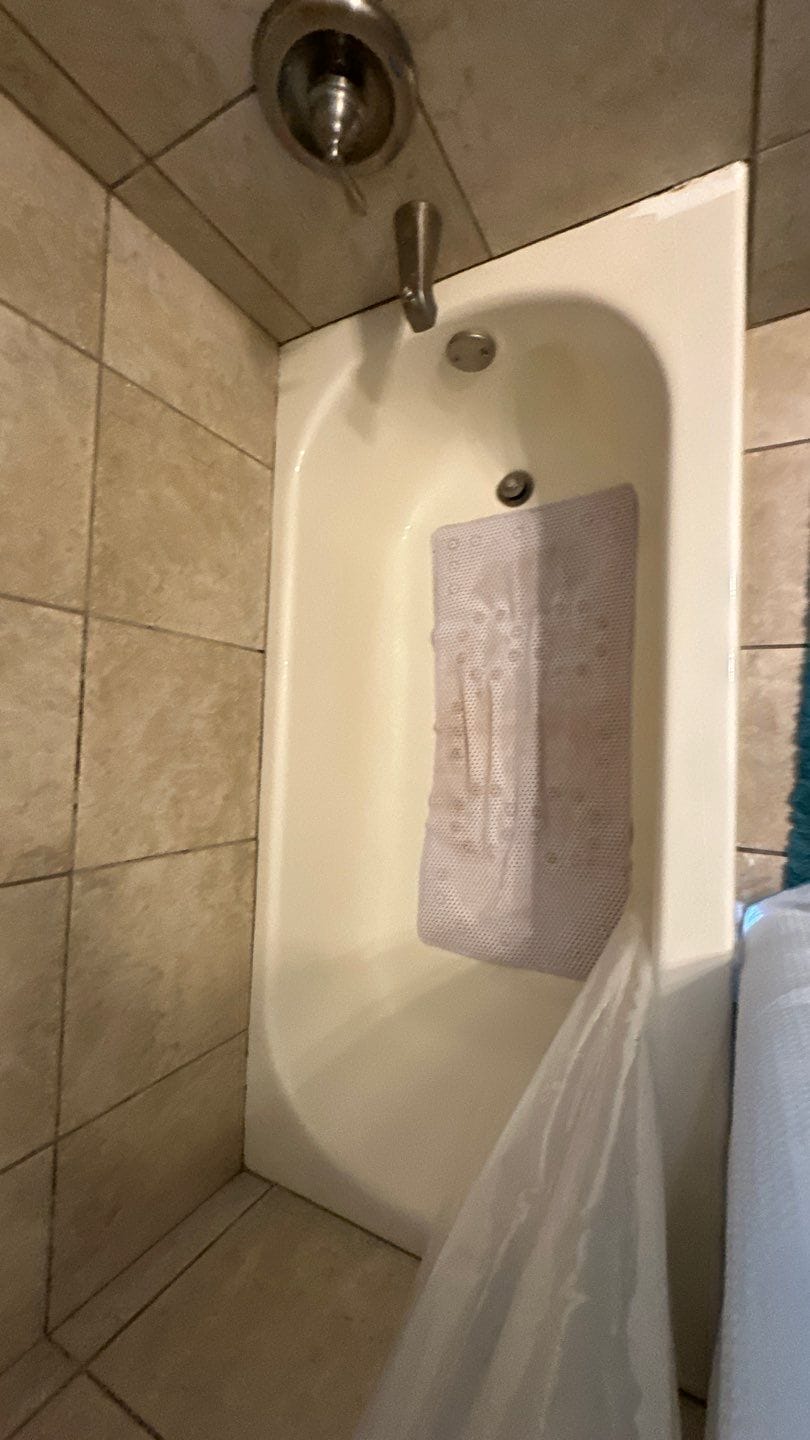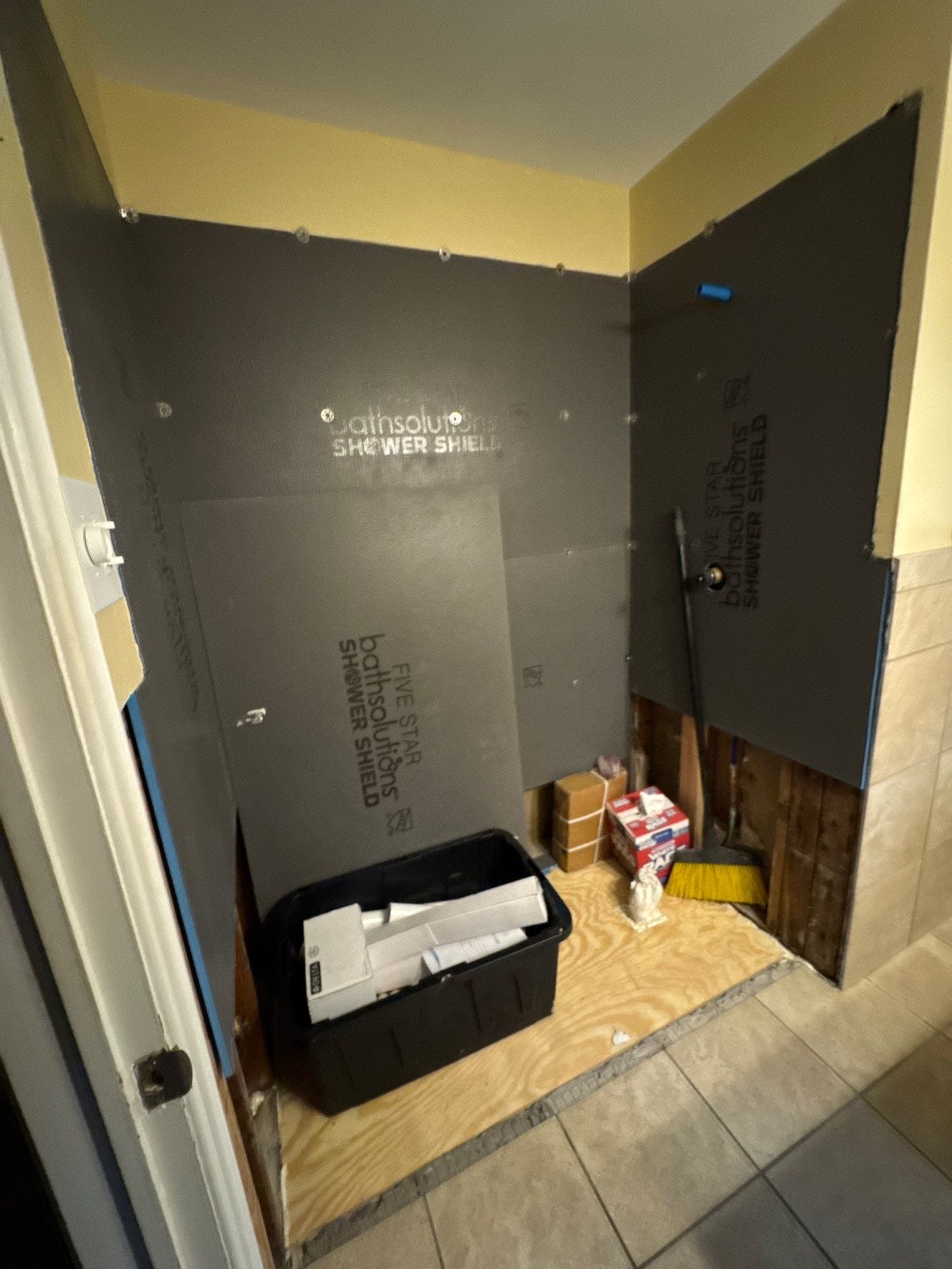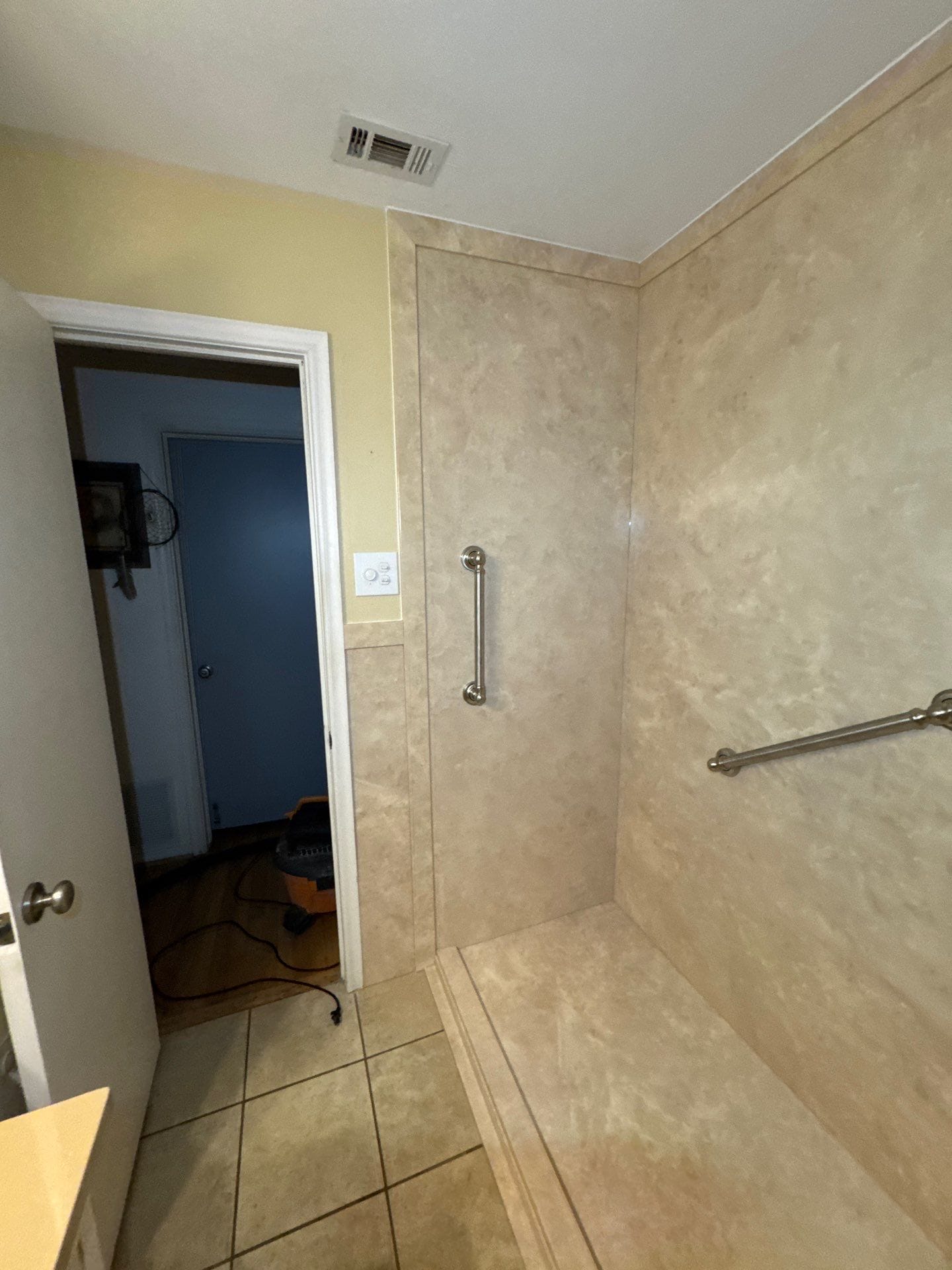Installation was described in detail, beginning with the removal of the old bathtub and tiled surround down to the studs to allow for inspection and repair of any hidden damage. The new system included a low threshold shower base, seamless wall panels extending to the ceiling, and safety accessories installed according to customer preferences. Matching accessories were integrated during installation, and all work was completed over a two- to three-day period following material delivery. The work area was left clean and ready for immediate use, with full disposal of debris included. Expectations were clearly set regarding a six- to eight-week lead time for material arrival.
