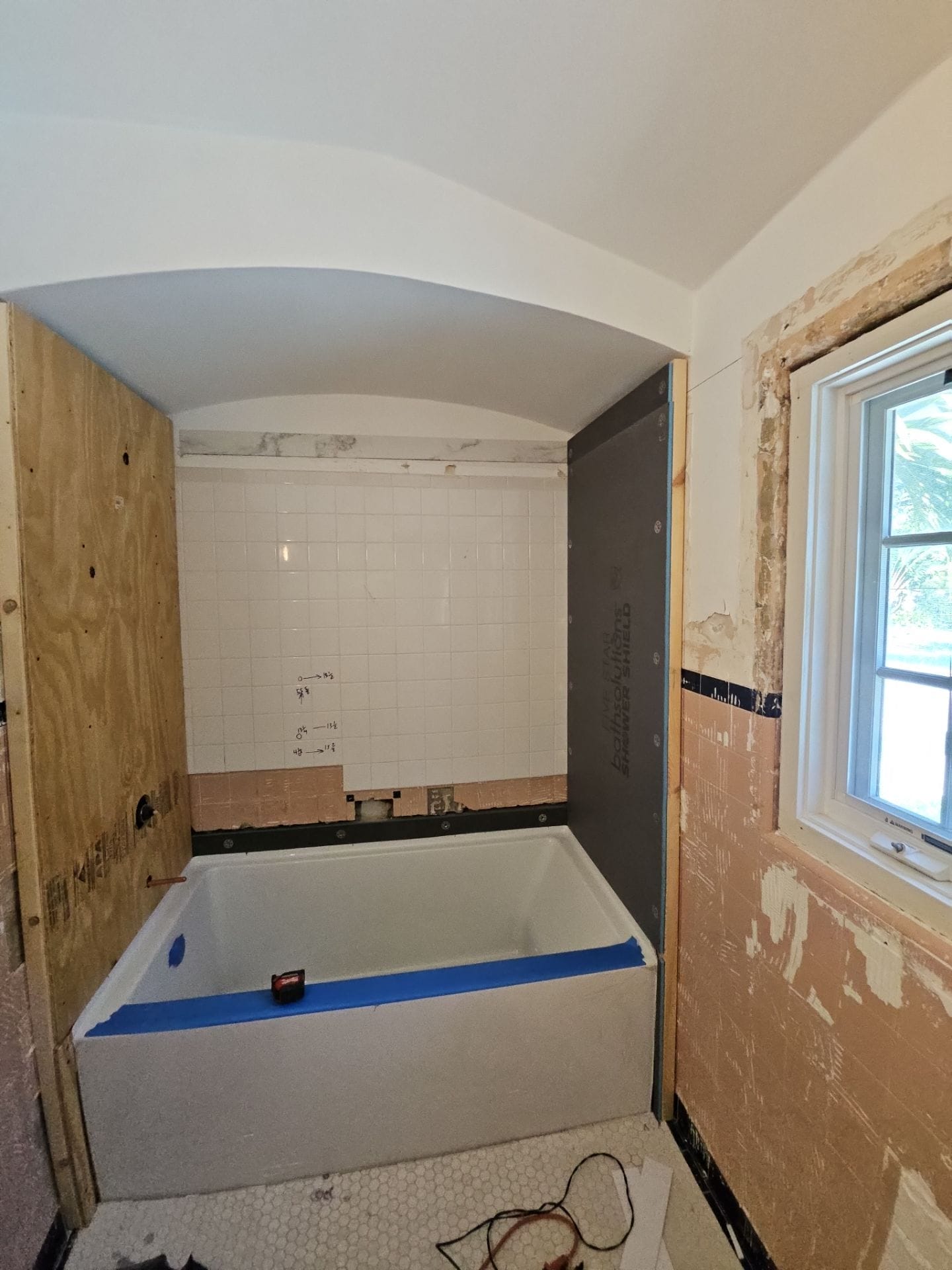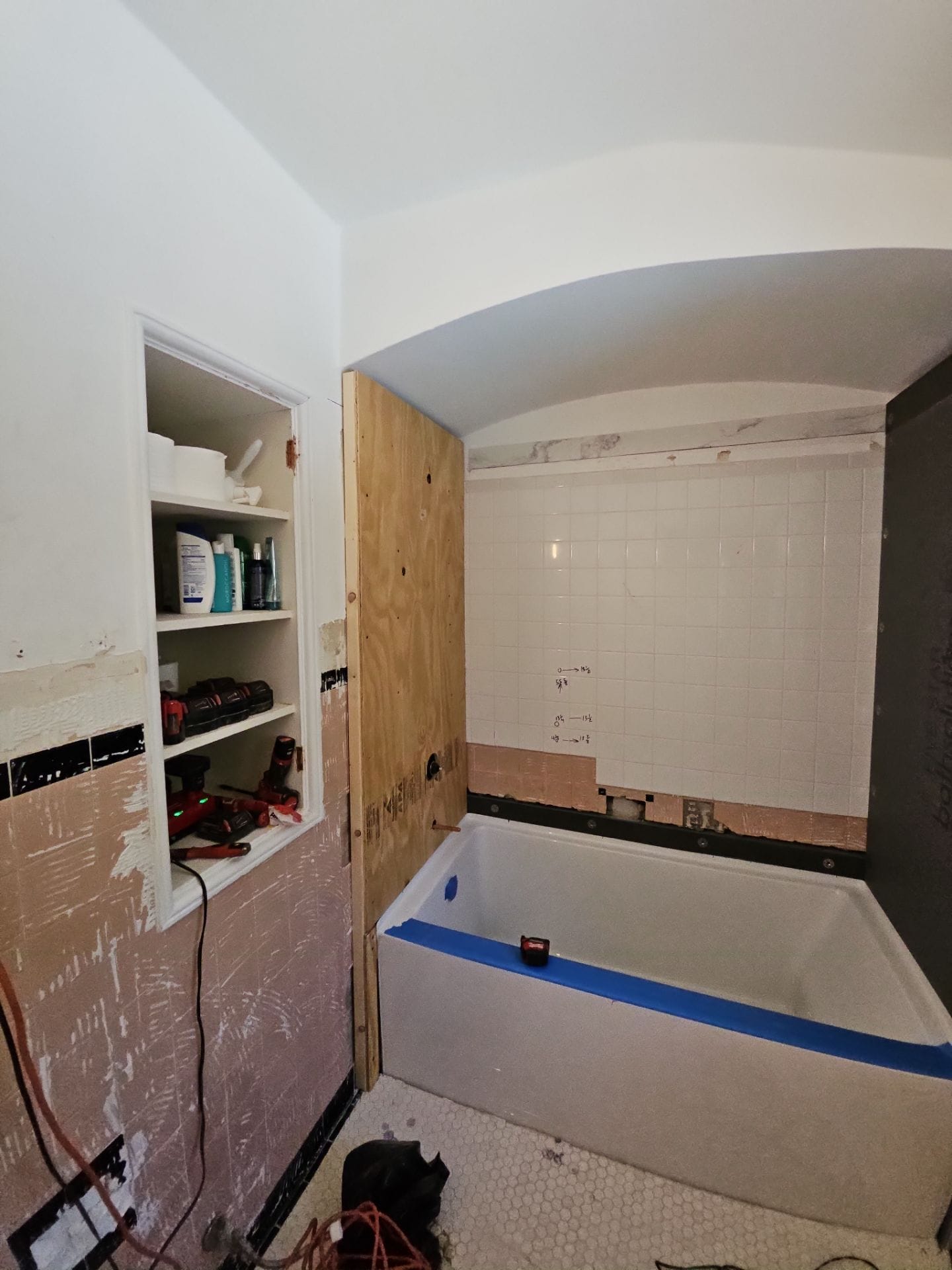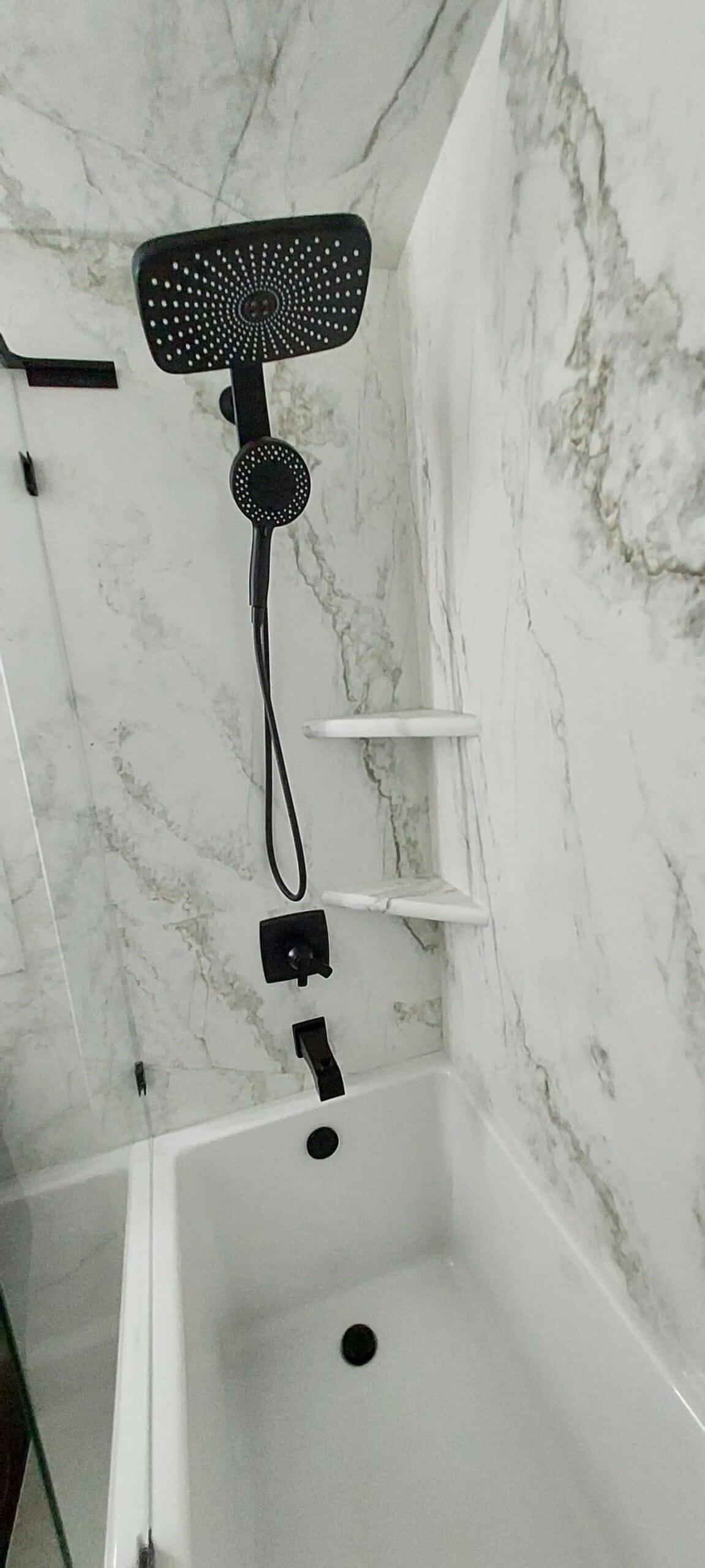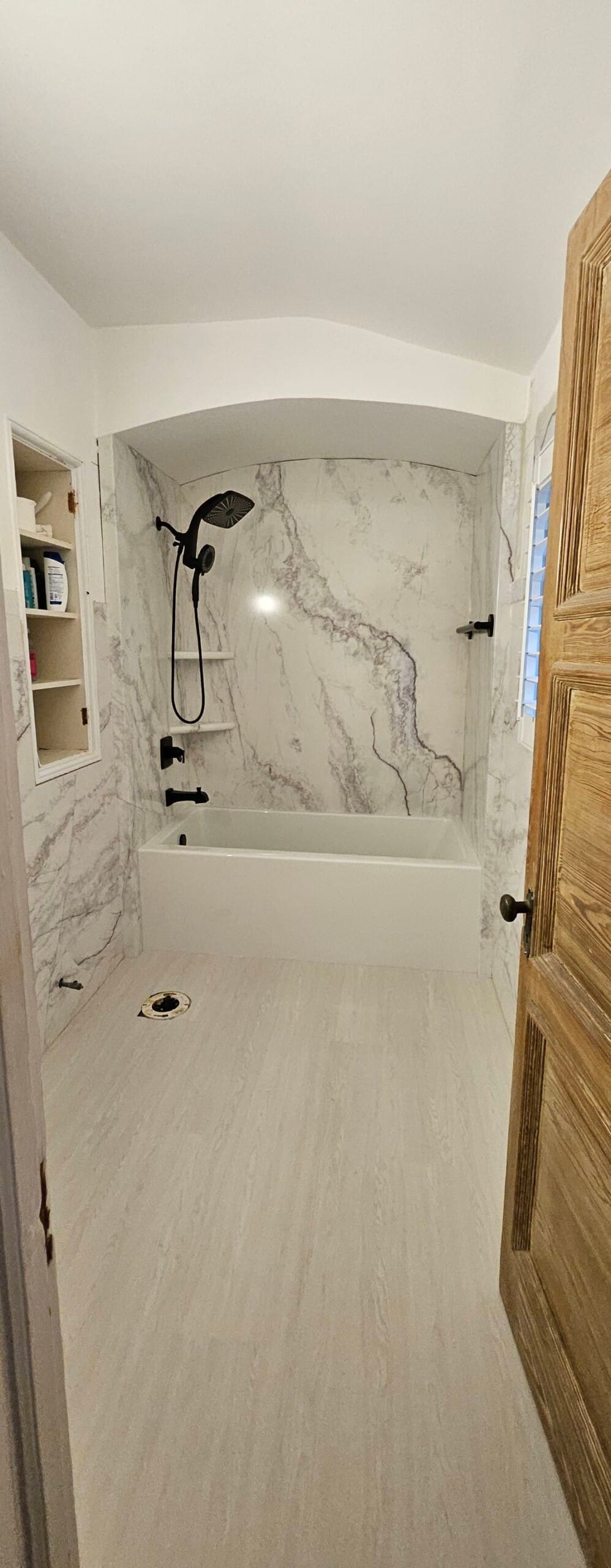 Installation included a complete demolition of the existing tub and tile surround, followed by backer board reinforcement and updated in-wall plumbing for modern fixture compatibility. The new bathtub was installed with a solid-surface wall system in a stone-look pattern, spanning the full height of the alcove and wrapping into adjacent trim. Additional updates visible in the completed space included a floating vanity, matte black toilet, and open shelving with marble tops for continuity. The remodel was completed over multiple days due to integrated flooring updates and fixture coordination.