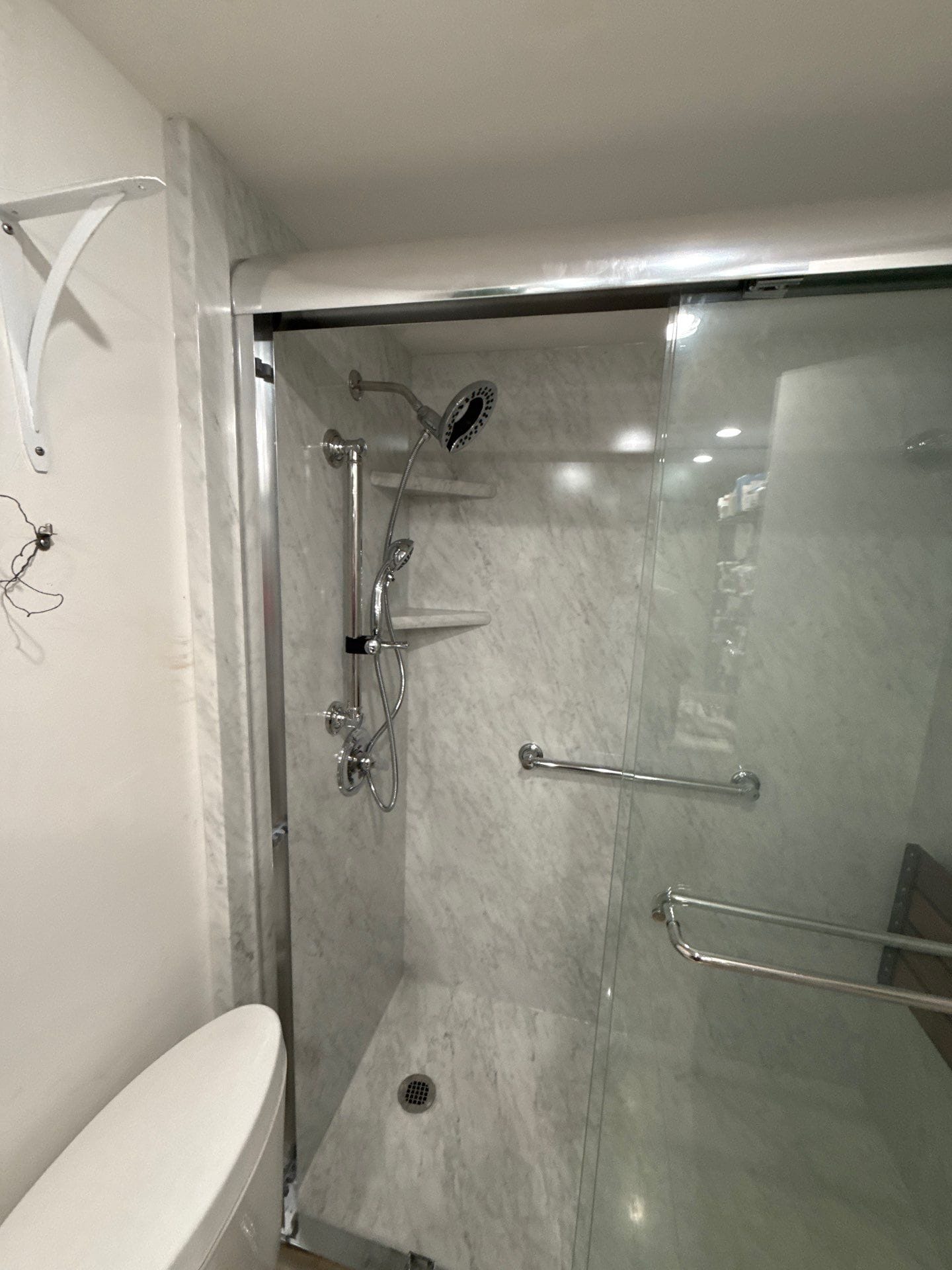 The Representative from Five Star Bath Solutions presented a grout-free wall system designed to eliminate common issues associated with traditional tile, including mold buildup and water intrusion. The updated design features light marble-pattern wall panels paired with chrome hardware, aligning with the customer’s preference for a brighter and more modern aesthetic. The system includes integrated shelving for storage, a multi-function handheld shower system mounted on a vertical slide bar, and a secure fold-down bench for seated use. Multiple grab bars were incorporated to enhance stability and support, and a clear sliding glass enclosure replaced the older framed unit to improve both accessibility and visual openness.