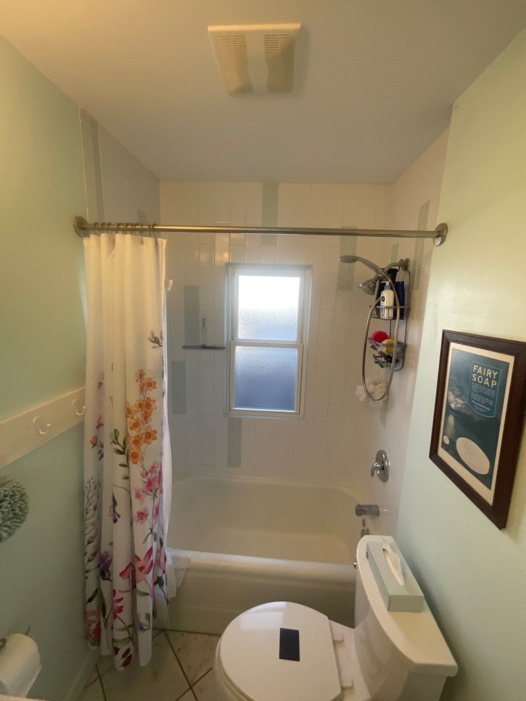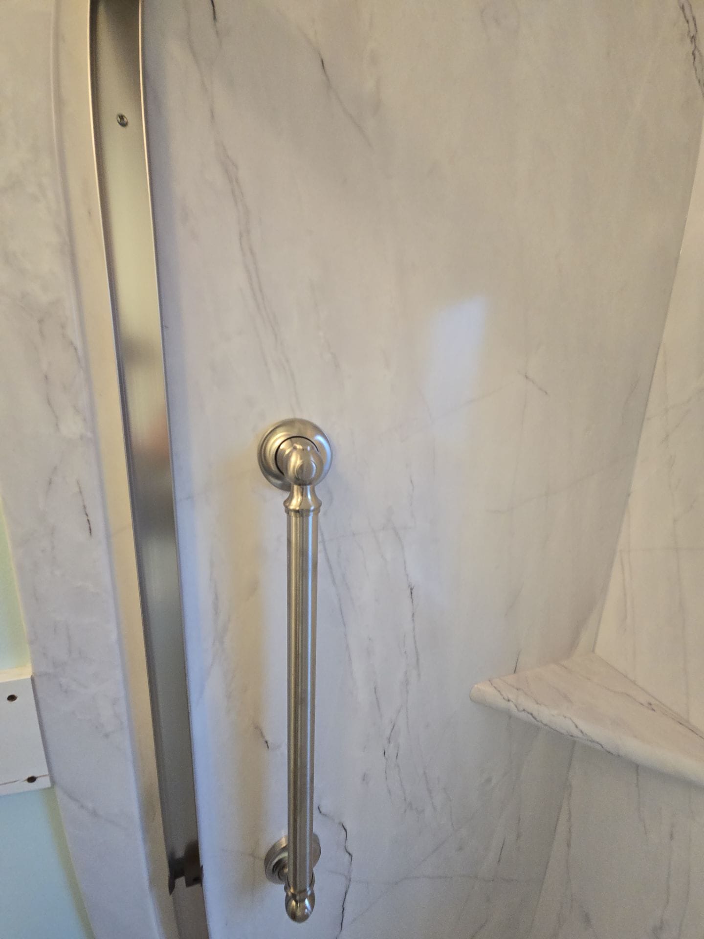 The Five Star Bath Solutions representative presented a grout-free composite wall system designed to be non porous, antimicrobial, and low maintenance. The finished shower features white marble-pattern wall panels that extend around the existing window, maintaining natural light while providing a seamless waterproof surround. A chrome Delta handheld shower system was installed for flexibility, along with a built-in recessed niche for storage and a corner shelf for additional organization. Two stainless steel grab bars were strategically mounted, including a vertical entry bar and a horizontal support bar, reinforcing safety while preserving a clean appearance. A sliding glass bypass door replaced the previous curtain to improve water containment and accessibility.