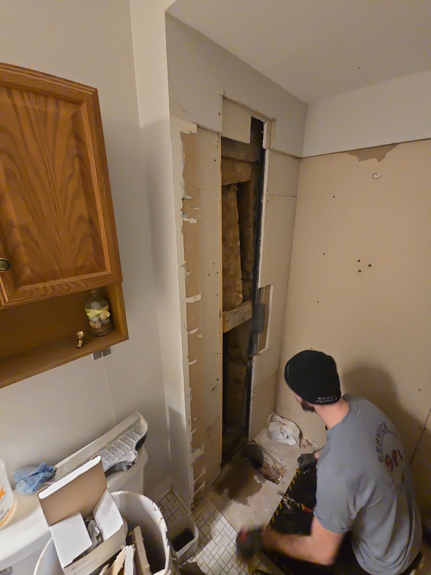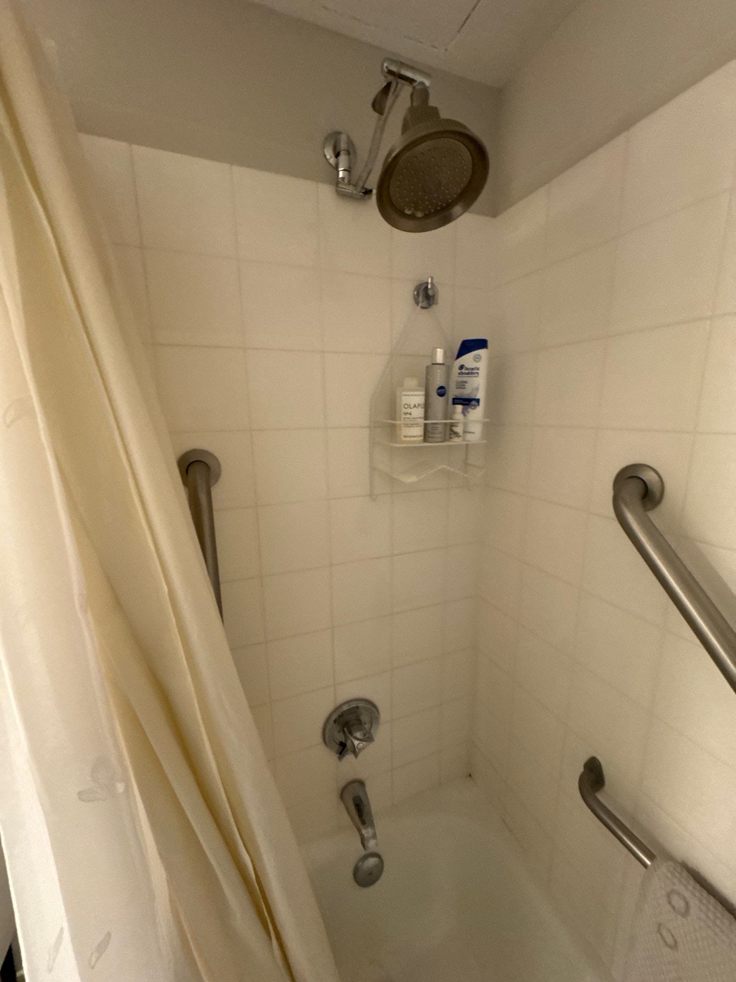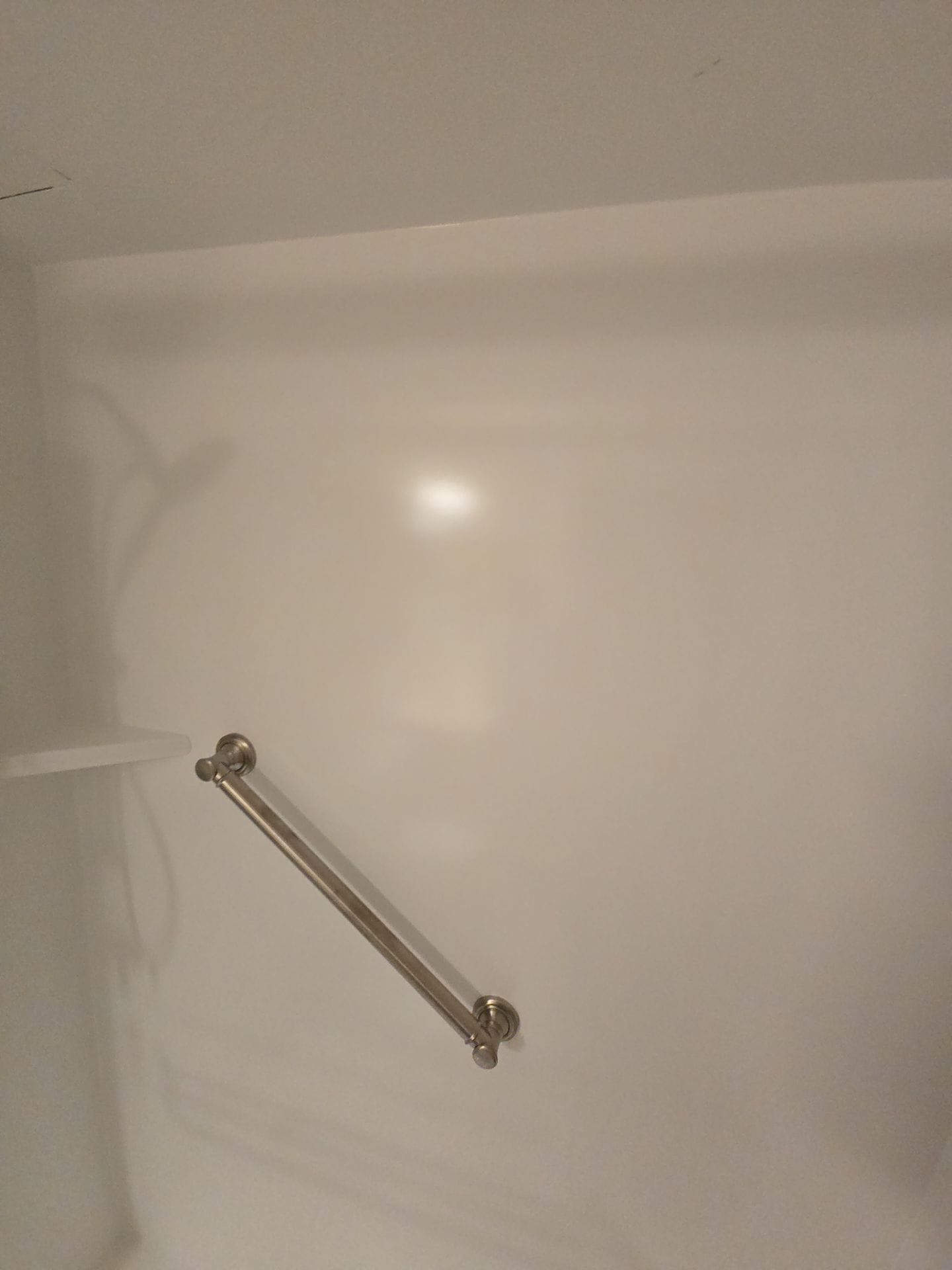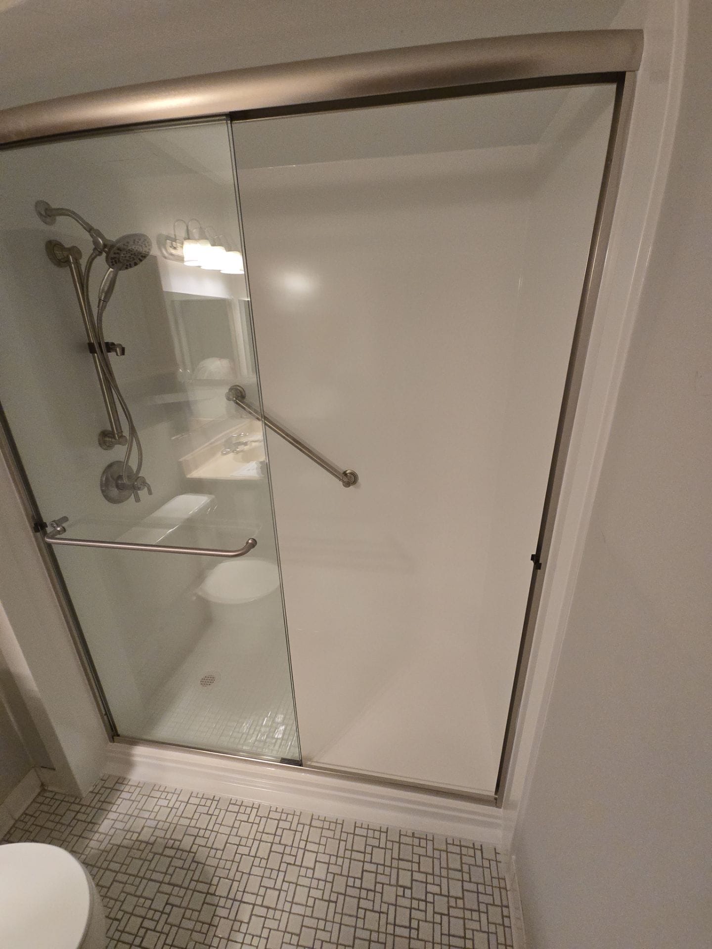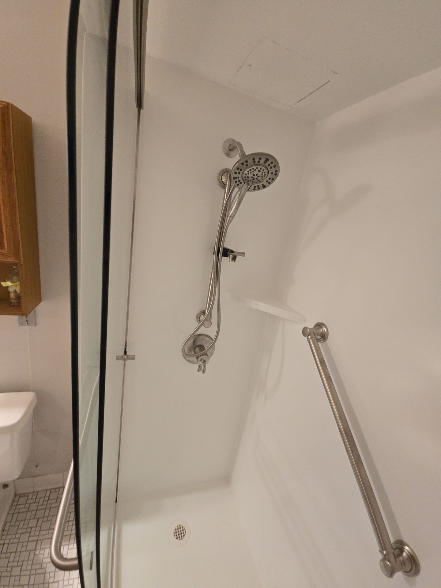 Installation was completed by a certified bathroom-only crew following full demolition down to the studs. Wall insulation was replaced, mold remediation performed, and custom bracing added behind all grab bar and shelf placements. Four corner shelves and three strategically placed grab bars were installed to provide ample storage and stability. Frameless glass doors with bronze hardware were mounted to ensure easy cleaning and reduced water splash. A new high-efficiency toilet, provided by the customer, was also installed as part of the remodel agreement. The existing layout was preserved to minimize plumbing changes while fully upgrading the appearance and function of the space.