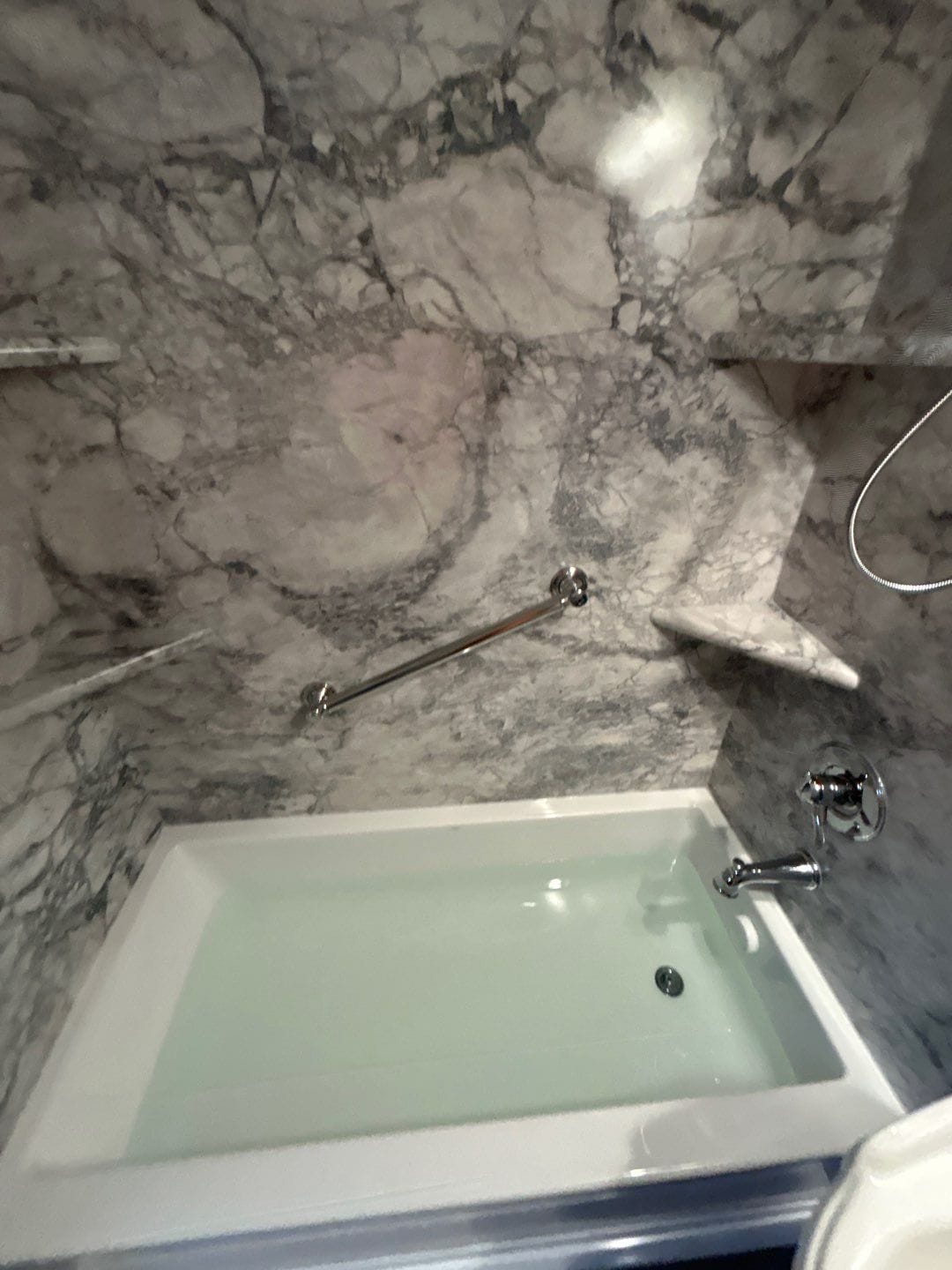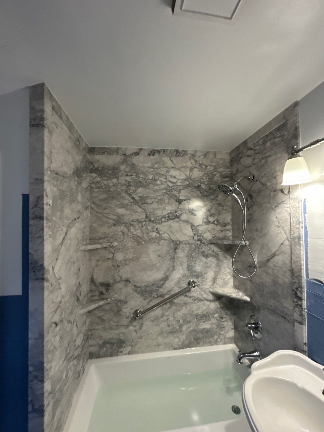 Tabitha Lambert, the Five Star Bath Solutions representative, recommended the Smart Choice package. This included grout-free six-layer composite wall panels with antimicrobial properties to resist mildew and mold. The surface required no aggressive cleaners and provided a natural stone appearance without the upkeep of tile. The wall system was installed over a patented Shower Shield backer board, designed to be 100% waterproof and reinforced for long-term durability. All seams were sealed once with marine-grade silicone to prevent future resealing and moisture intrusion.