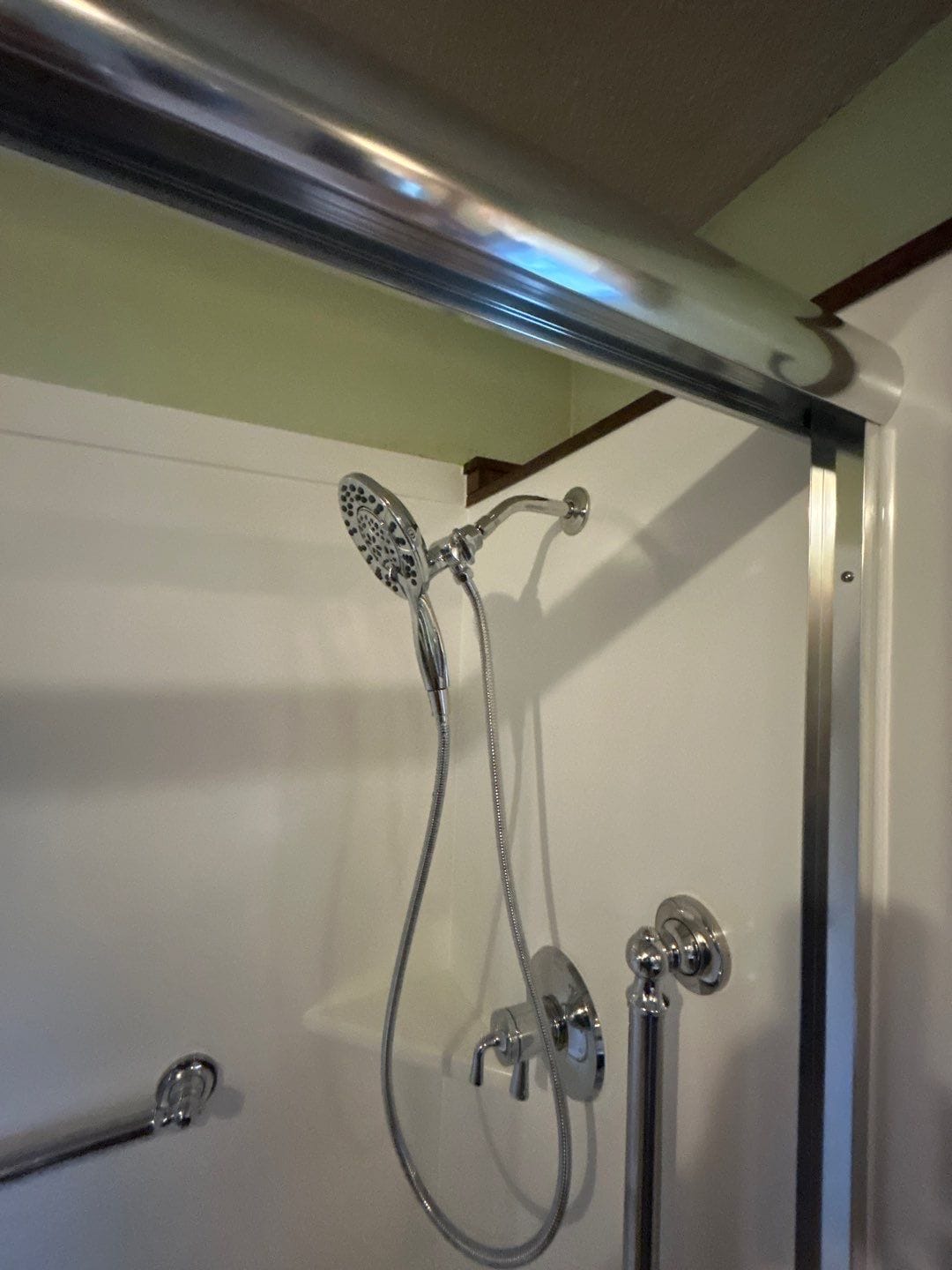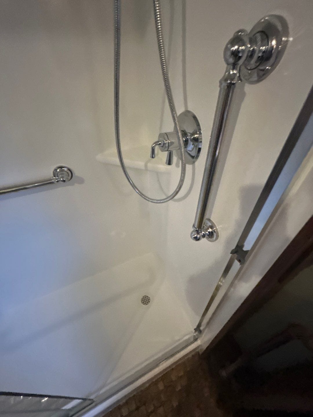 The Five Star Bath Solutions representative presented a Smart Choice wall system featuring smooth, non-porous, antimicrobial composite panels. The customer selected a clean white finish to brighten the space, while modern chrome fixtures were paired to create contrast and elevate the updated design. Accessibility was addressed through the inclusion of dual safety grab bars, a detachable handheld showerhead, and frameless sliding glass doors for improved entry and exit.