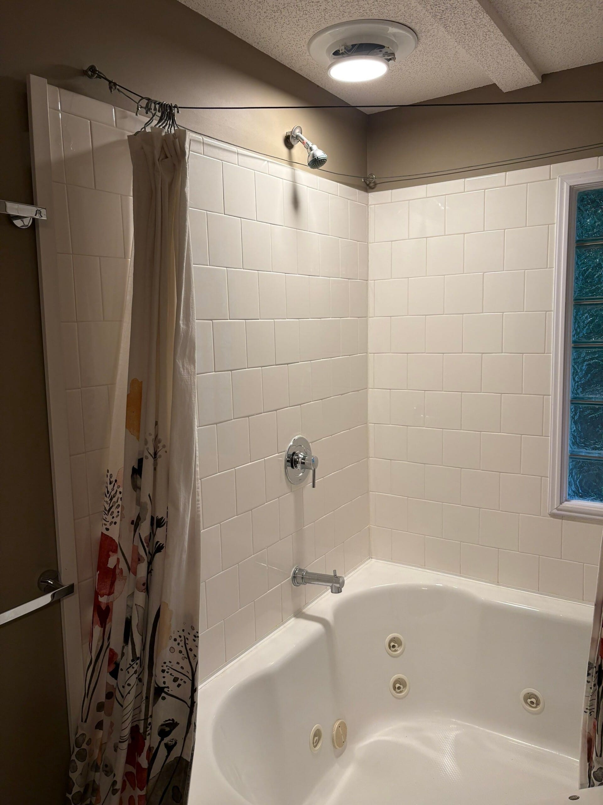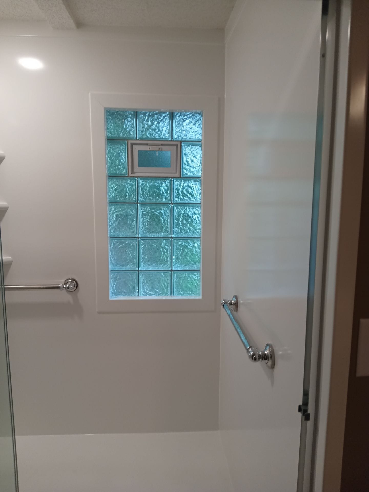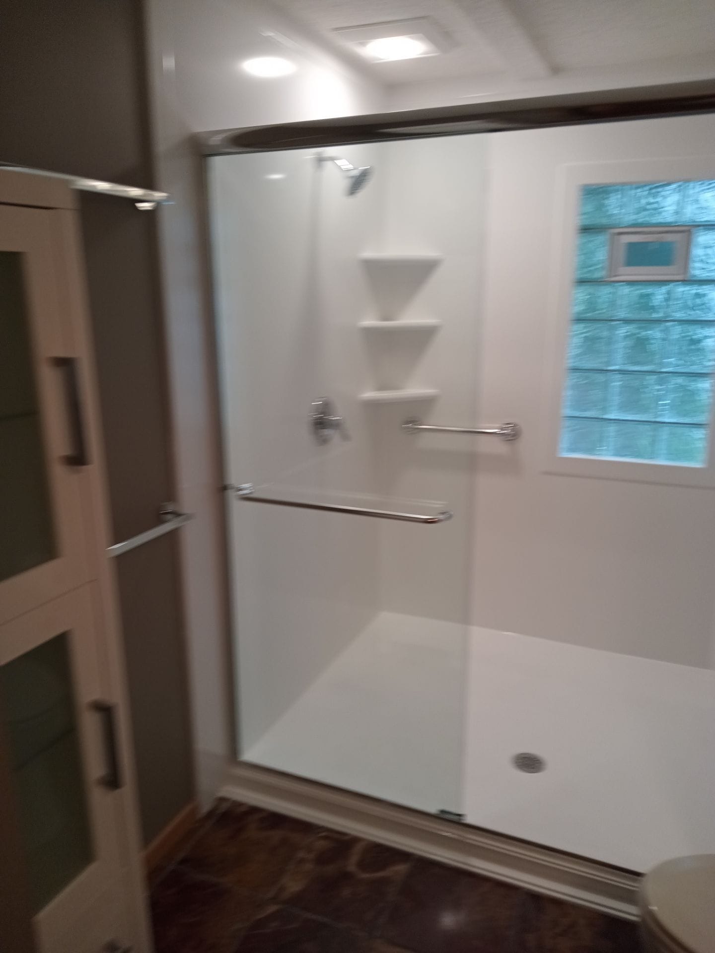 The remodel replaced the large corner jetted tub and tiled surround with a low-threshold, full-length walk-in shower. The new wall system features smooth, light-toned panels consistent with the Frost option discussed, offering a clean, bright appearance. Three corner shelves were installed along with a soap ledge to meet the customer’s storage requirements. Brushed nickel grab bars were mounted on both the main and side walls, and a simple single shower head was installed in brushed nickel. A clear barn-style glass door now encloses the shower area, replacing the curtain rod system, resulting in a cleaner and more accessible entry point. The original floor and cabinetry remained, integrating well with the new shower.