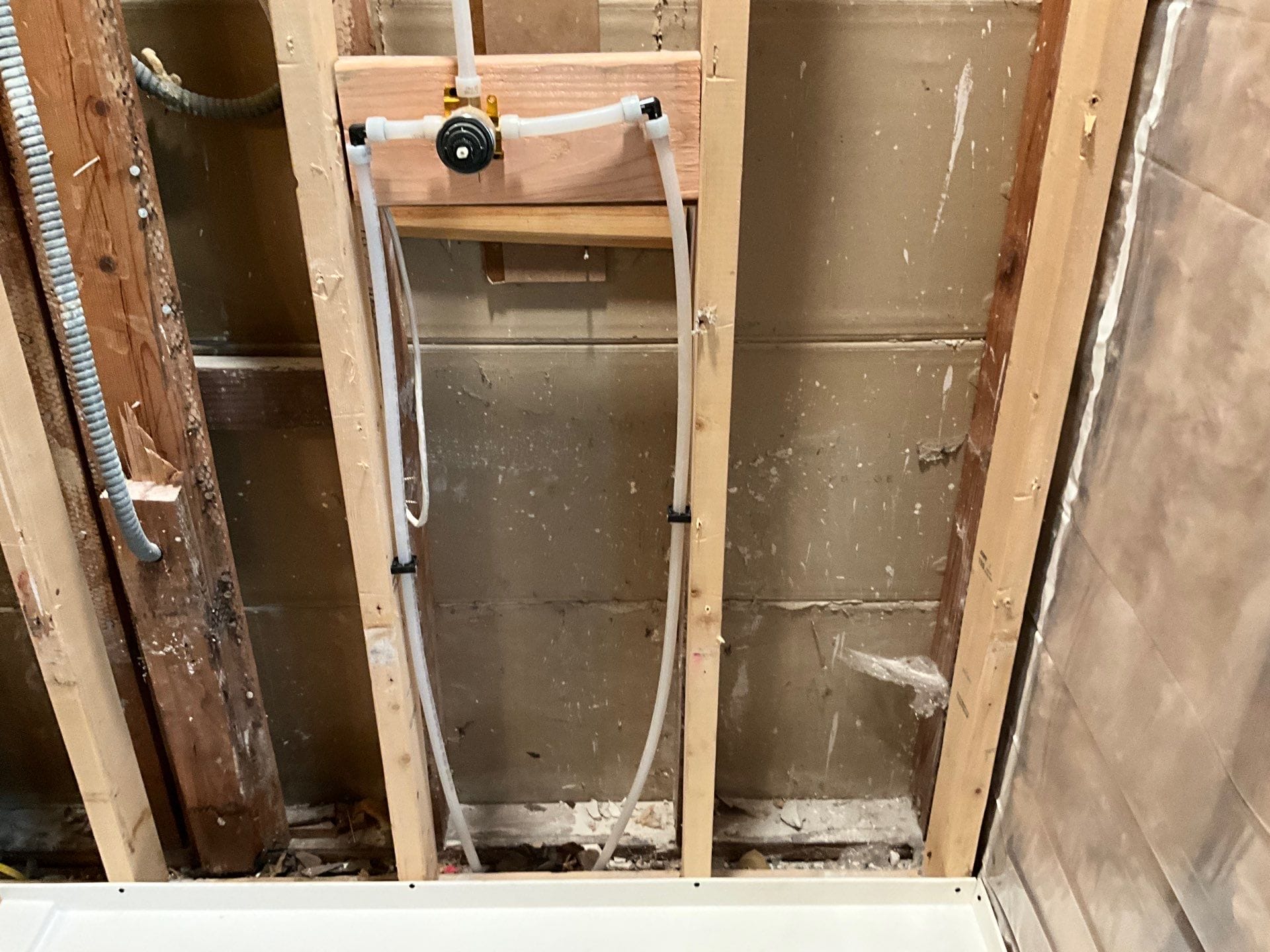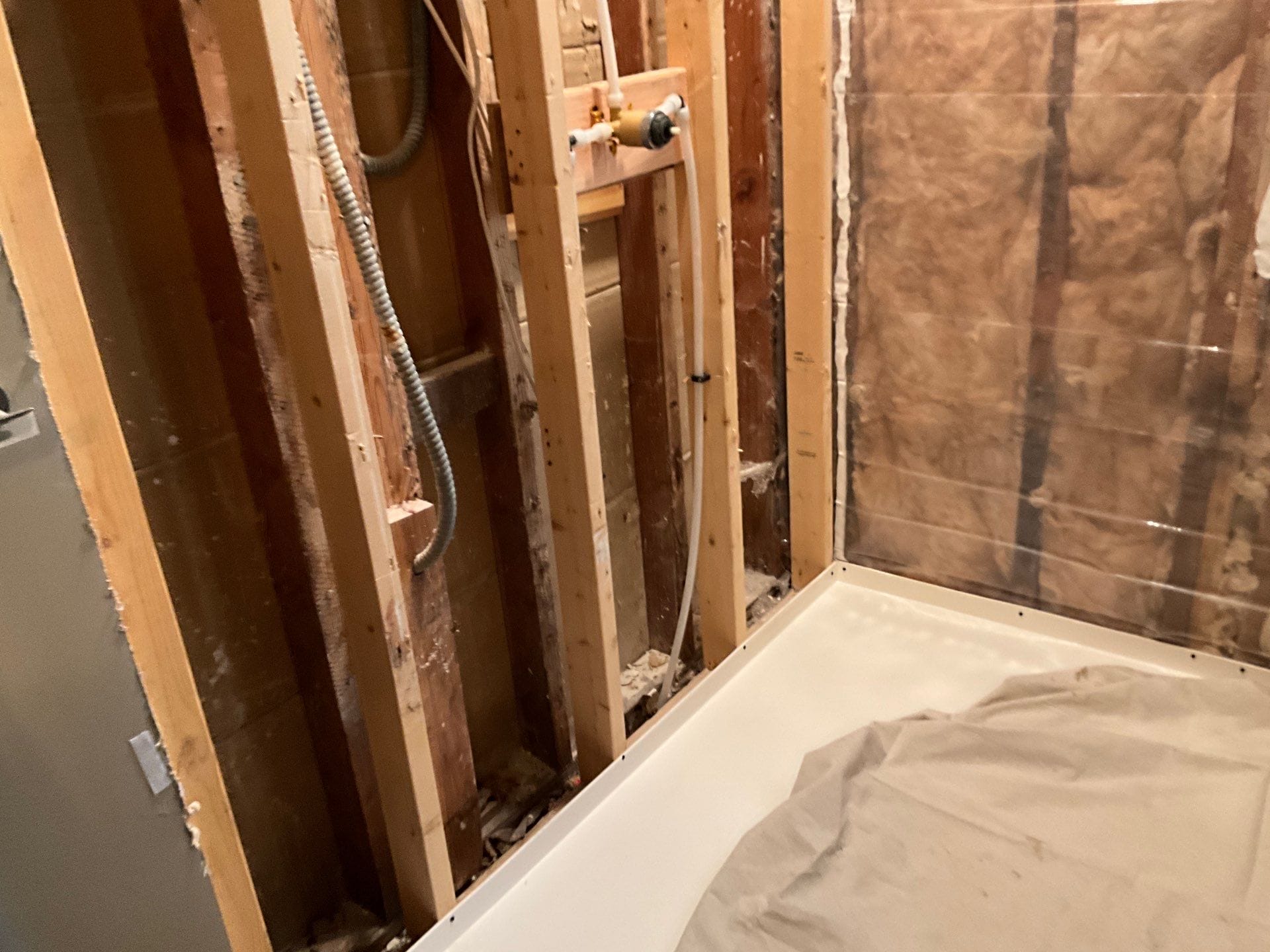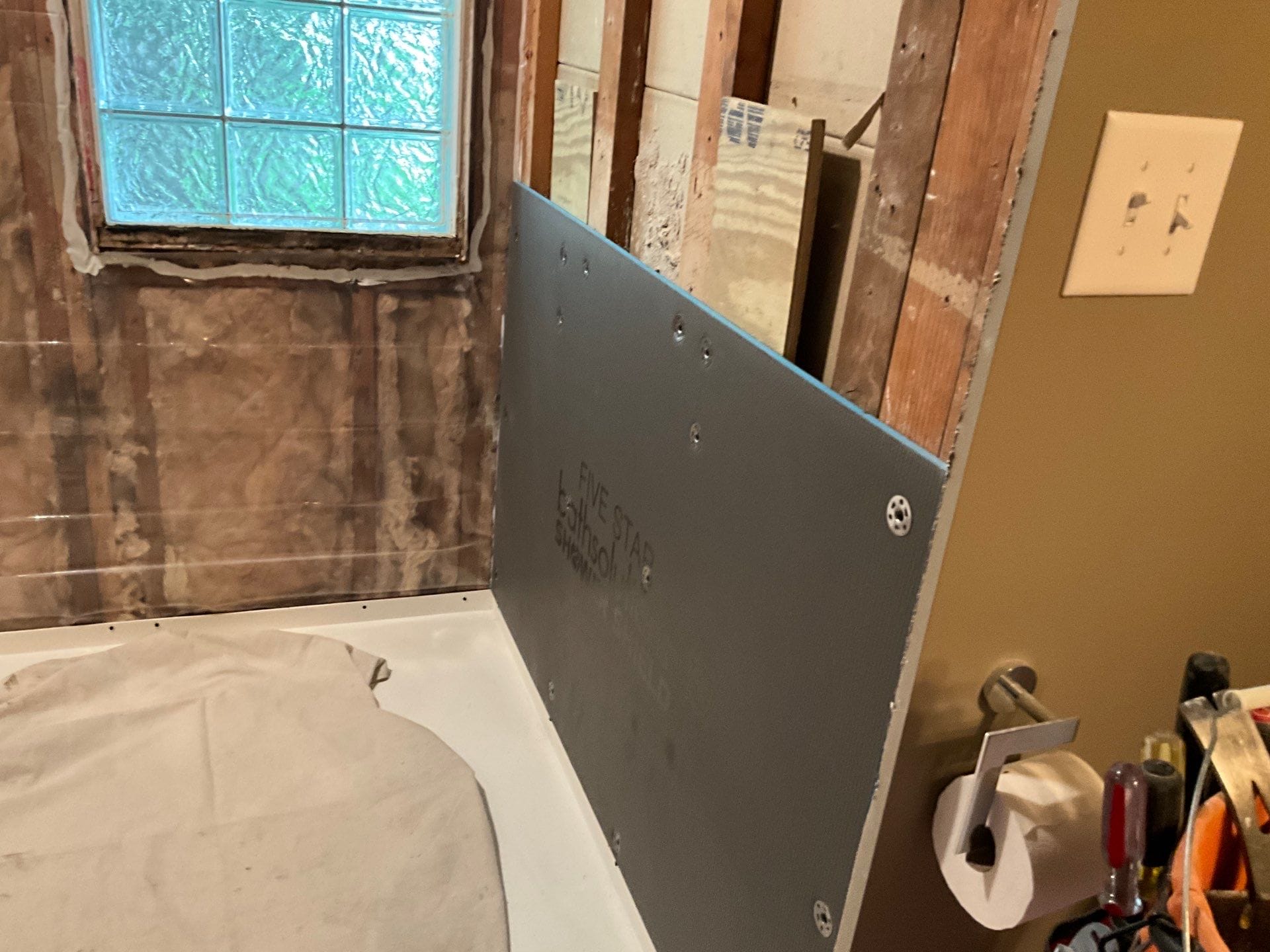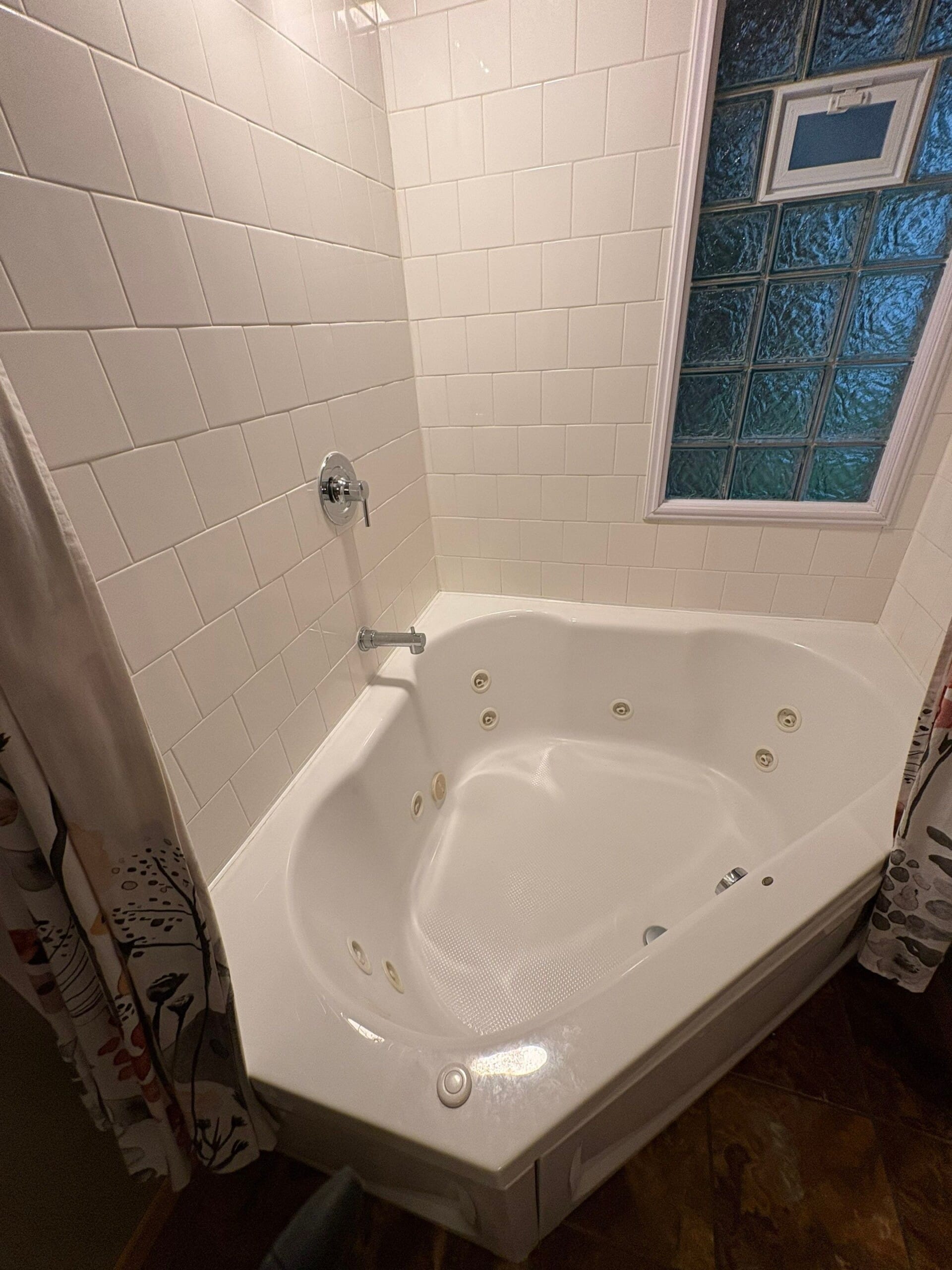 The remodel replaced the large corner jetted tub and tiled surround with a low-threshold, full-length walk-in shower. The new wall system features smooth, light-toned panels consistent with the Frost option discussed, offering a clean, bright appearance. Three corner shelves were installed along with a soap ledge to meet the customer’s storage requirements. Brushed nickel grab bars were mounted on both the main and side walls, and a simple single shower head was installed in brushed nickel. A clear barn-style glass door now encloses the shower area, replacing the curtain rod system, resulting in a cleaner and more accessible entry point. The original floor and cabinetry remained, integrating well with the new shower.
