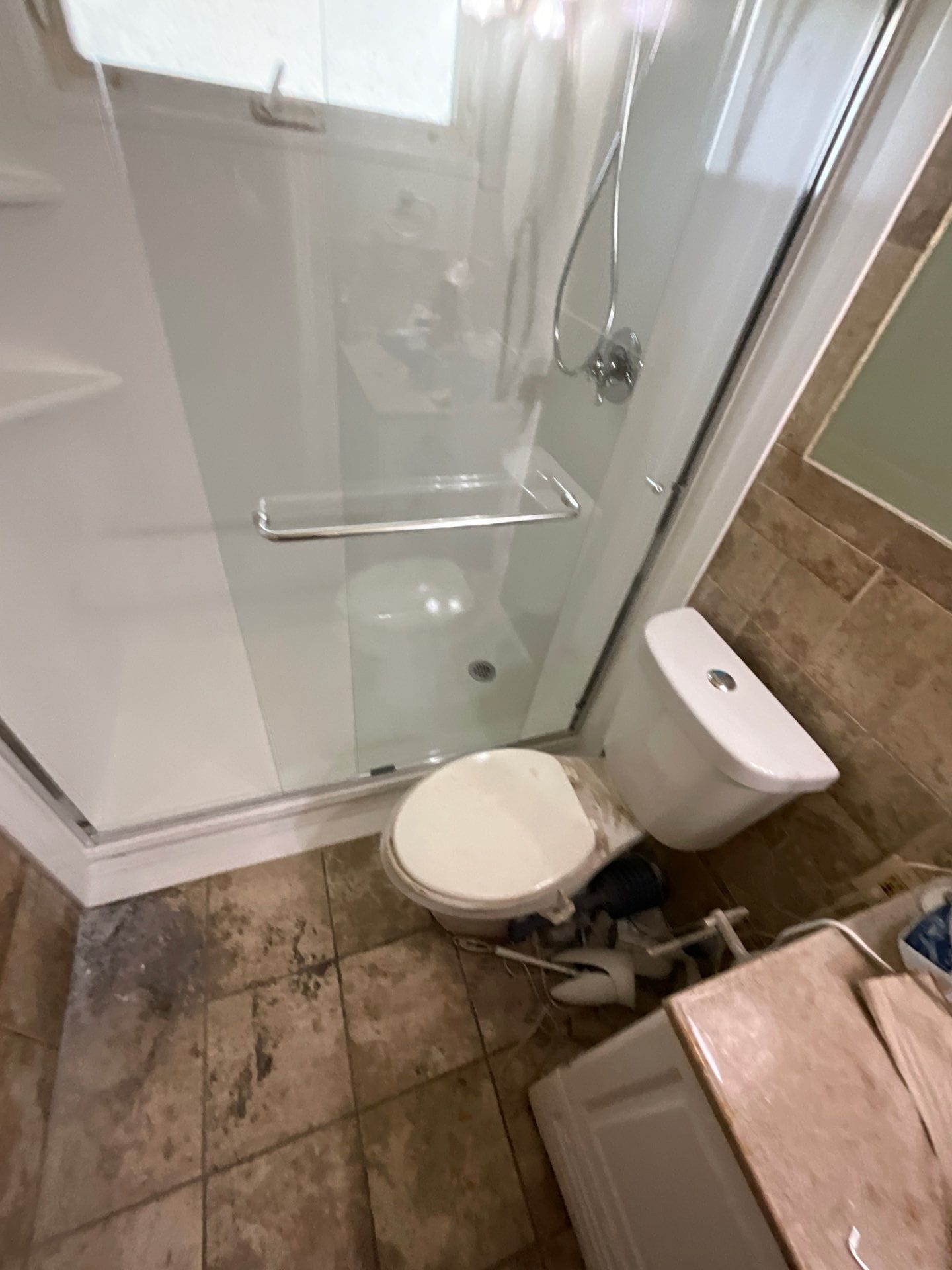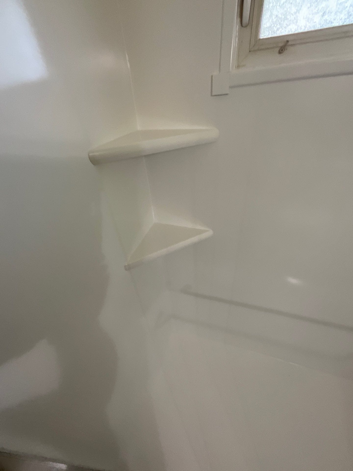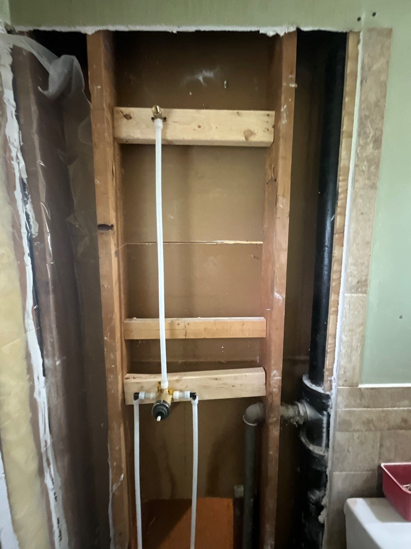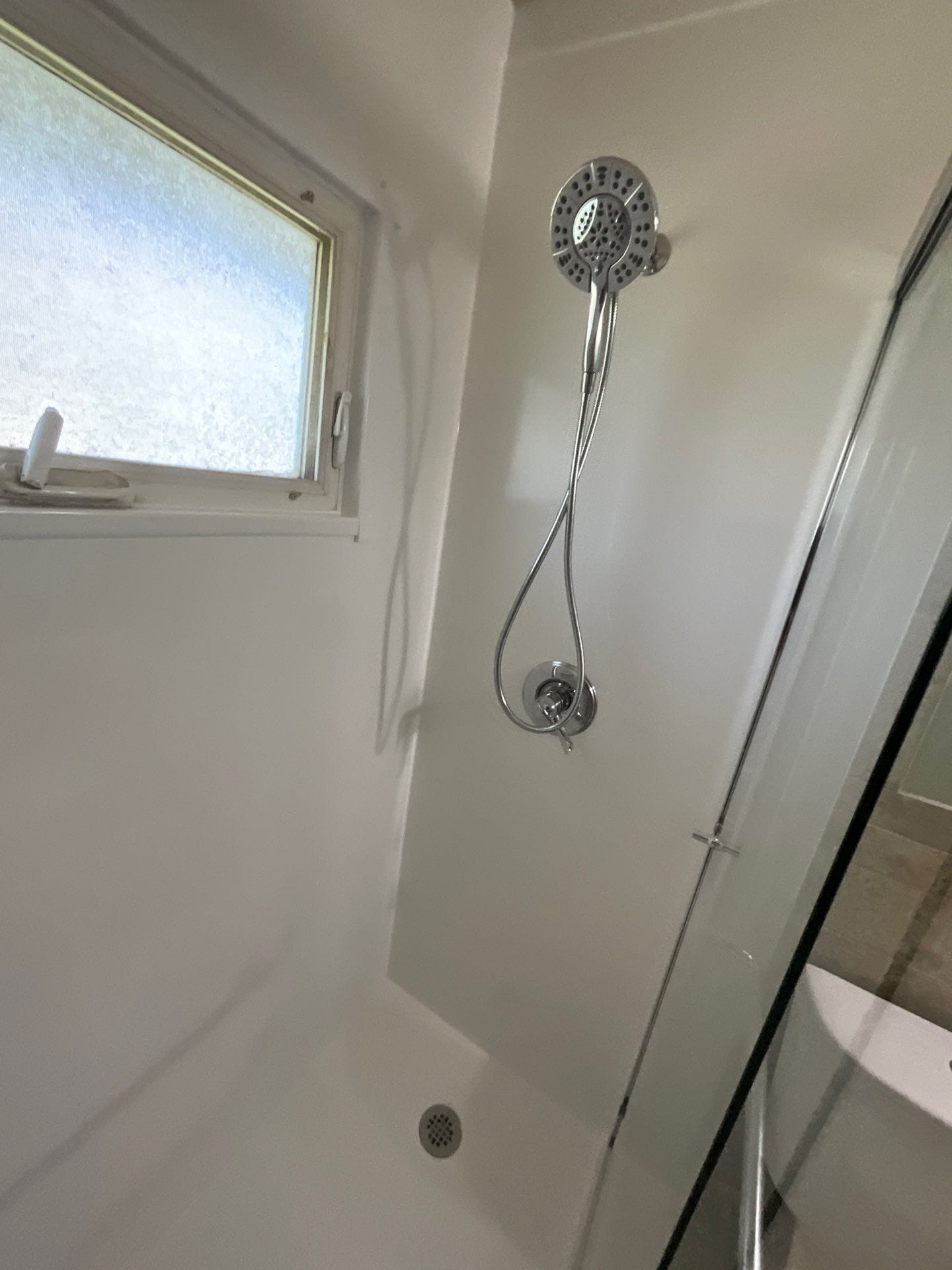 Installation included full demolition of the previous system down to the studs, inspection of the framing, repair of water-damaged sections, and complete plumbing replacement with PEX piping. The new wall system was fitted precisely to the space, reaching full ceiling height to ensure a watertight seal. The project was completed by licensed, insured, and background-checked Five Star employees. Installation was projected to take two to three days, with materials arriving in six to eight weeks based on current fulfillment timelines.