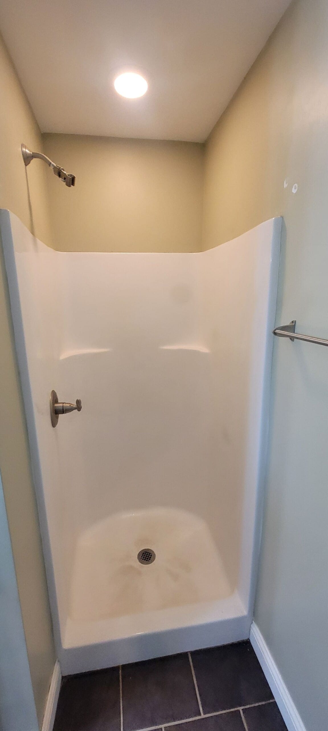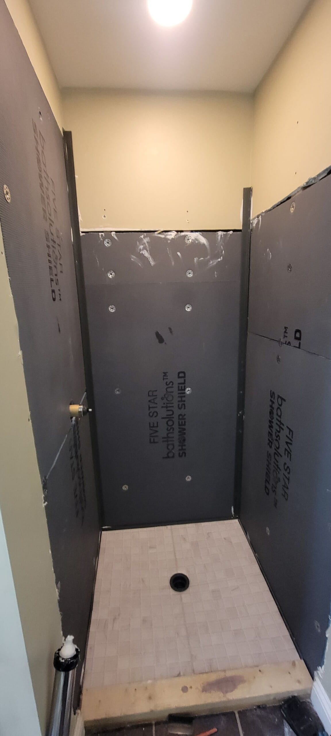 Installation included full demolition to the studs, removal of the original single-piece molded unit, inspection for any signs of moisture damage, and replacement of plumbing lines with PEX. Centrel panels in a marble pattern were then secured over ShowerShield board and sealed thoroughly at all transitions. A new handheld fixture in brushed nickel was installed, and two corner shelves were added for storage. At the time of photography, glass installation was pending final measurement and fabrication, as is standard with custom door systems.