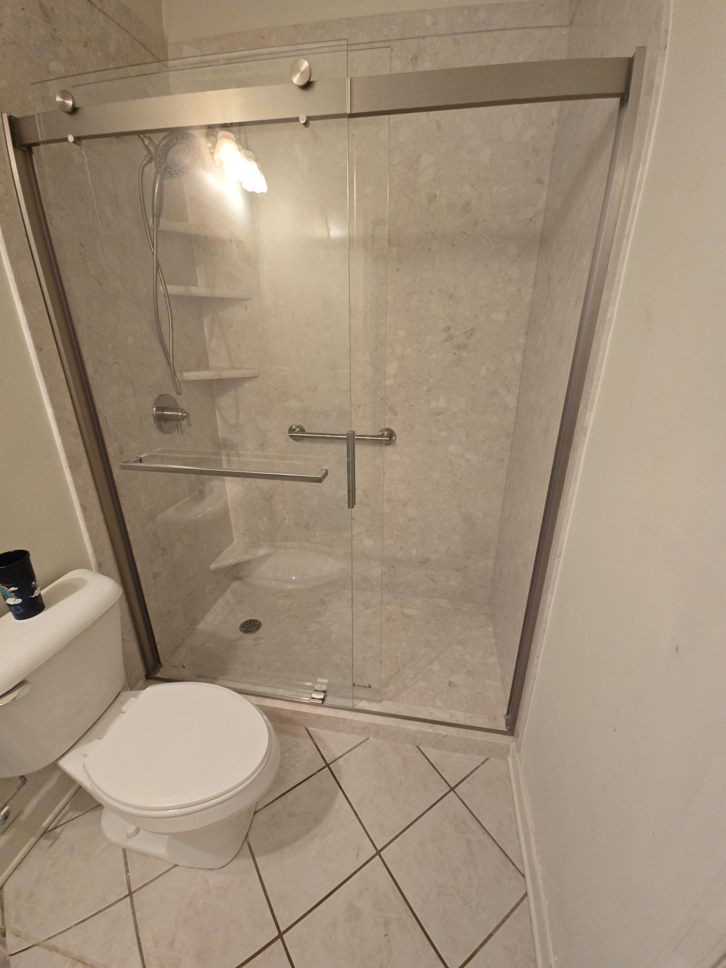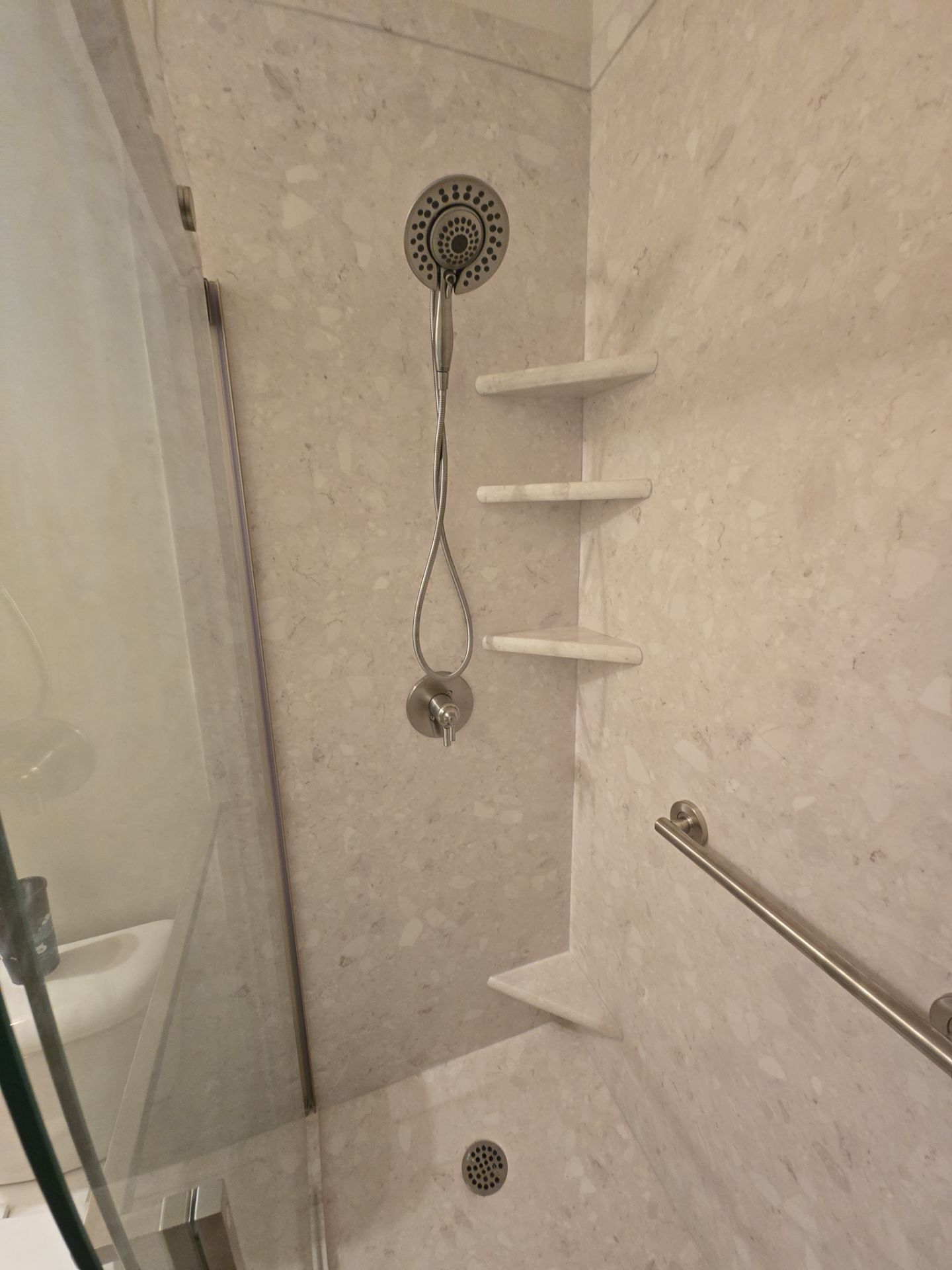 Installation involved full demolition to the studs and subfloor, moisture inspection, and plumbing updates using PEX to replace any outdated lines. A commercial-grade waterproofing system was applied using ShowerShield backer board and silicone sealants. The custom wall panels and base were fit to the customer’s exact space. Fixture locations and shelving were adjusted per preference. The frameless glass was measured post-installation and installed during a second visit. Estimated production timing was six to eight weeks, with two to three days scheduled for on-site construction and finishing.