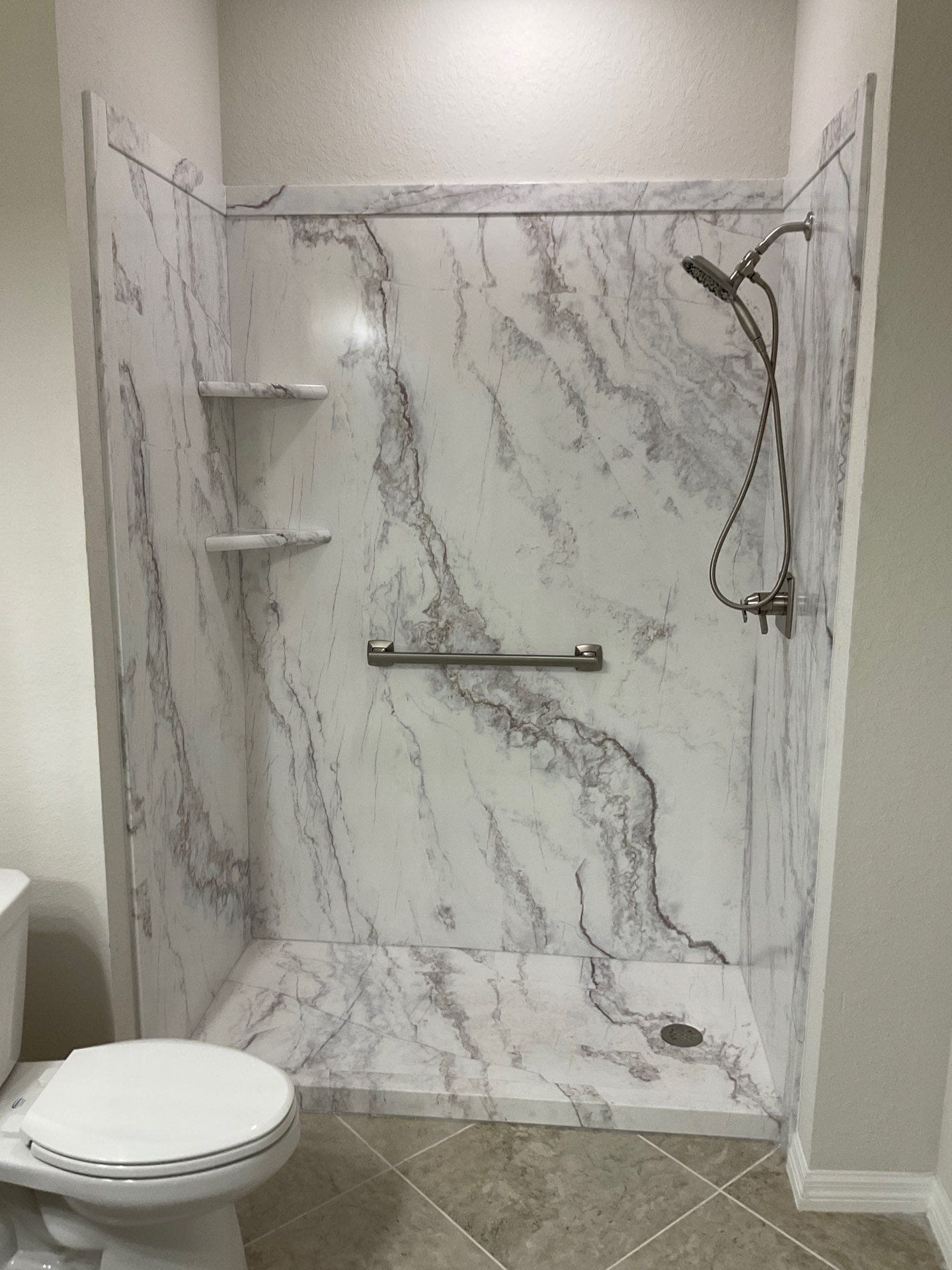 The Five Star Bath Solutions representative presented a grout free composite wall system in a white marble pattern with natural gray veining, extending from the base to the ceiling. Brushed nickel fixtures were selected, including a wall mounted showerhead and a handheld wand with a single control valve. One recessed wall niche was incorporated for storage to maintain a minimalist appearance. A horizontal grab bar was installed across the sliding glass door, and a second grab bar was positioned along the interior wall for added stability. The clear sliding glass enclosure with brushed nickel hardware preserves light and keeps the space feeling open. The solid surface shower base features a slip resistant finish for enhanced safety.
