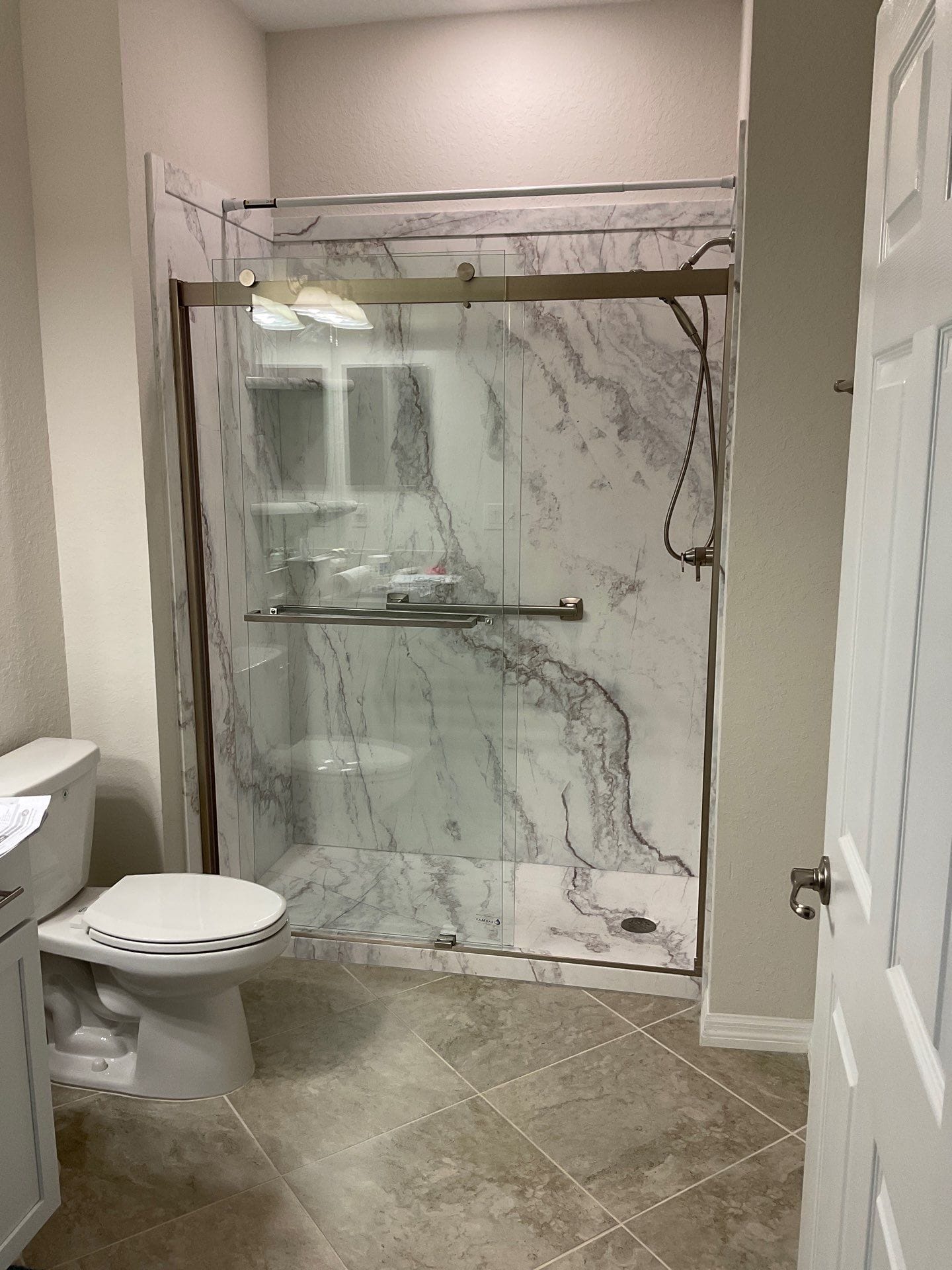 Installation included full demolition of the existing tub and wall materials, preparation of framing, and installation of a waterproof backing system. Plumbing components were updated and aligned with the new valve and shower configuration. The custom shower base was fitted to the existing drain location, and large wall panels were installed to minimize seams and reduce maintenance. Glass panels were measured and mounted for proper alignment, and all accessories were secured with reinforced backing. The in house installation team completed the remodel efficiently with debris removal and site protection throughout the process.