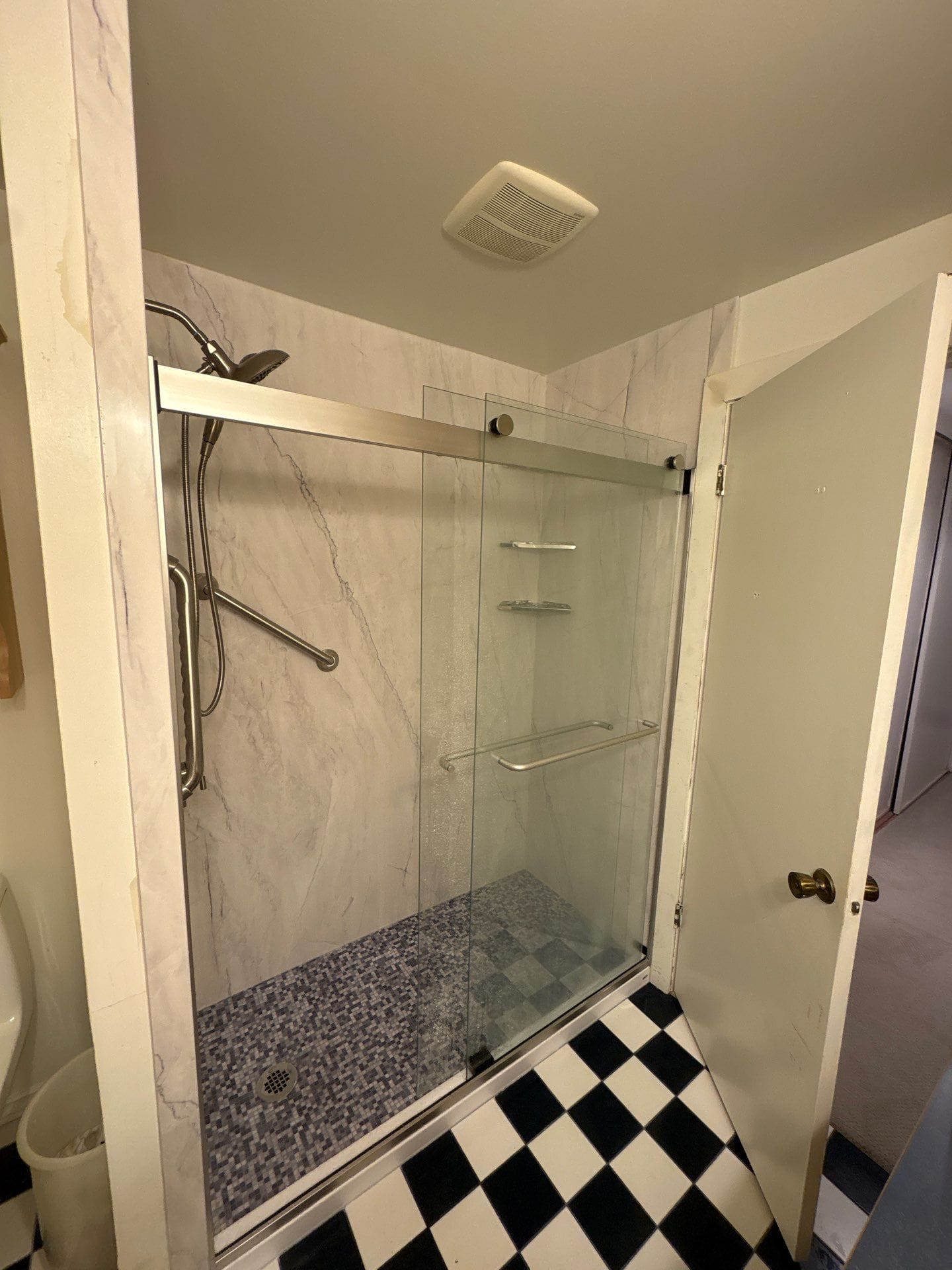 Installation involved complete demolition to the studs and the construction of a new walk-in shower base. The crew installed marble-patterned composite wall panels and a dedicated ceiling panel to provide superior moisture protection and eliminate paint maintenance. Key features included a chrome handheld showerhead on an adjustable slide bar, two corner shelves for storage, and a safety grab bar positioned on the back wall. A sliding glass door with chrome hardware was installed to enclose the space.