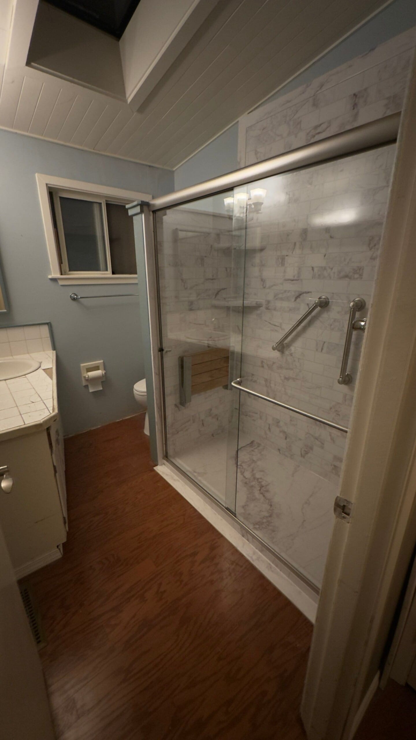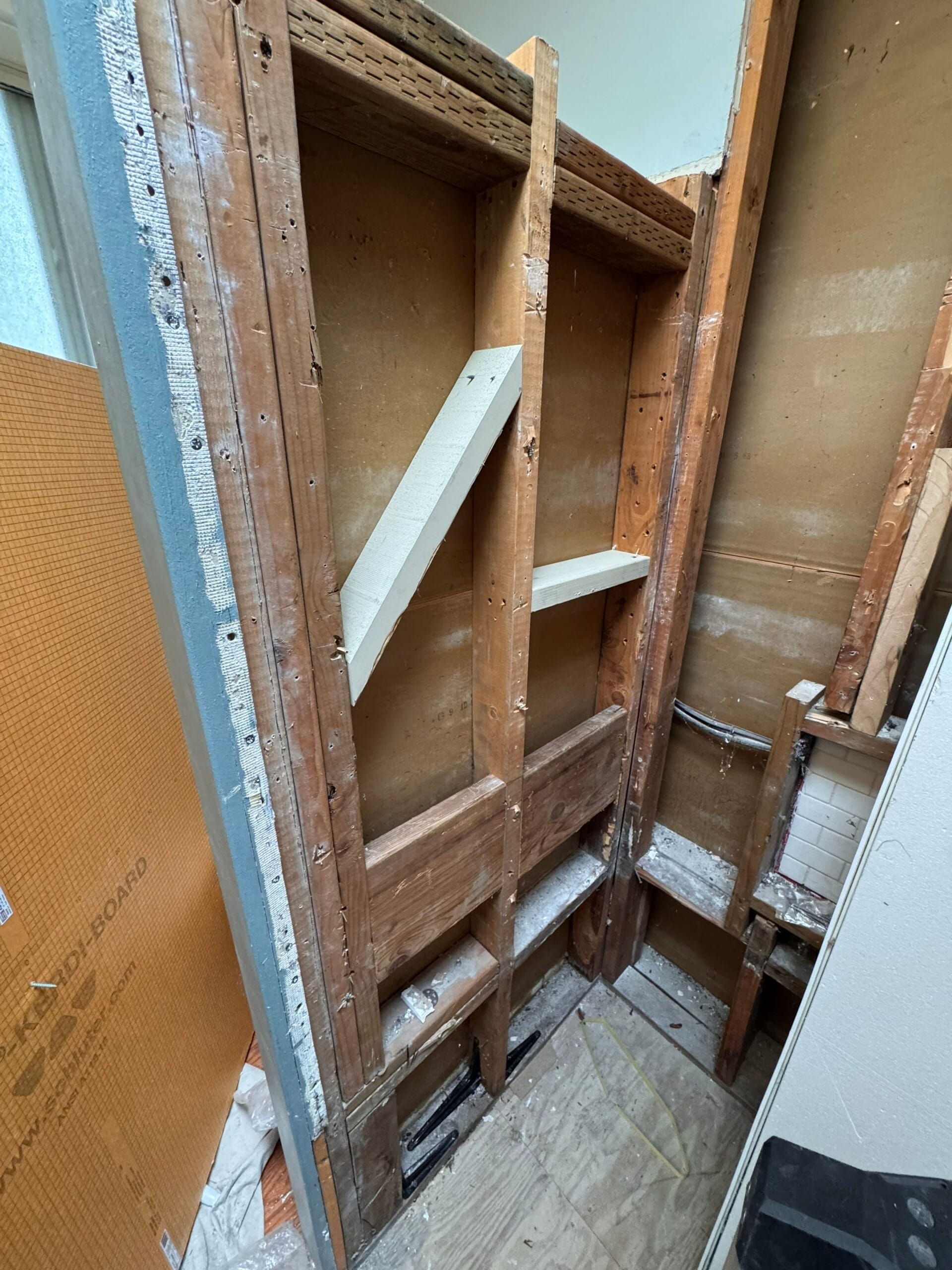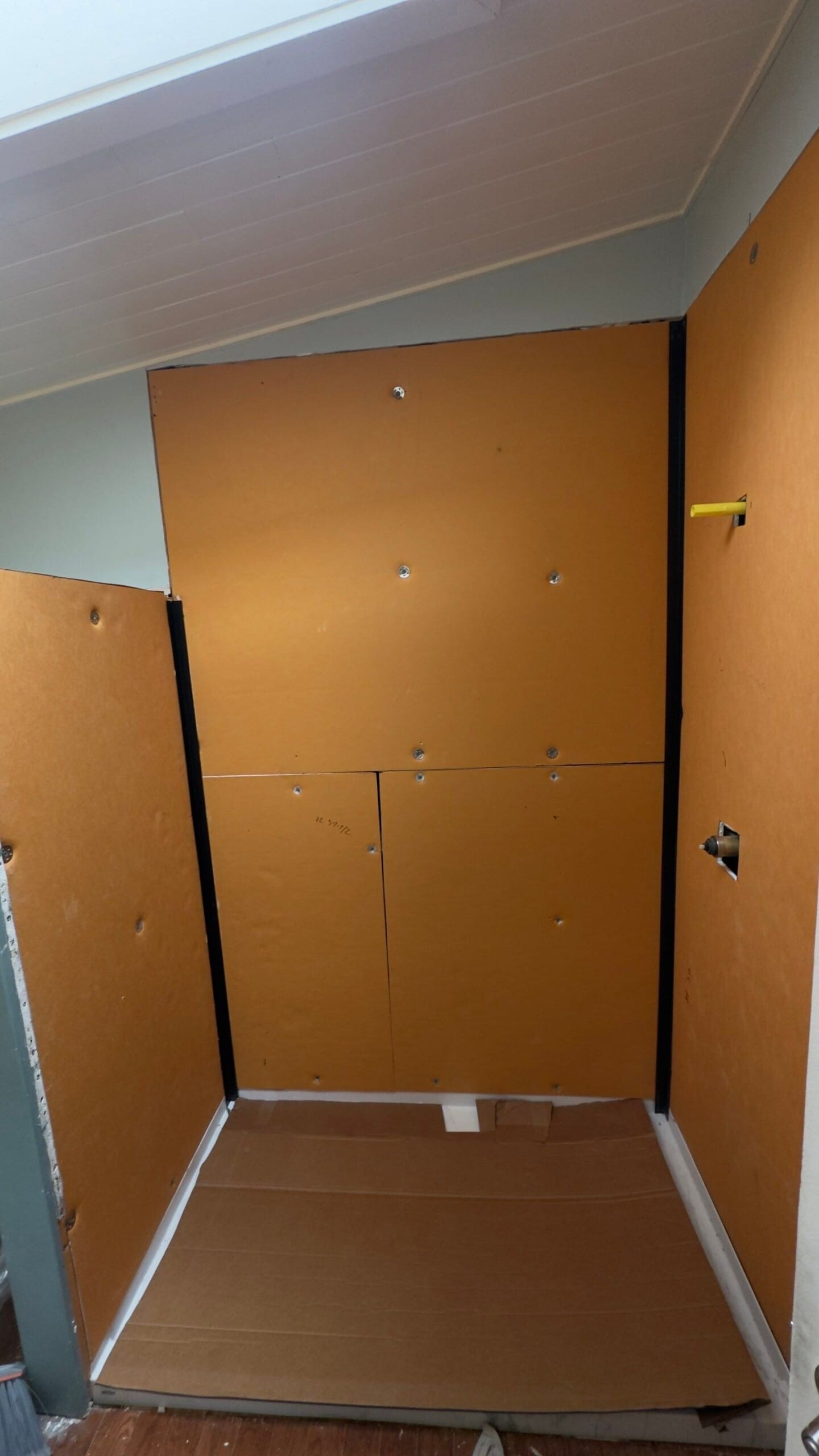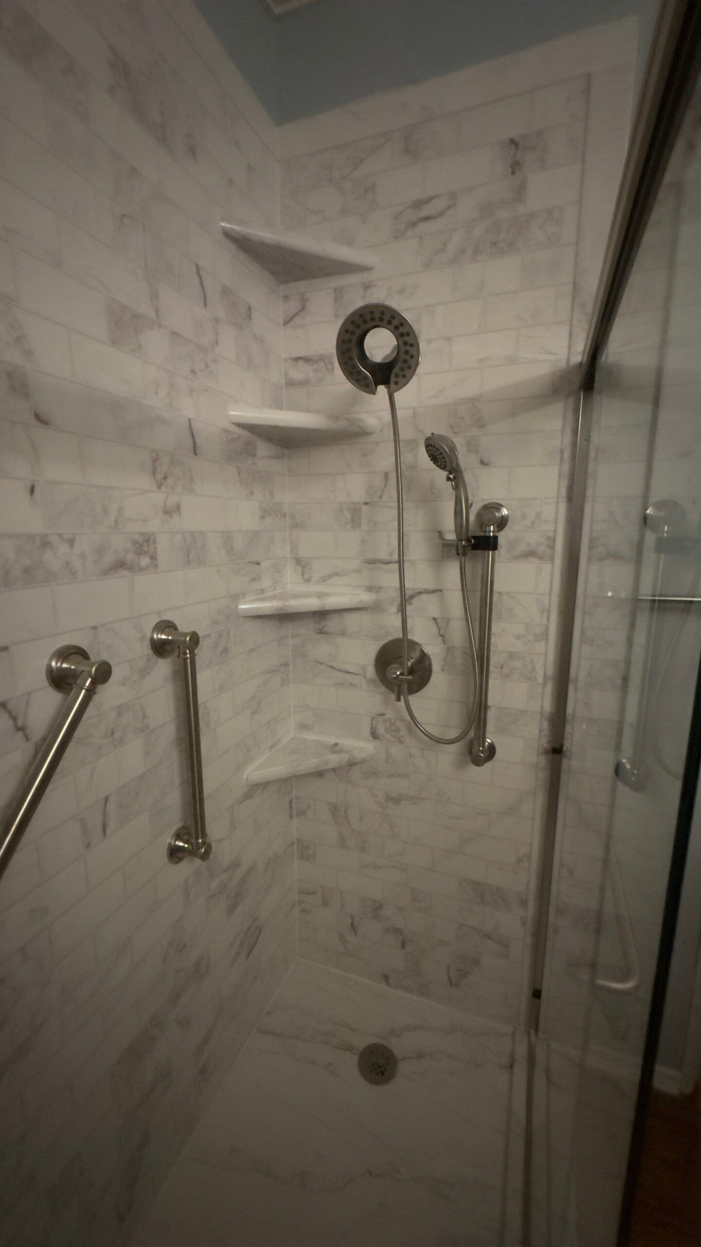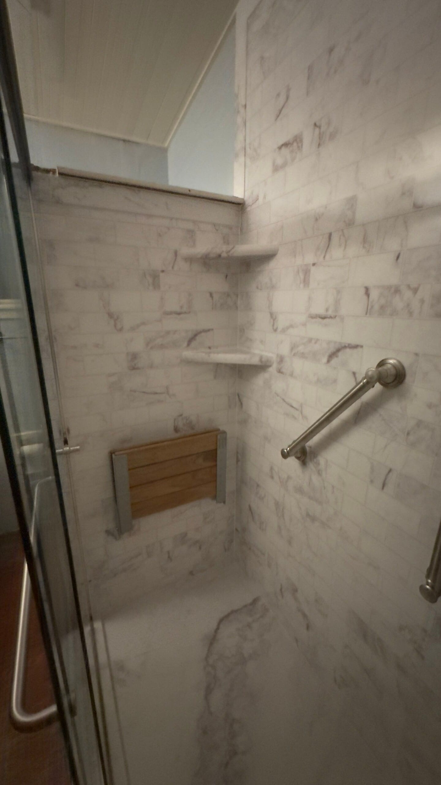 Installation included full demolition and extension of the pan, followed by ceiling-height wall panel installation with custom trim and a ceiling cap. The three corner shelves and grab bars were mounted over reinforced blocking, and the teak fold-down seat was installed for flexible seating. Brushed nickel fixtures and glass door framing were sealed using marine-grade silicone. All fixture positions were confirmed during the final measure. Installation was scheduled to begin in early July, with a two-day completion window, aligning with the customer’s travel and recovery timeline. Materials were pre-ordered to avoid delays.
