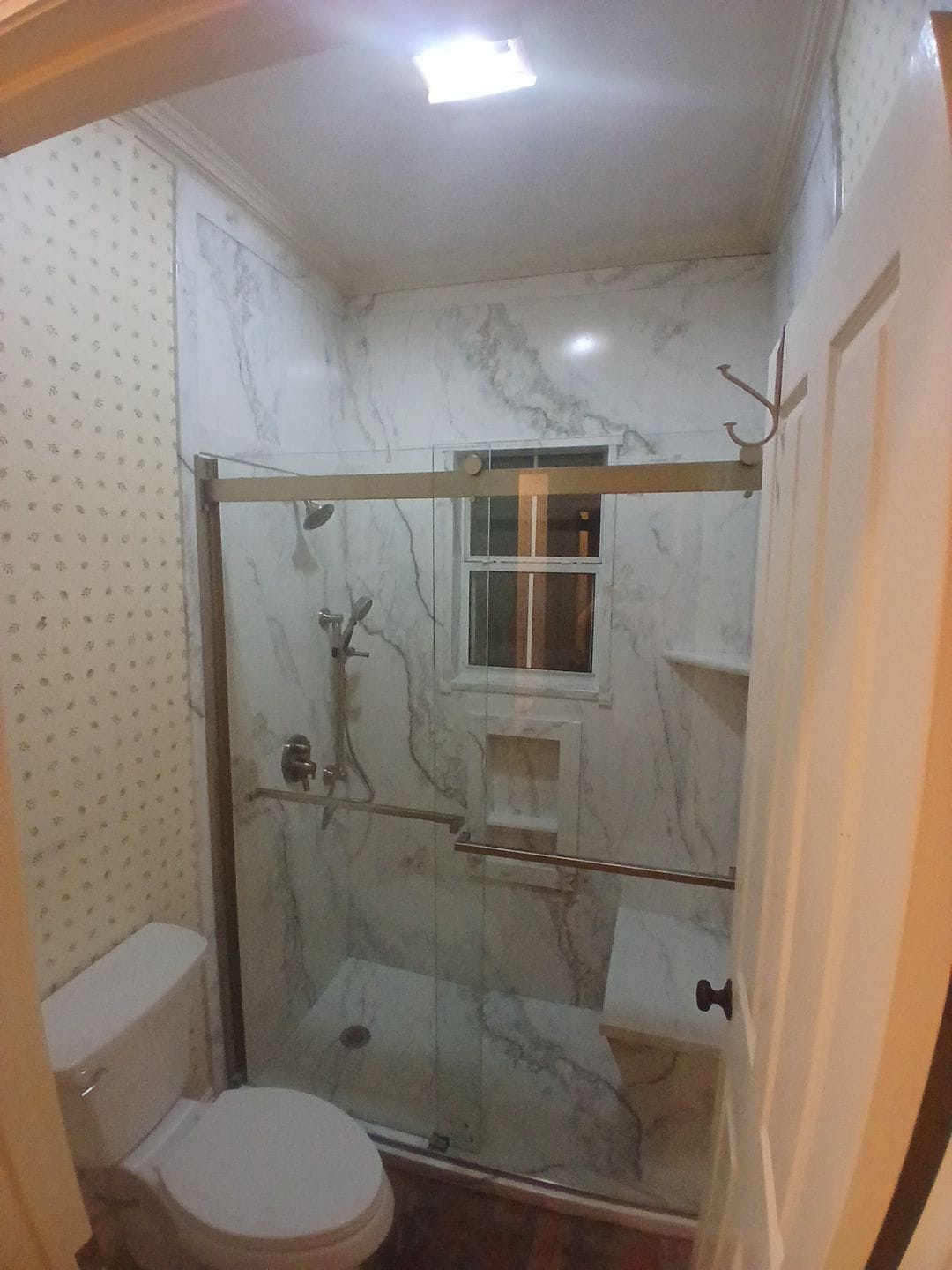 Installation included removal of all old components, repair and replacement of surrounding structure, and a complete rebuild using waterproof panels and a custom-built base. The after image confirms the remodeled space features a Triton composite wall system, three corner shelves, a built-in bench, and brushed nickel pull-out fixtures. Although a shower curtain was initially preferred, the final design includes a bypass glass door, which adds full enclosure while allowing light to pass through. A measure technician validated all placements prior to install, and the job was completed with full cleanup and final customer walkthrough.