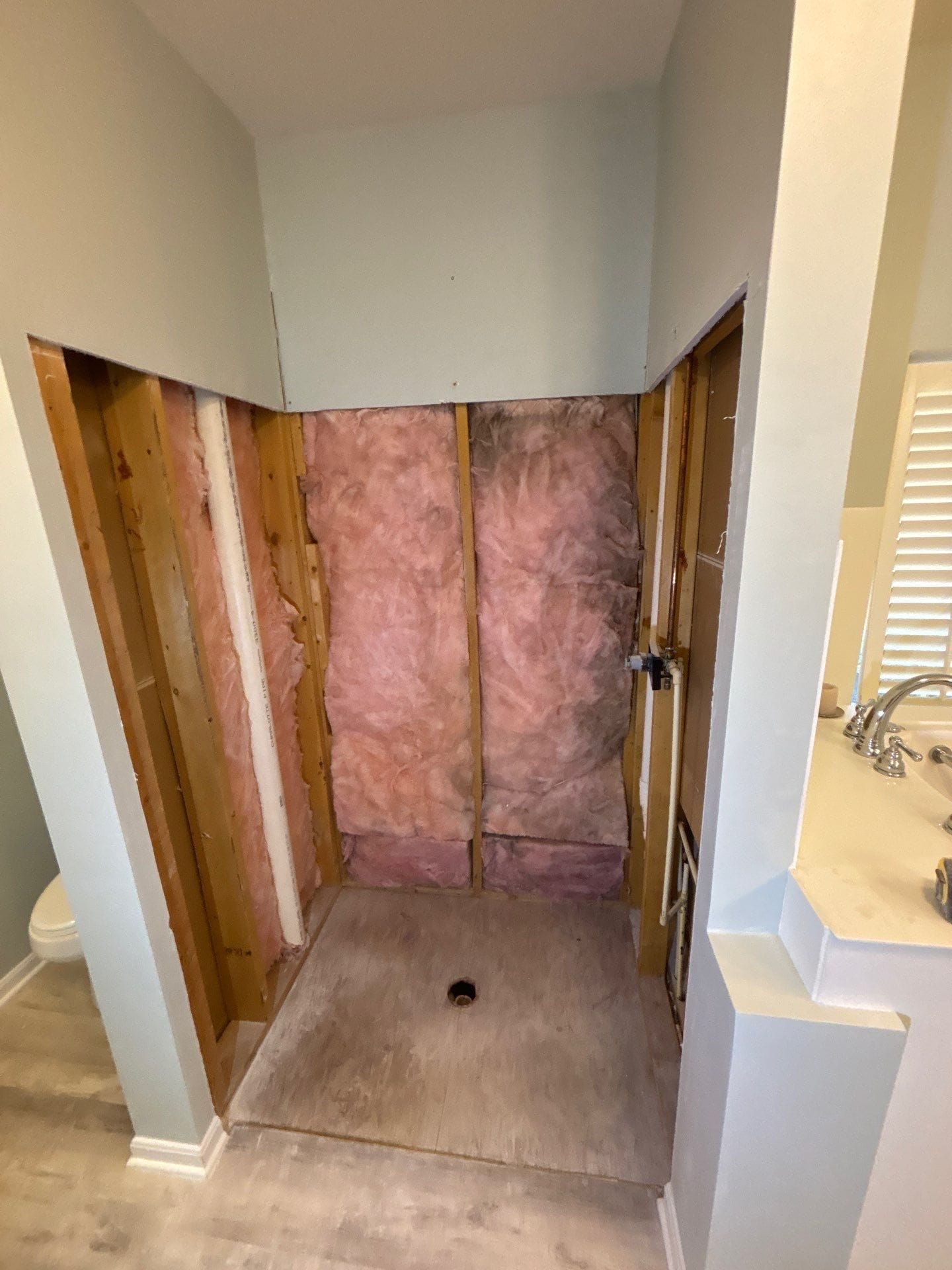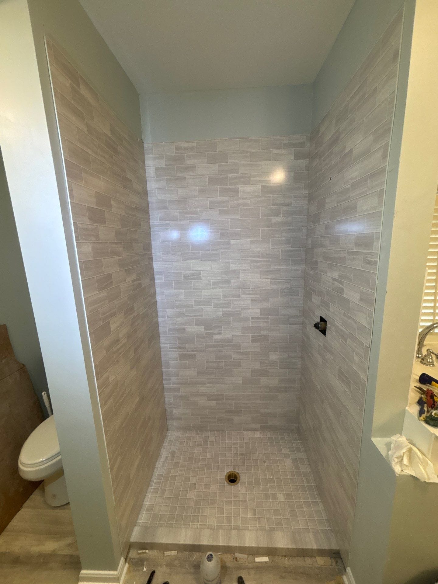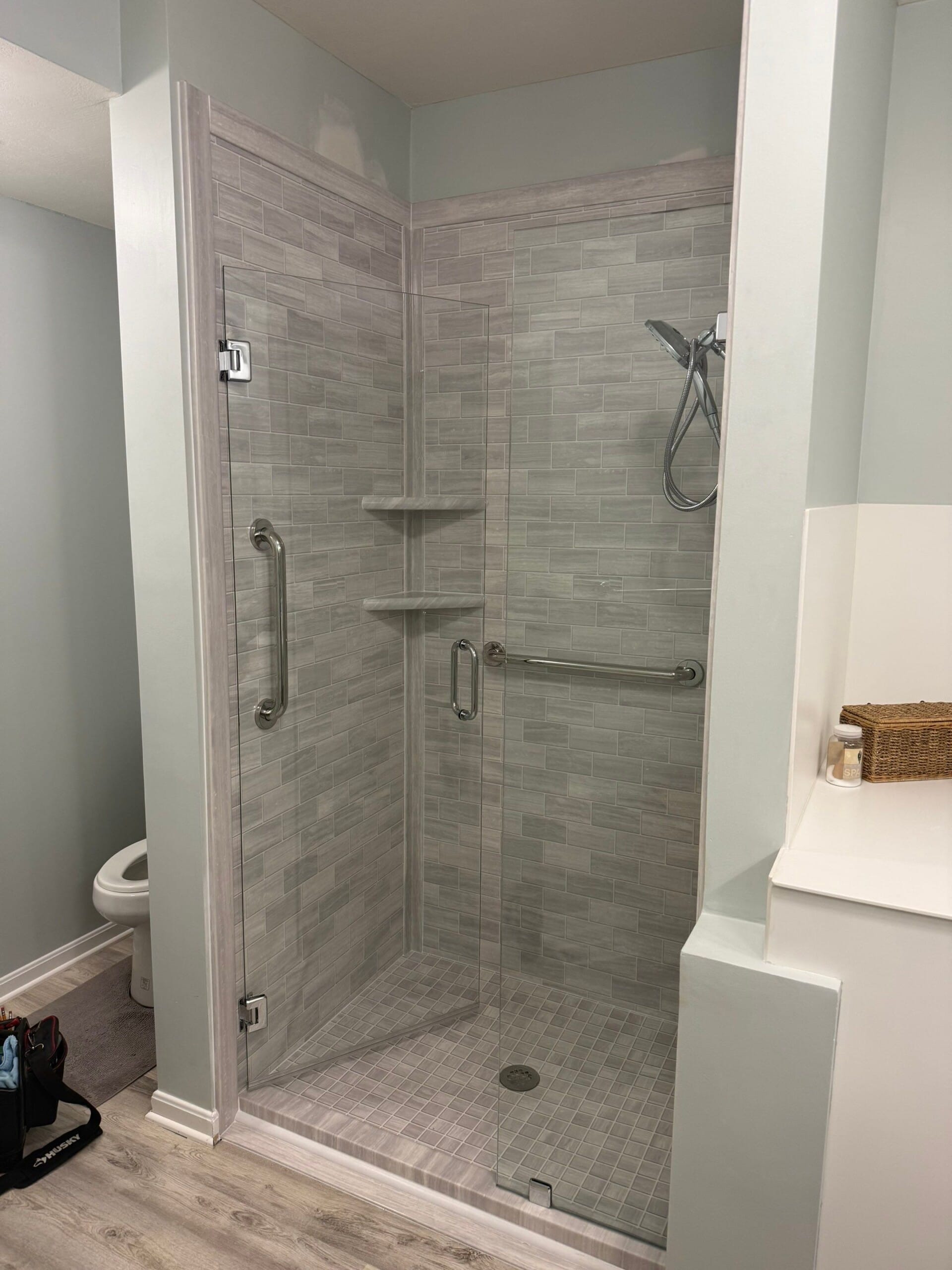 Installation included a full tear-out to the studs, moisture inspection, and no-cost mold remediation if needed. The old fiberglass enclosure was replaced with a walk-in shower featuring tile-look panels in a horizontal pattern with complementary corner shelves. A grab bar was installed for added safety, along with a chrome-finish handheld shower. The custom layout created a more open footprint while preserving privacy, and install time was completed within two days, followed by the standard 24-hour cure period.