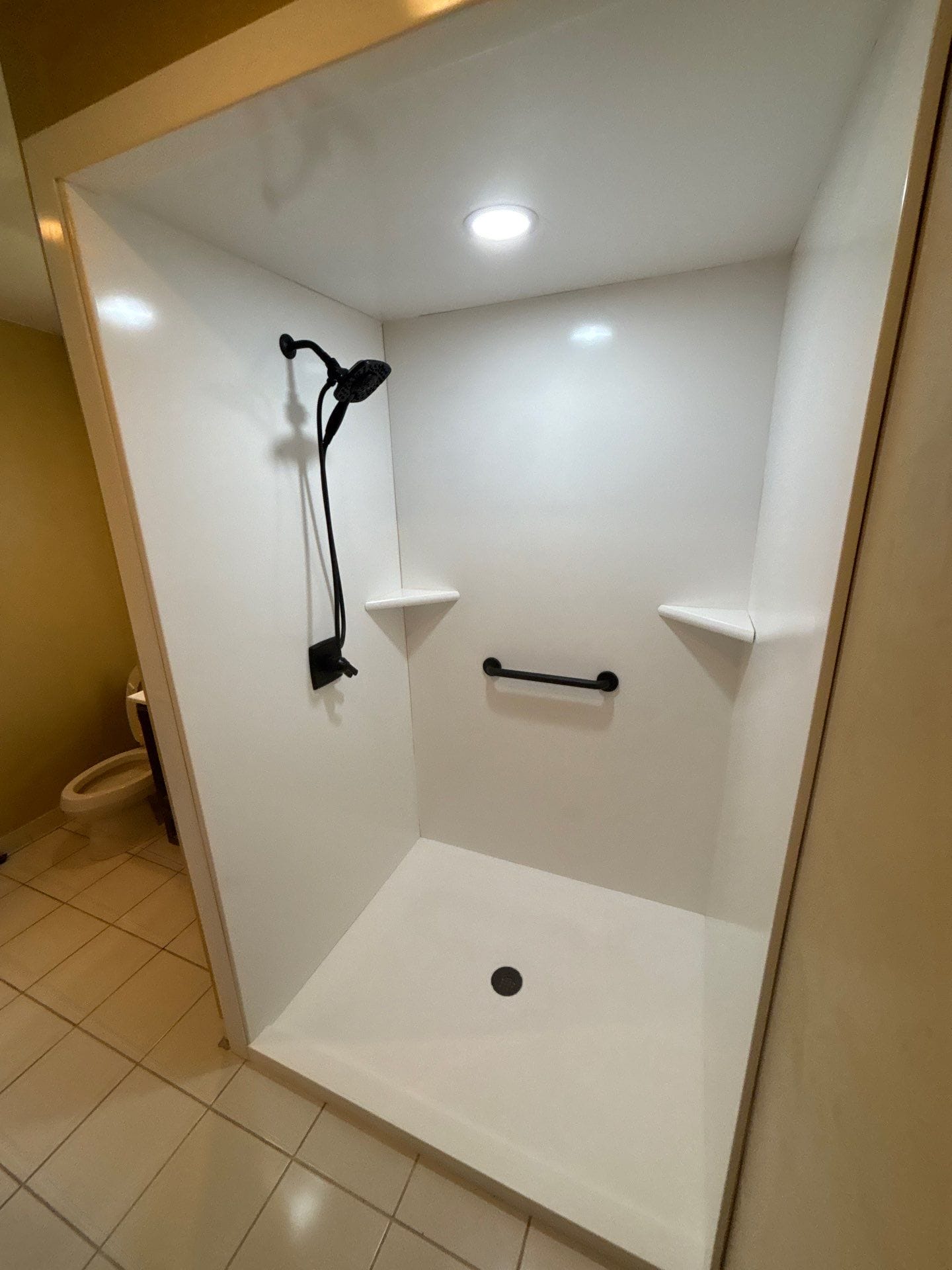 The installation process included full tear-down to studs, inspection for structural issues, and plumbing upgrades. All materials were custom-fit and installed by in-house certified crews over a two-day period. Corner shelf placement and fixture alignment were finalized during installation to match user preferences. Floor protection and debris removal were managed on-site. Layout modifications such as moving the toilet or drain lines were not required, and no general contracting coordination was needed on this project.