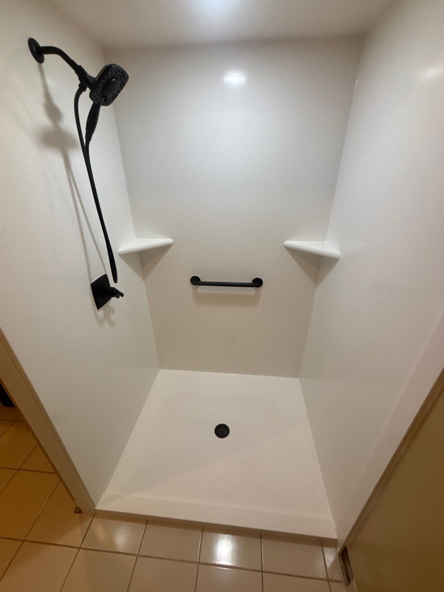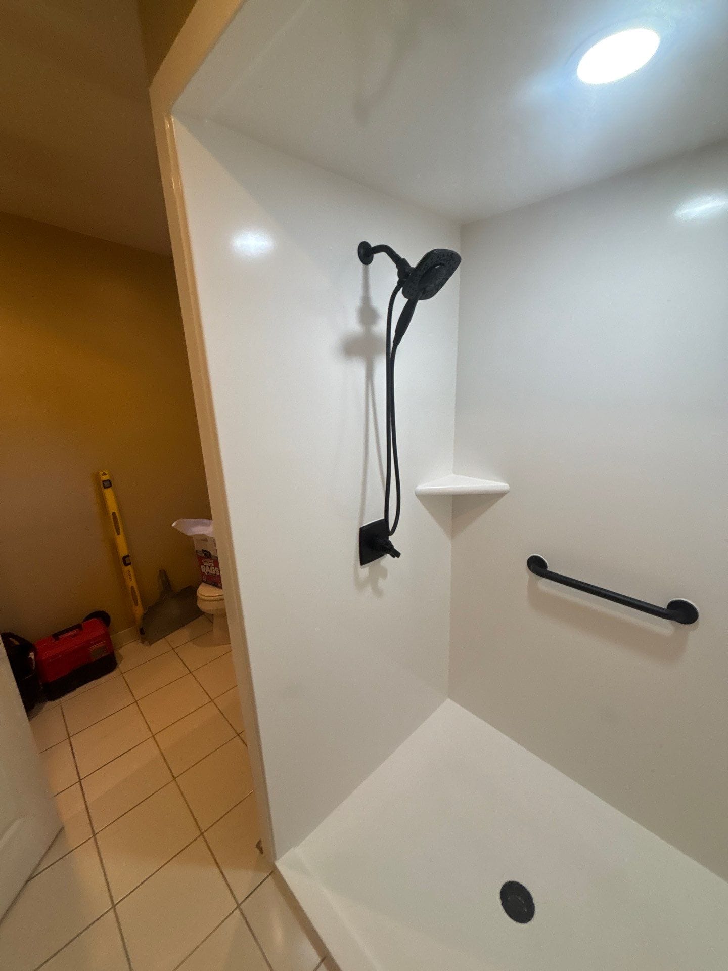 Zach Sterling recommended Five Star Bath Solutions’ Smart Choice package featuring a six-layer antimicrobial PVC composite wall system. The smooth white panels were selected for a clean, seamless appearance. Their non-porous and scratch-resistant surface mimics real stone while eliminating the need for grout, bleach, or heavy maintenance. The panels are manufactured to ceiling height and cut on site to minimize joints, supported by a waterproof Hydro Block backer board that prevents mold growth. Matte black Delta fixtures with handheld spray and adjustable arm were chosen to enhance functionality and visual contrast.