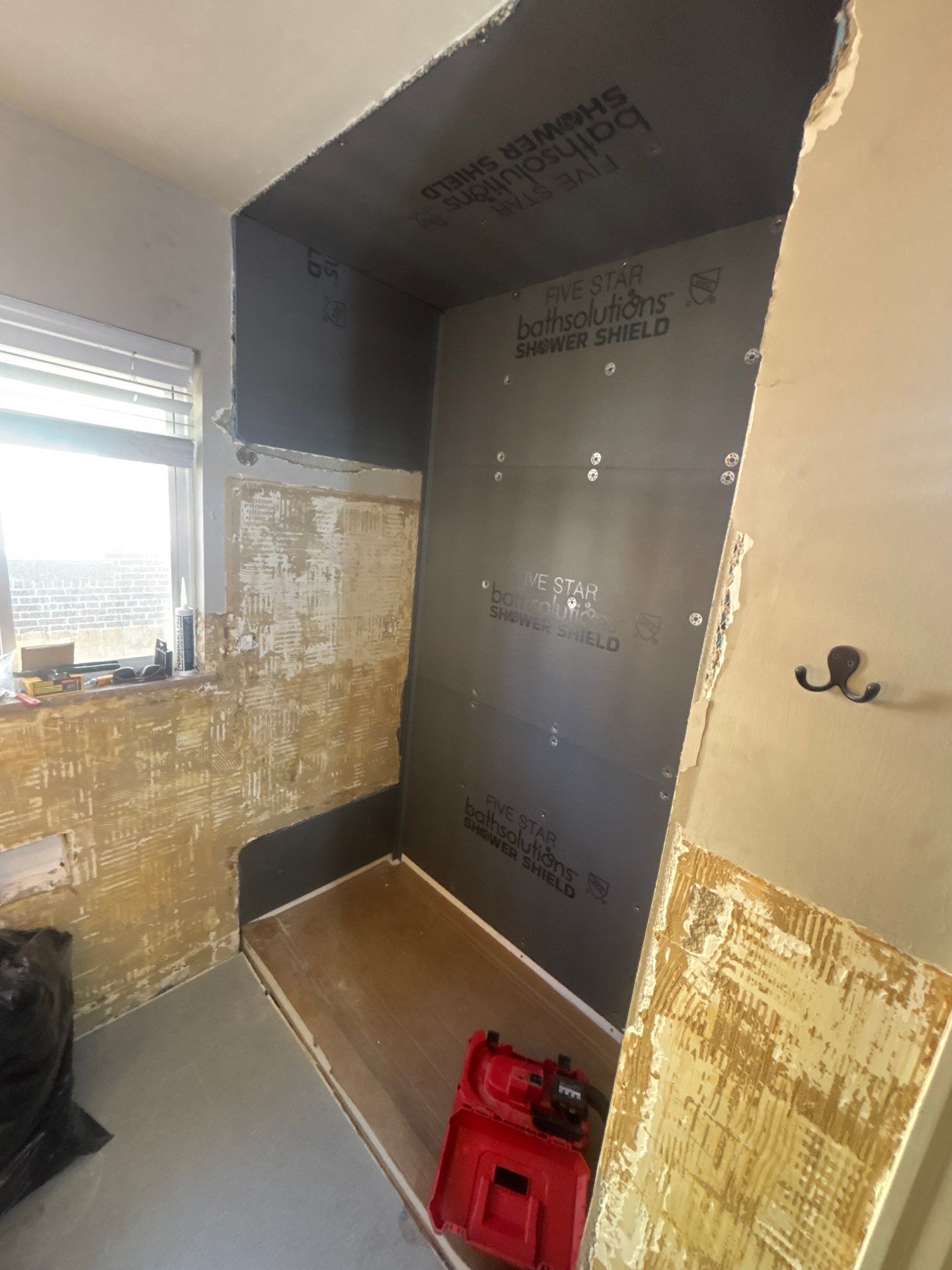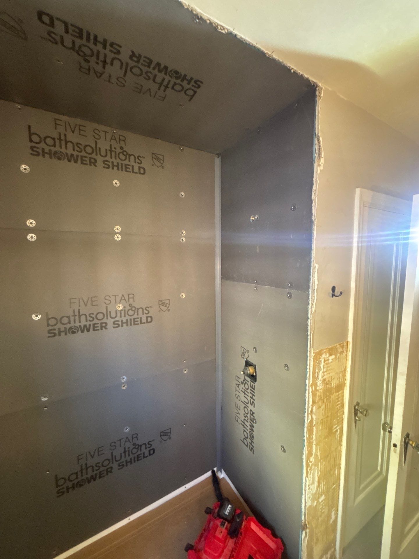 Installation was led by JC, a certified trainer and regional contractor, and performed by Five Star’s in-house team. Demo included full tear-out to the studs, removal of all outdated components, plumbing replacement, and debris hauling. Protective measures were used to shield surrounding areas. If a glass enclosure were selected, the design allowed for temporary curtain use until custom glass fabrication was completed.