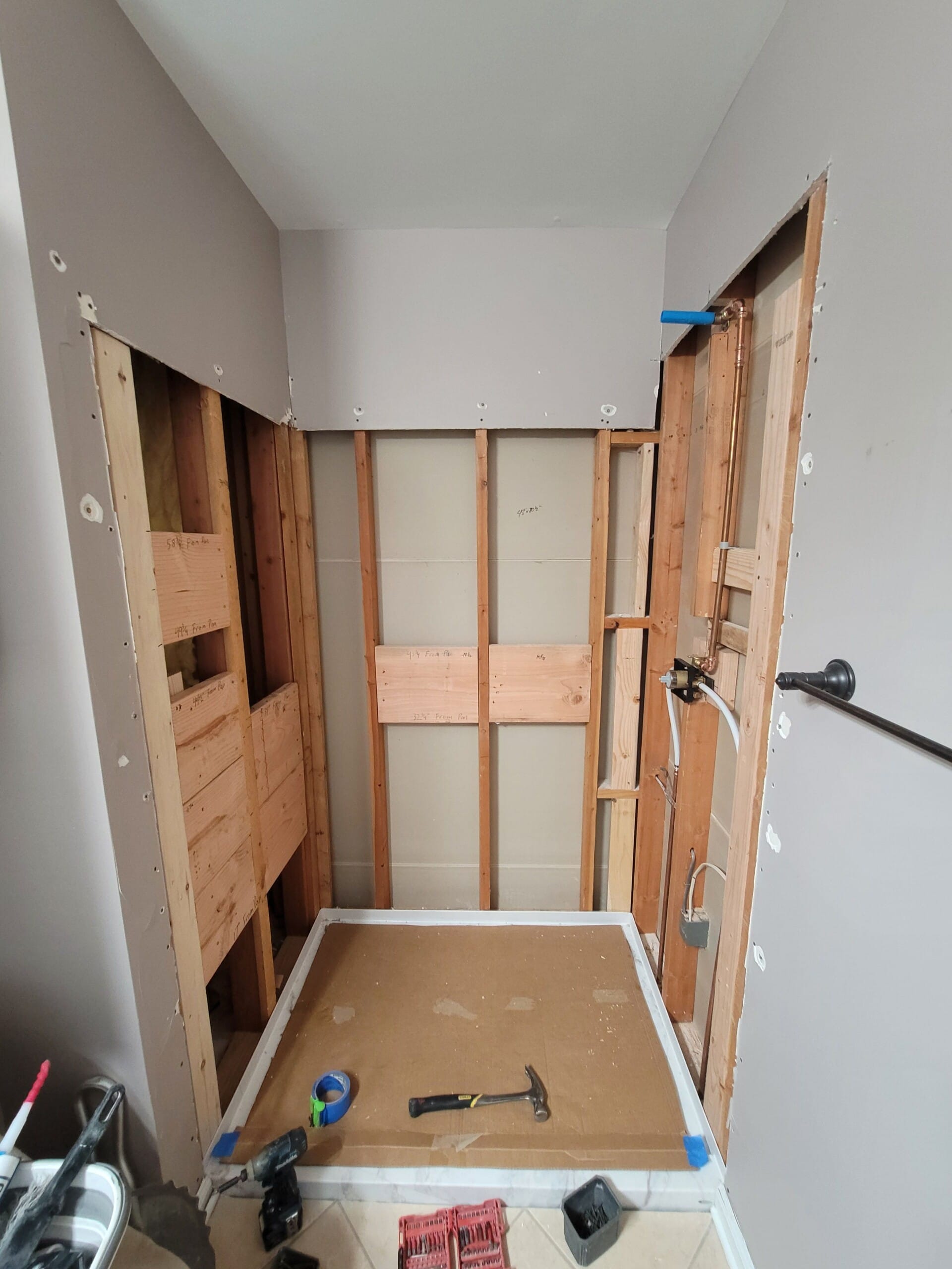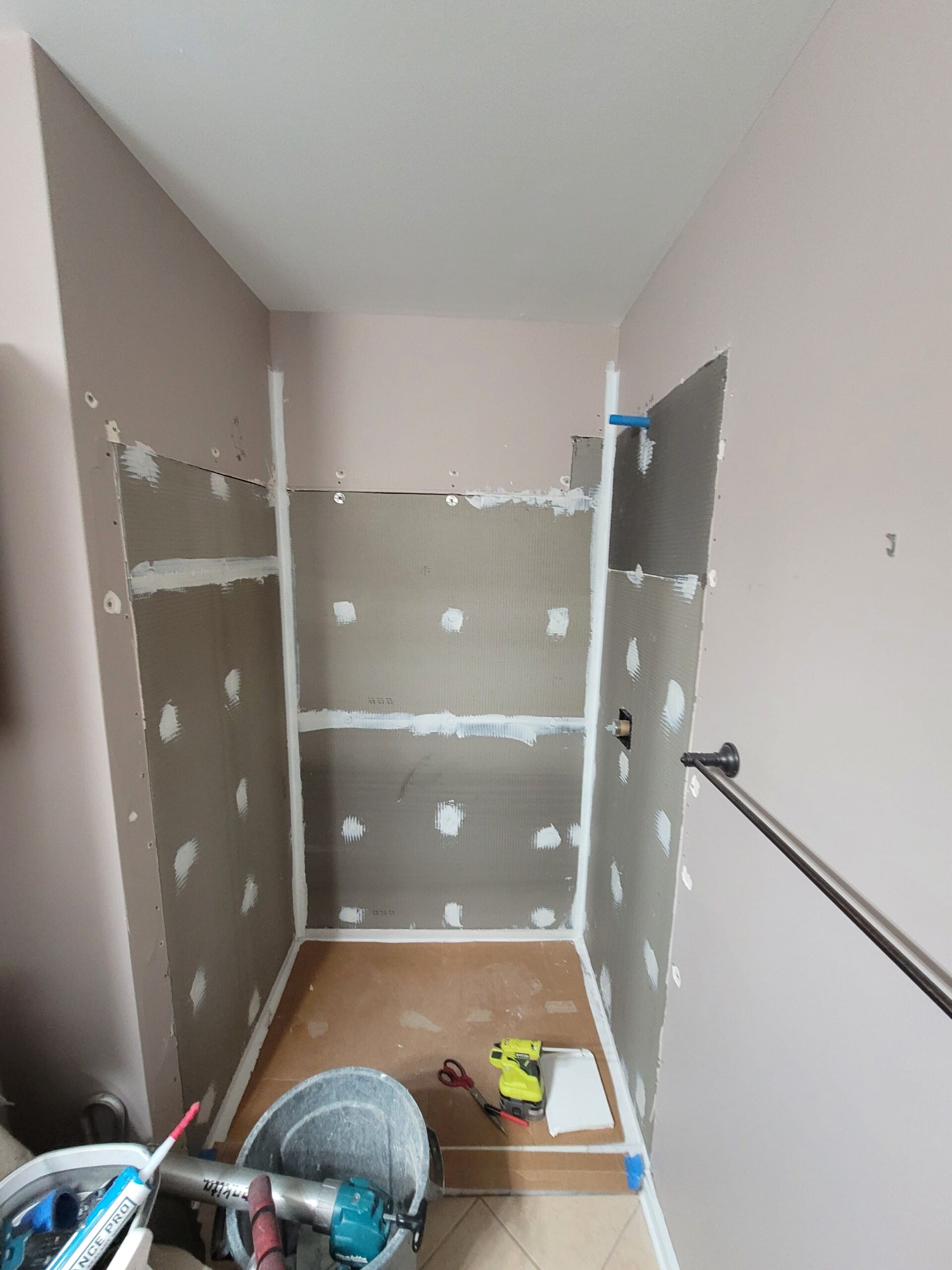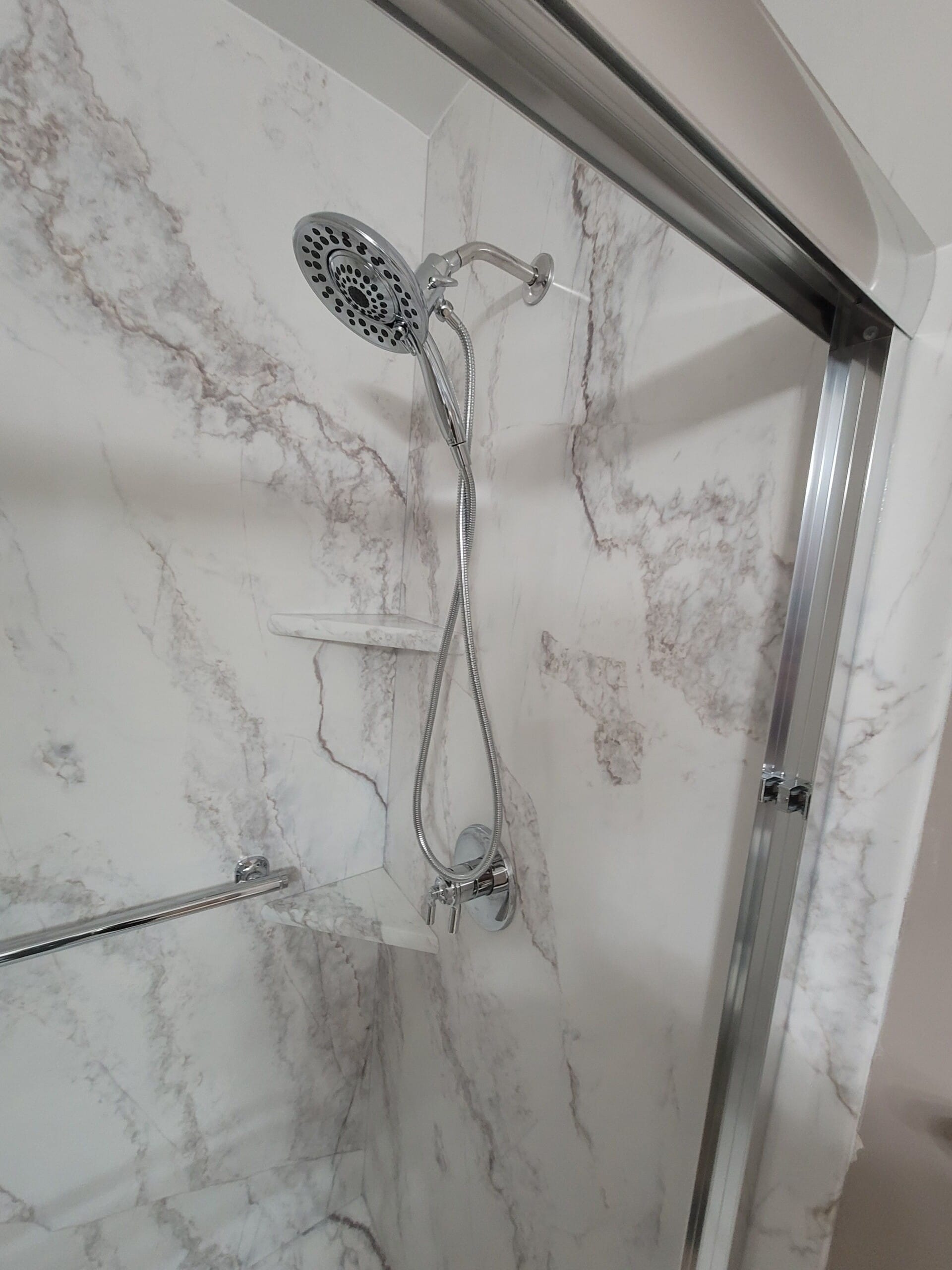 Installation began with complete removal of the existing shower enclosure and base. The area was waterproofed with ShowerShield backer board before setting the new composite walls and base system. New Delta Premium fixtures were installed along with dual grab bars at both standing and seated heights. A corner shelf was placed within easy reach of the showerhead. The process followed a defined project timeline, with final delivery and installation taking place within two to three days after material lead time. Throughout the process, the team ensured all surrounding surfaces were protected and that the work zone remained clean.