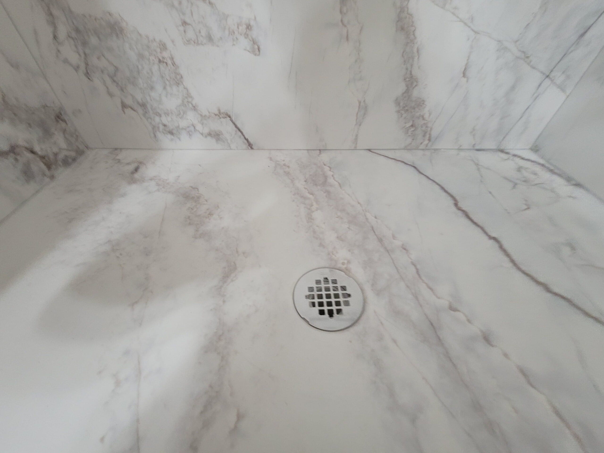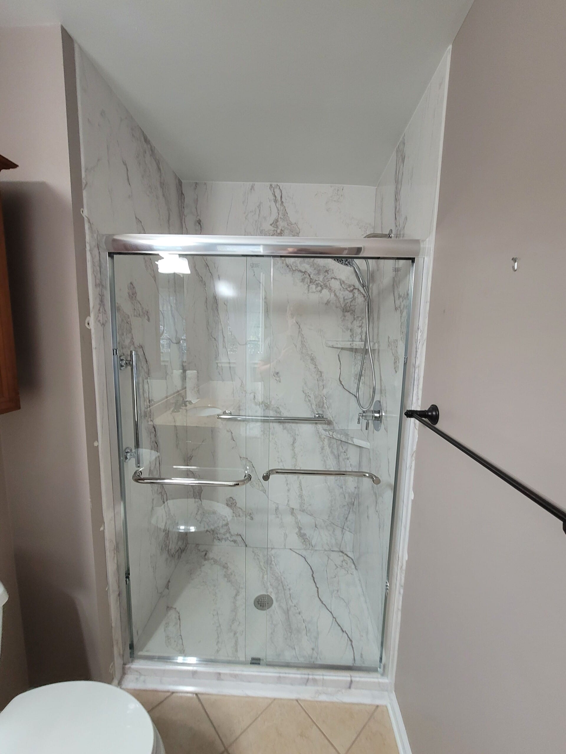 A Five Star Bath Solutions representative introduced the Smart Choice composite system, showcasing its durability, scratch resistance, and easy-clean finish. To meet the customer’s desire for a clean, bright aesthetic, the representative recommended a white marble-look composite wall paneling, paired with clear sliding glass doors and brushed nickel hardware. Multiple grab bars were added for enhanced support, along with a corner shelf for efficient use of space. The new wall system, exclusive to Five Star Bath Solutions, is grout-free and antimicrobial, designed to resist moisture, mold, and common surface buildup—making it ideal for long-term basement use.