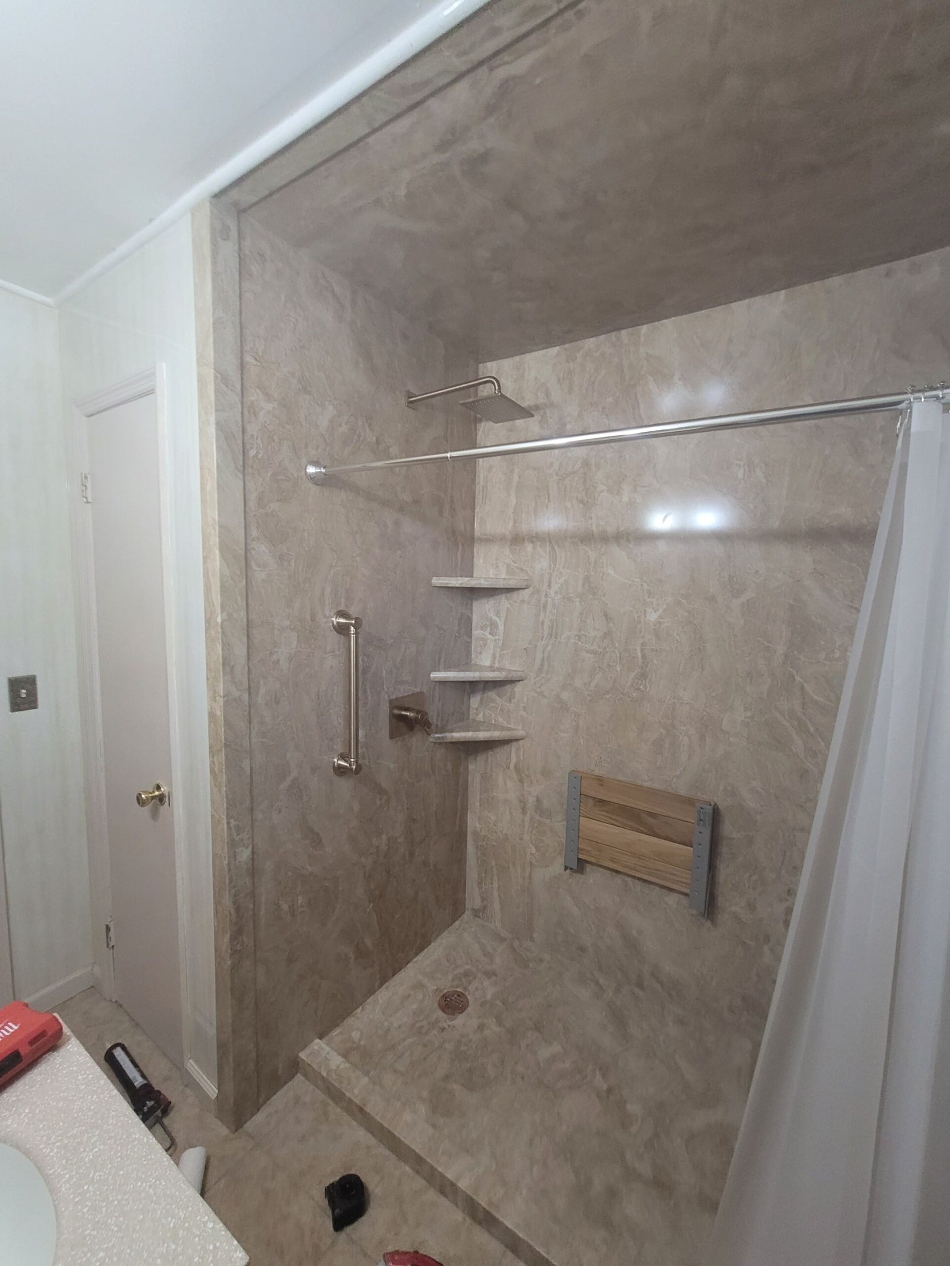 The remodel features stone-look Smart Choice composite panels in a warm, neutral tone extending from floor to ceiling, including the ceiling itself. The panels are grout-free and matte-finished for easy maintenance. A matching low-threshold shower base was installed in place of the tub, forming a cohesive visual surface. A ceiling-mounted square rainfall-style showerhead complements the updated space, paired with a wall-mounted magnetic wand. A teak folding bench was installed on the main wall, along with a safety grab bar and two angled corner shelves for storage and drainage efficiency.
