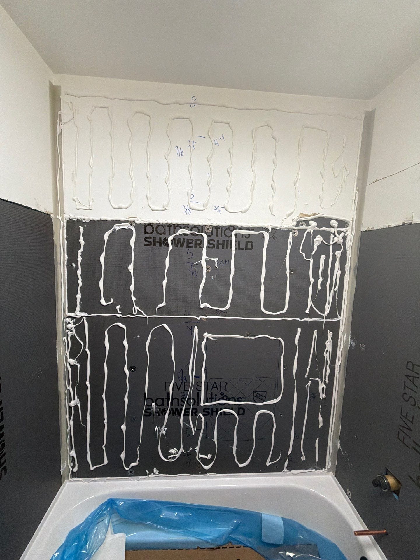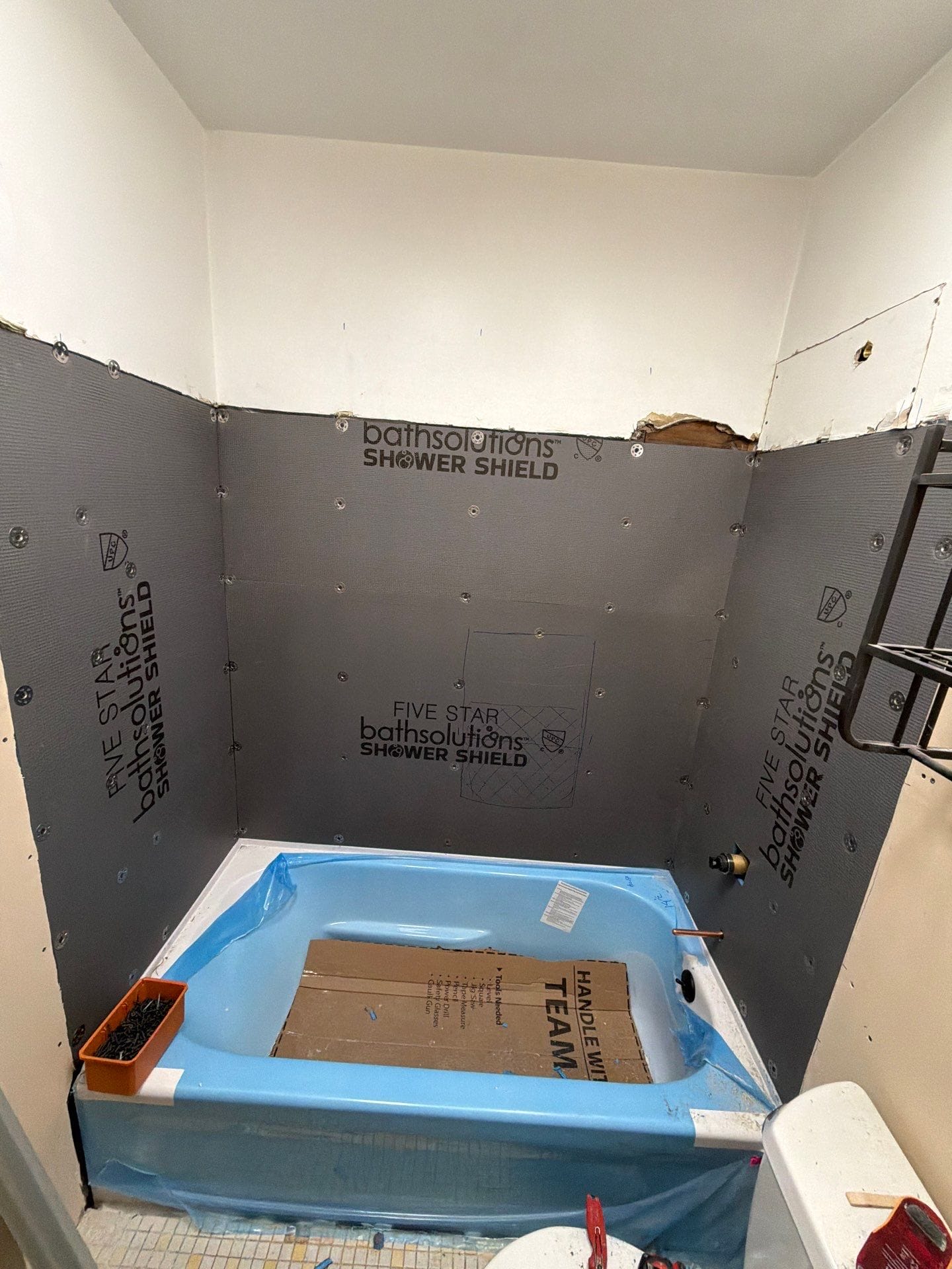 The remodel began with a full tear-out of the existing tub and tile down to the studs. The crew removed the cast iron tub, repaired any discovered moisture or framing issues, and installed a waterproof backer board system behind the new walls. The composite panels were precisely cut to fit the original footprint, and marine-grade silicone was applied to ensure a watertight finish without the need for future re-caulking. While this project focused on the main bath, Curtis outlined a clear plan for the follow-up remodel of the half bath, including potential wall modifications and plumbing extensions to accommodate a new shower. Materials were staged in advance, and the work was completed with oversight from both the lead installer and project manager.