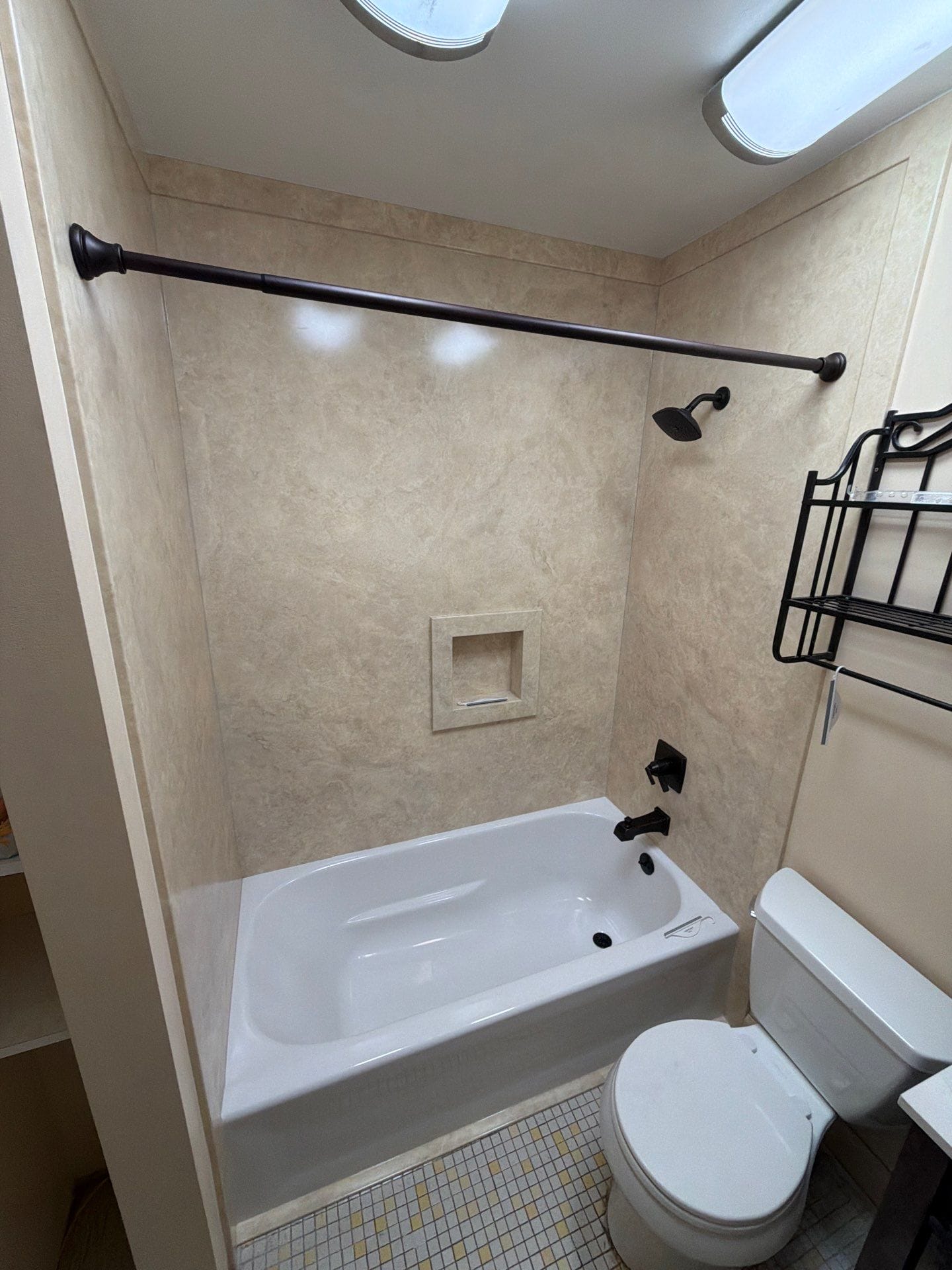The Five Star Bath Solutions representative introduced a solid-surface, grout-free wall system designed for both ease of maintenance and long-term durability. Unlike the previous yellow tile and cast iron tub setup, the new bath surround featured large-format, beige-toned composite wall panels with a subtle stone pattern, installed flush to the ceiling. A recessed niche was added for accessible storage. Fixtures were upgraded to matte black finishes for visual contrast and function, and the new tub was installed with ergonomic design and improved safety. The company’s commitment to background-checked, factory-trained installers and its high satisfaction ratings reinforced confidence in both service quality and product longevity.